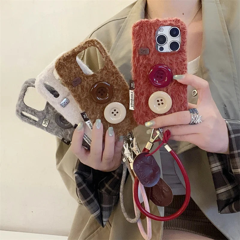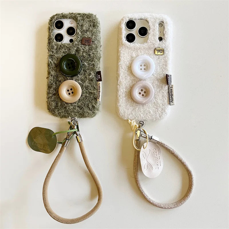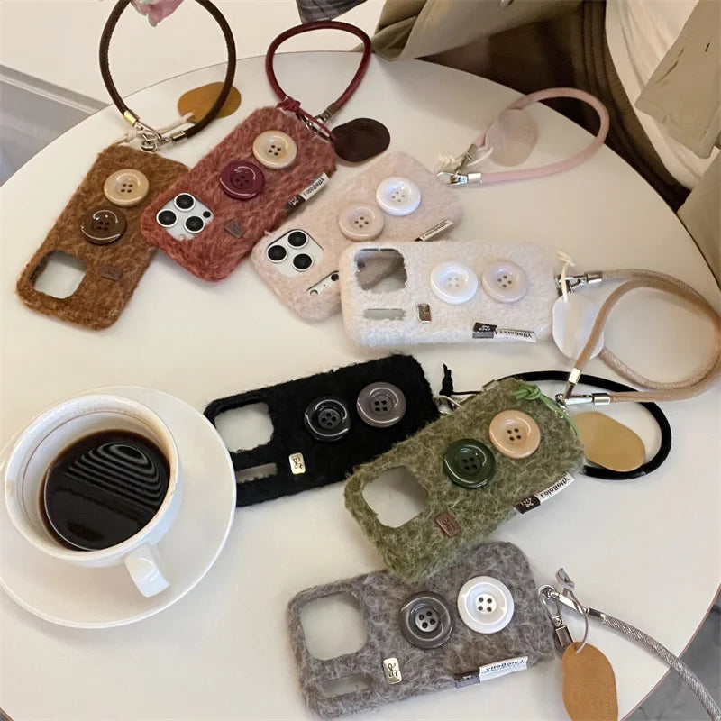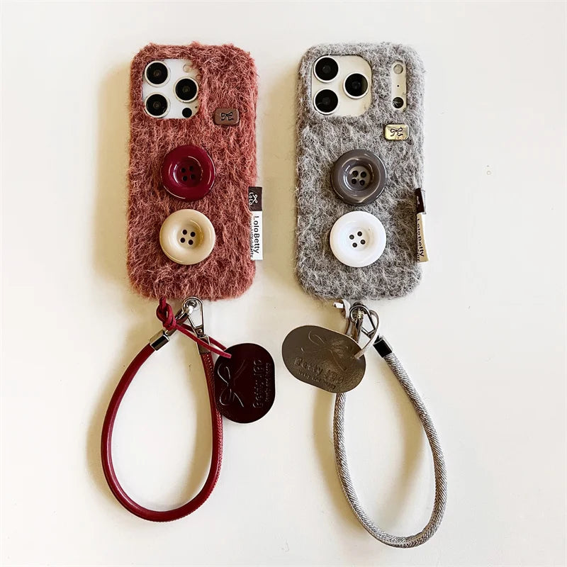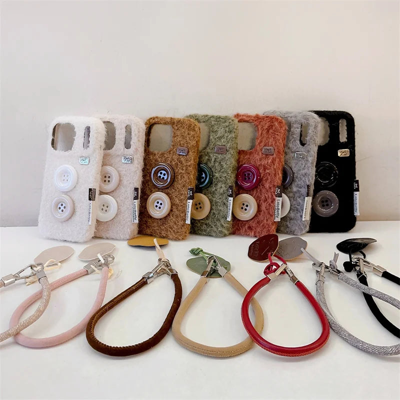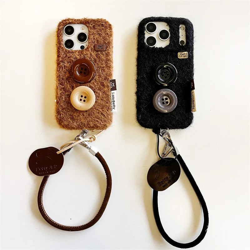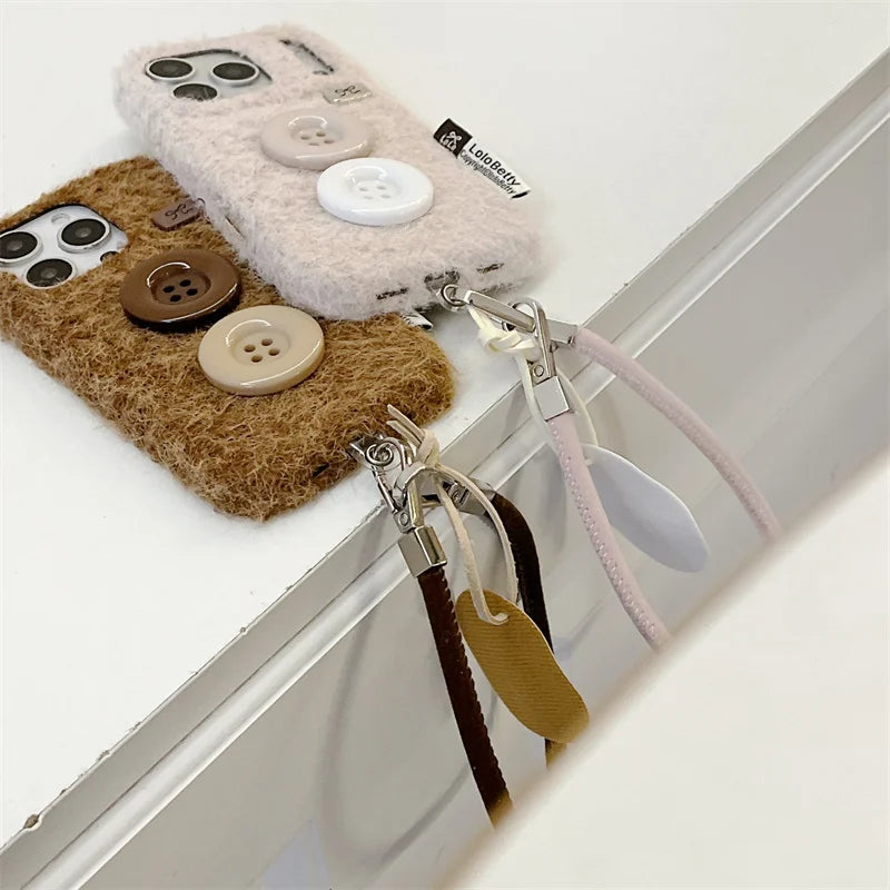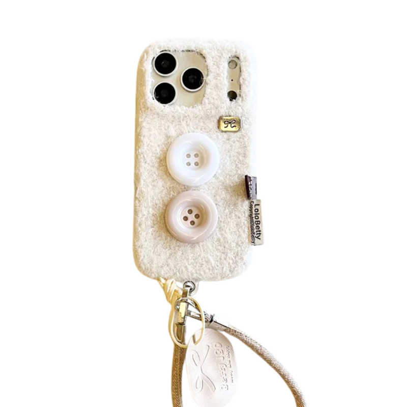 【もこもこファーボタン】レザー風 ストラップ スマホケース|iPhone対応 #250202