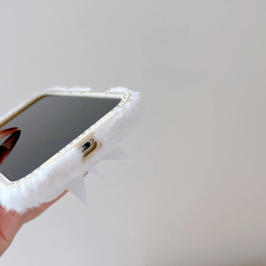 もこもこ素材のストラップ付きで、持ち歩きやすく落下防止にも◎。