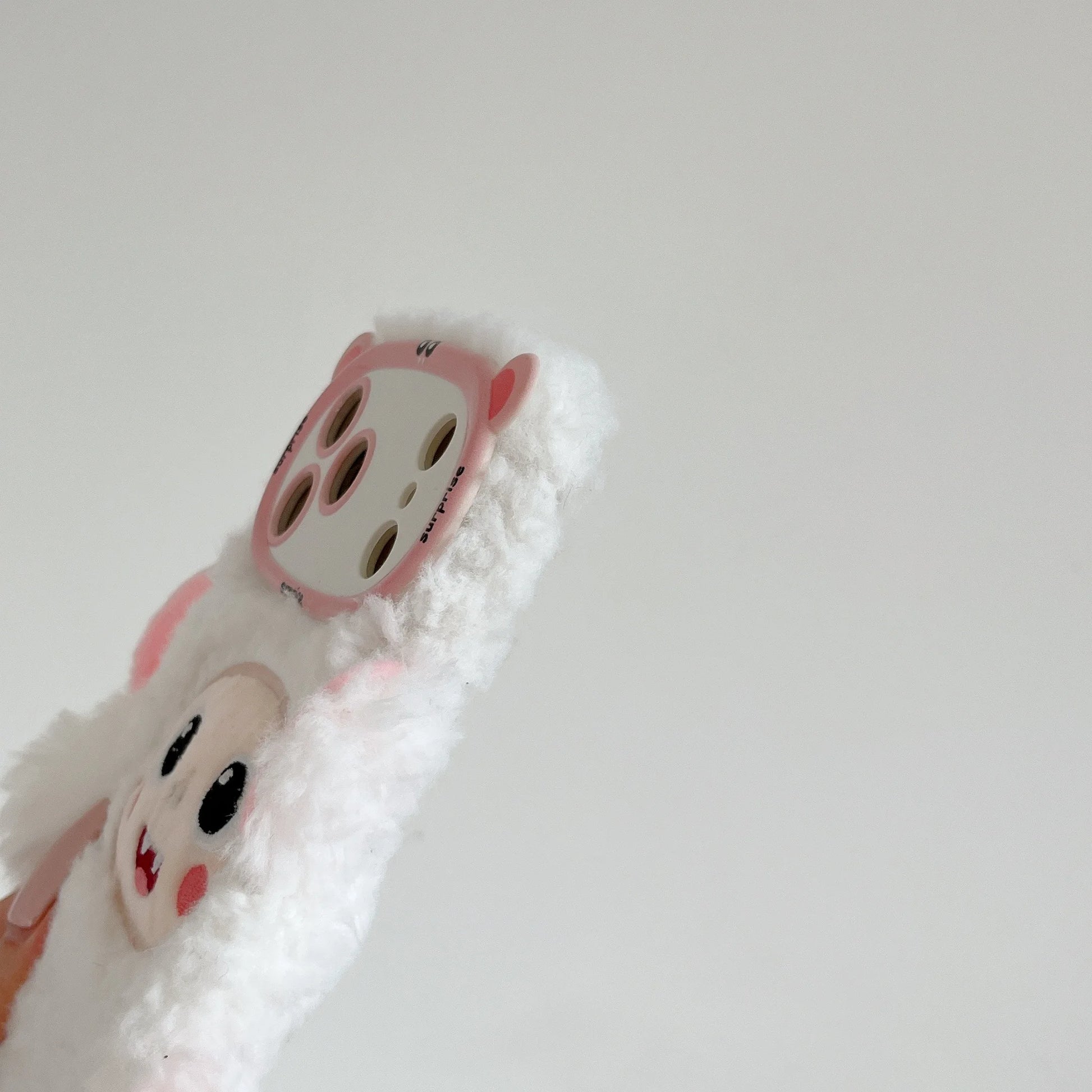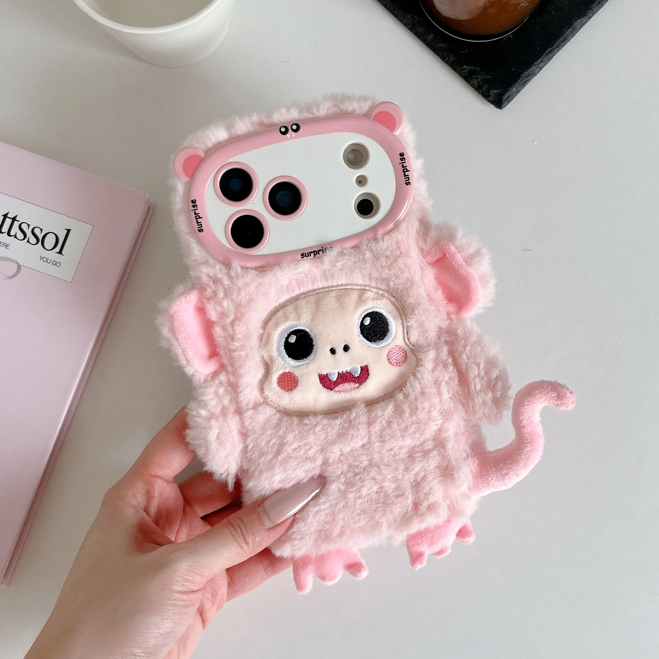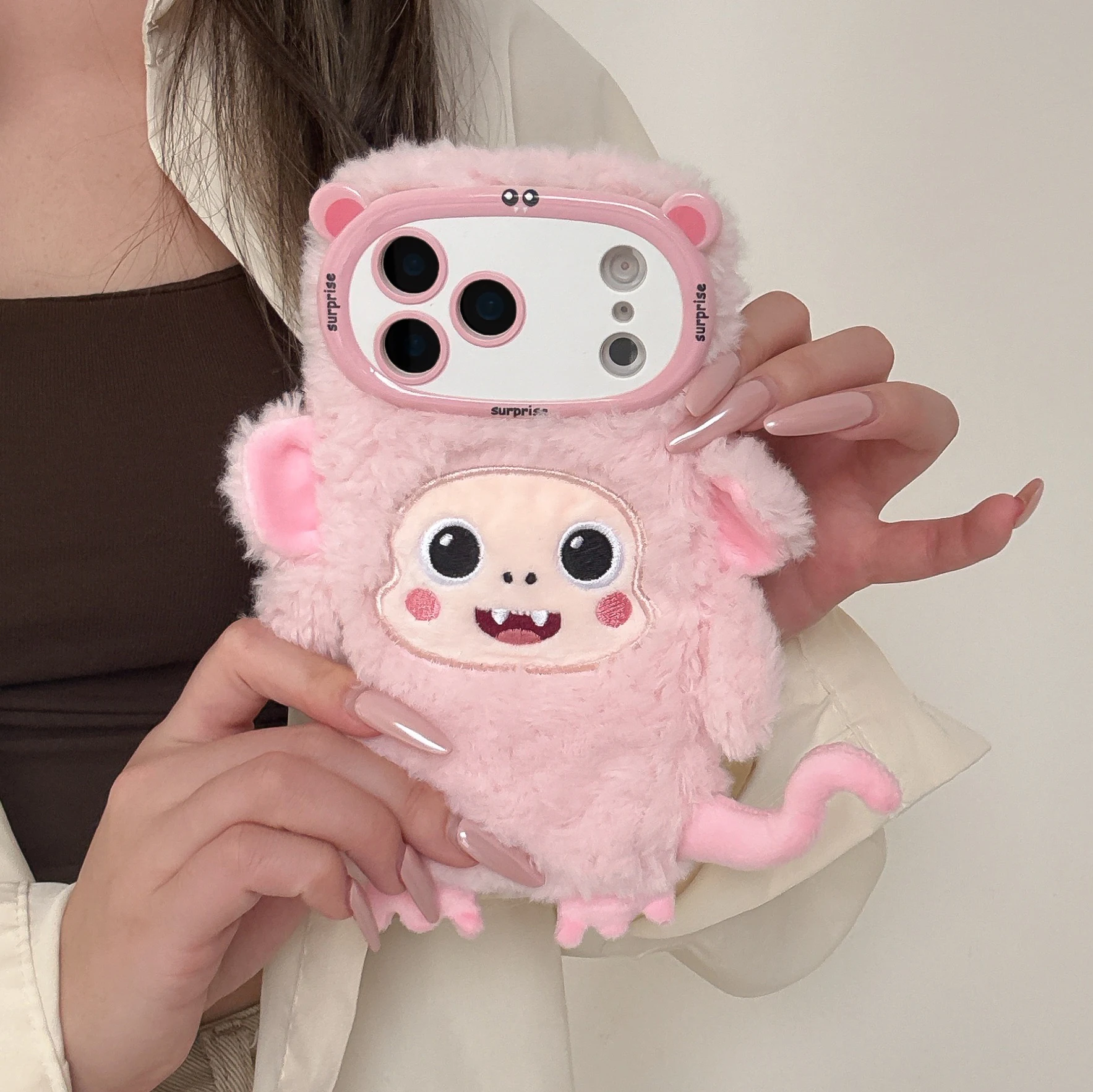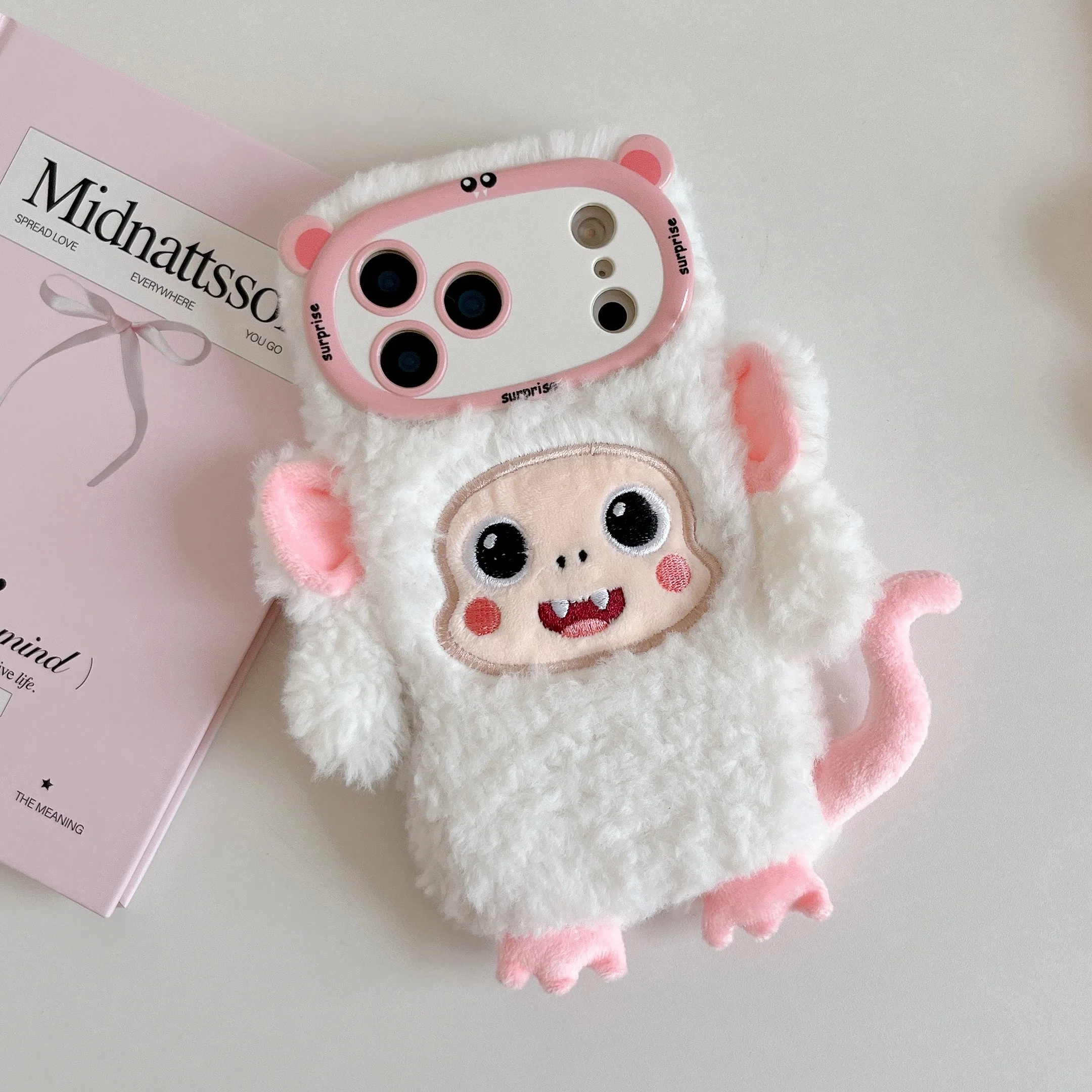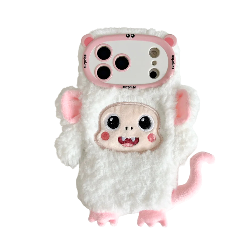 【アニマルフェイスシリーズ】ピンク&ホワイト モンキー スマホケース|ふわもこ立体デザイン × 尻尾付き|iPhone対応 #241129
