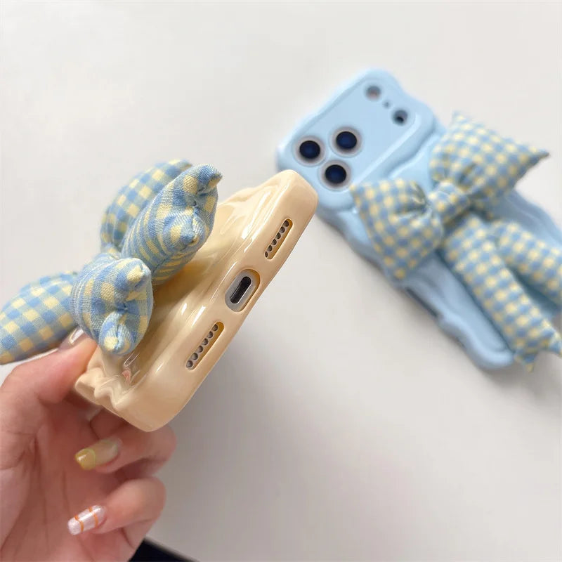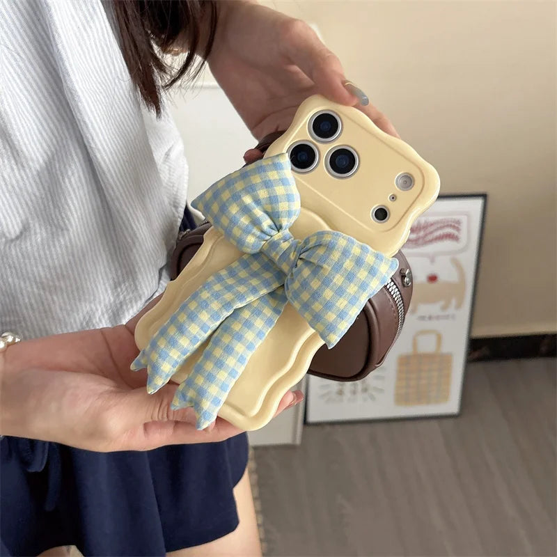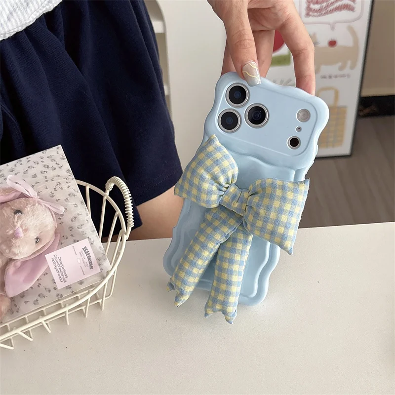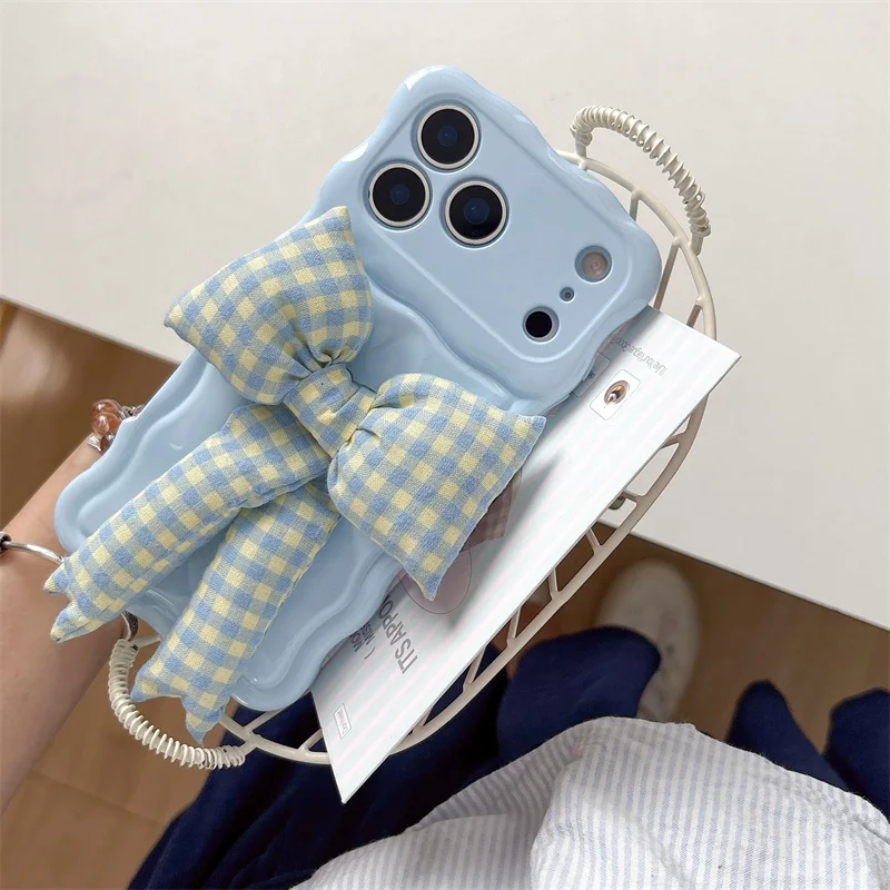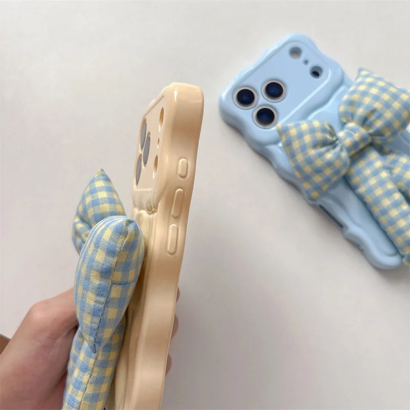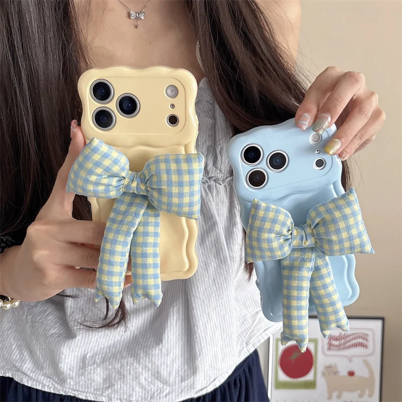 【ウェーブフレーム】ぷっくり 立体 ギンガムチェックリボン スマホケース|iPhone対応 #241230