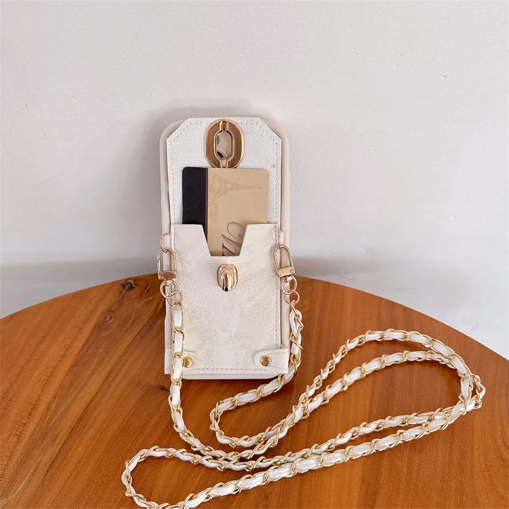 エレガントなチェーンストラップとミニポーチが付いたスマホケース。