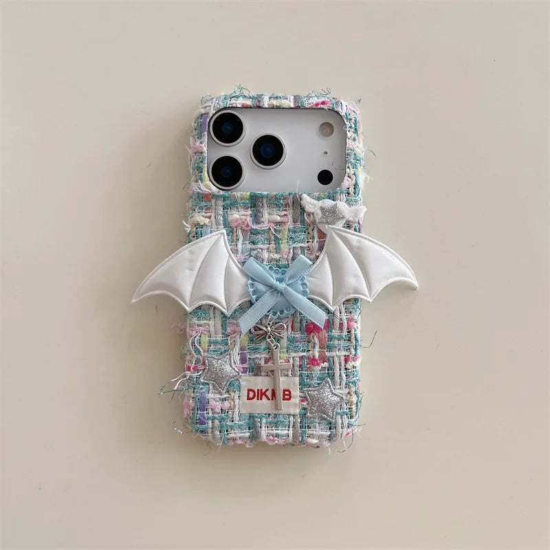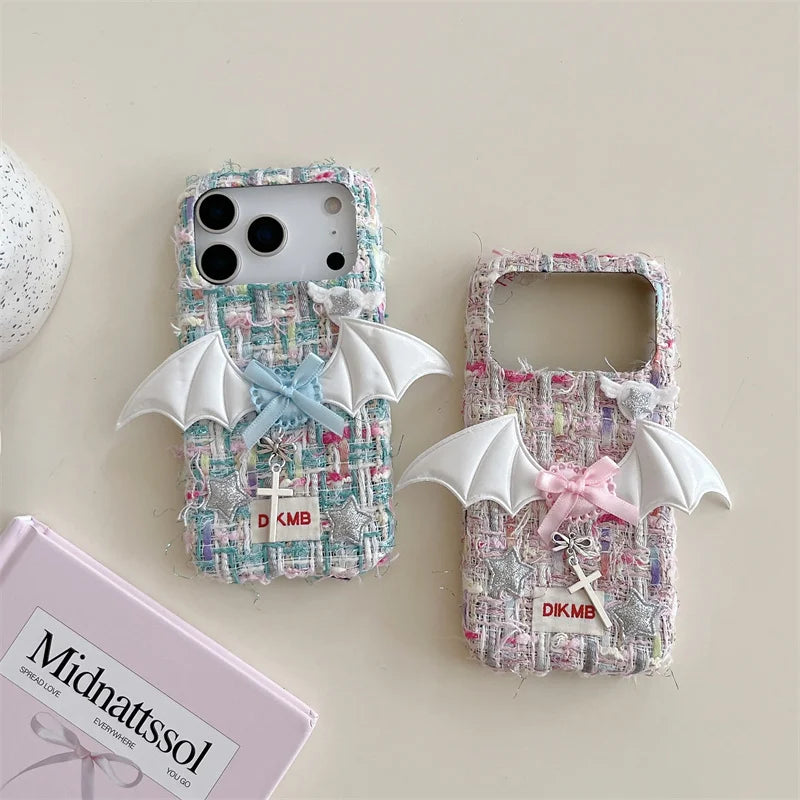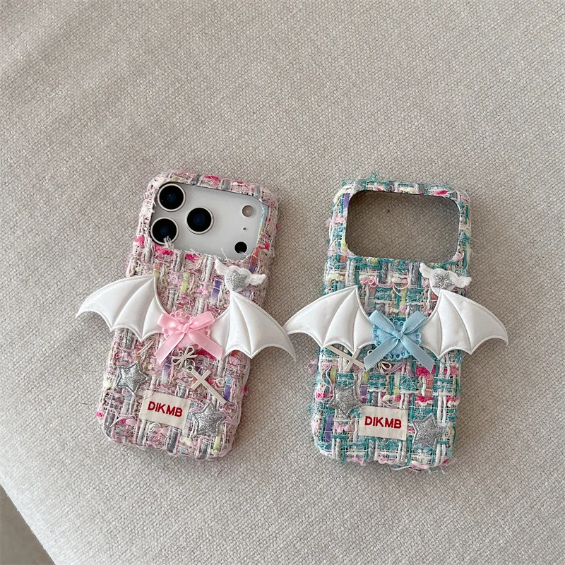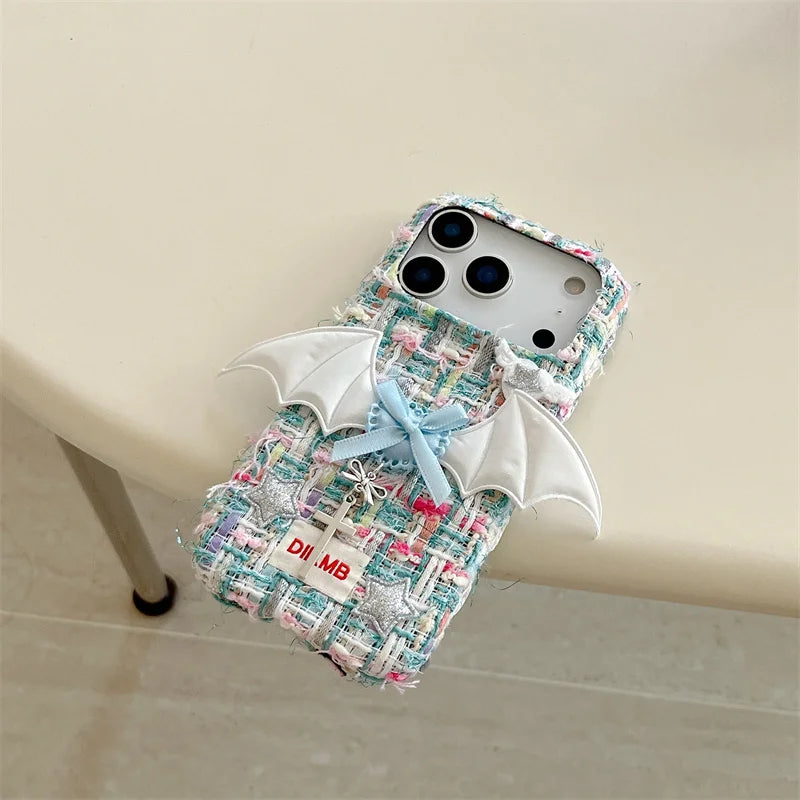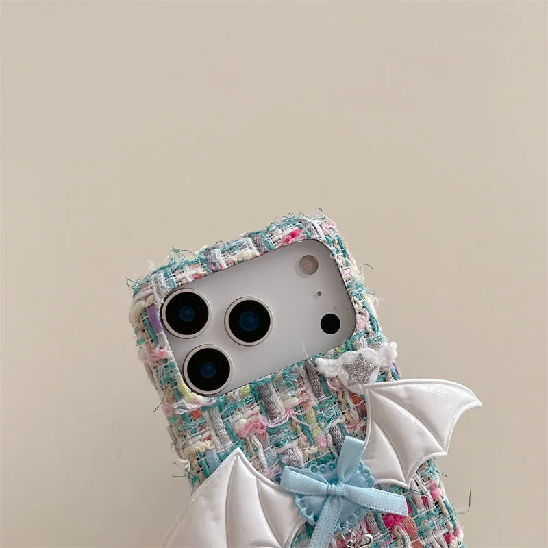 カラフルなツイード素材に、立体的なバットウィングとリボンをあしらった個性派スマホケース。