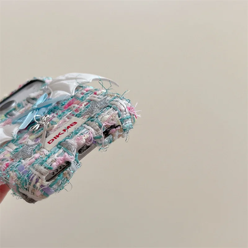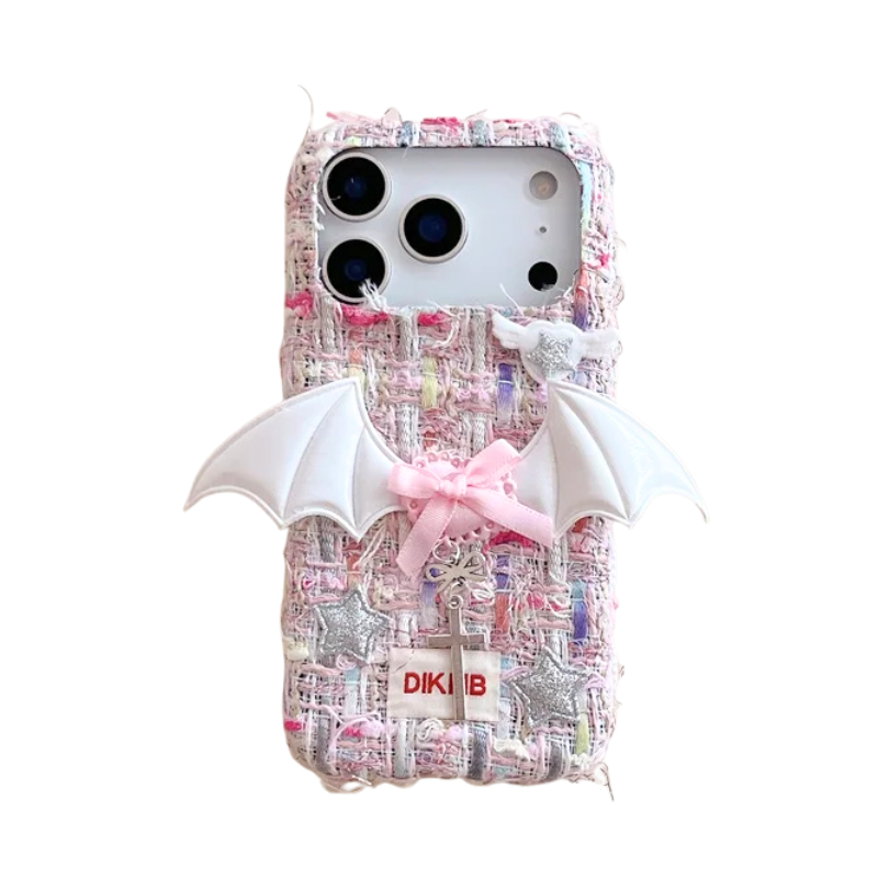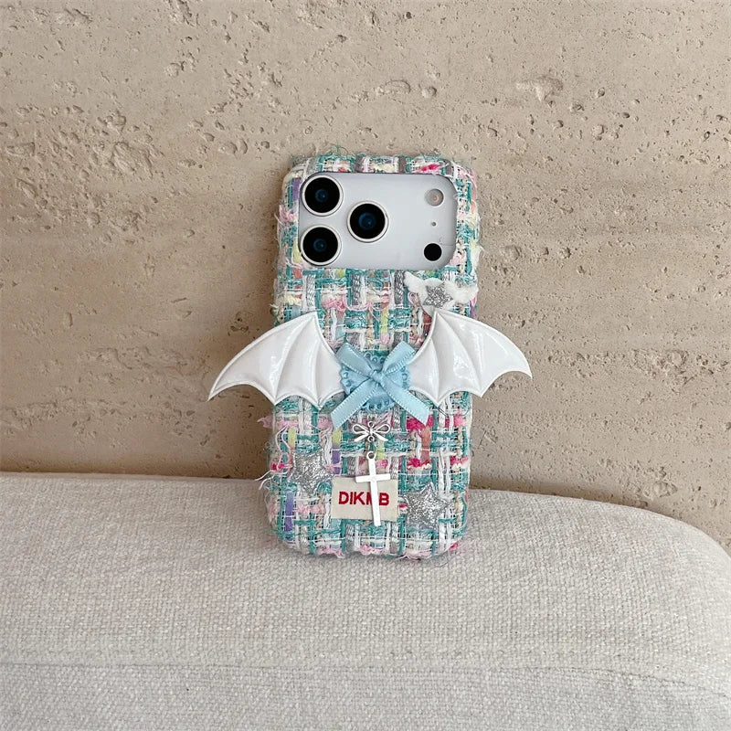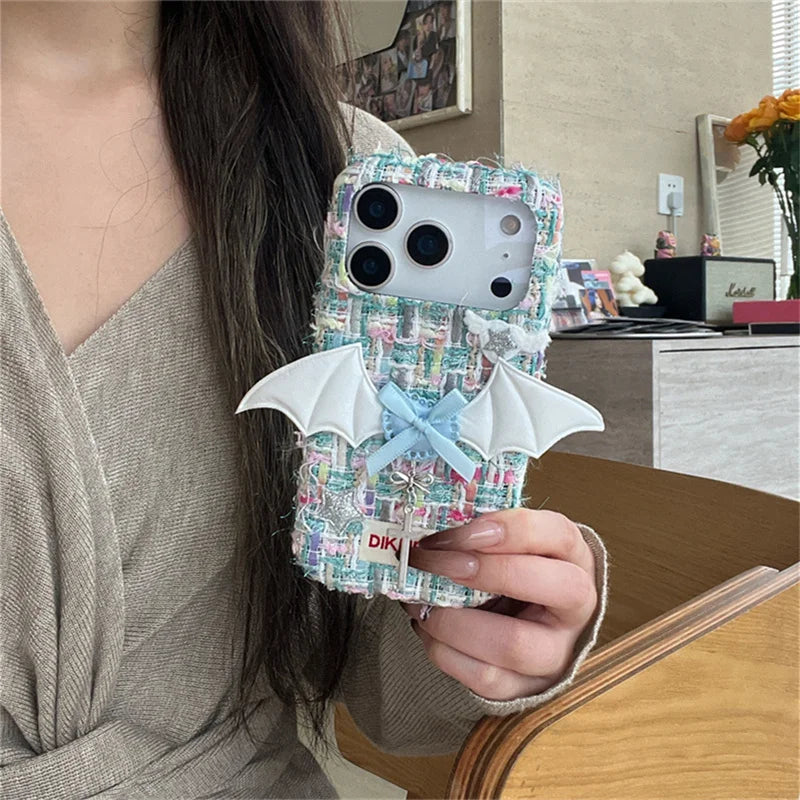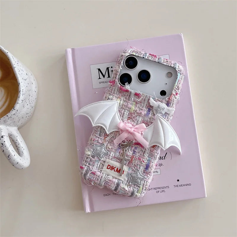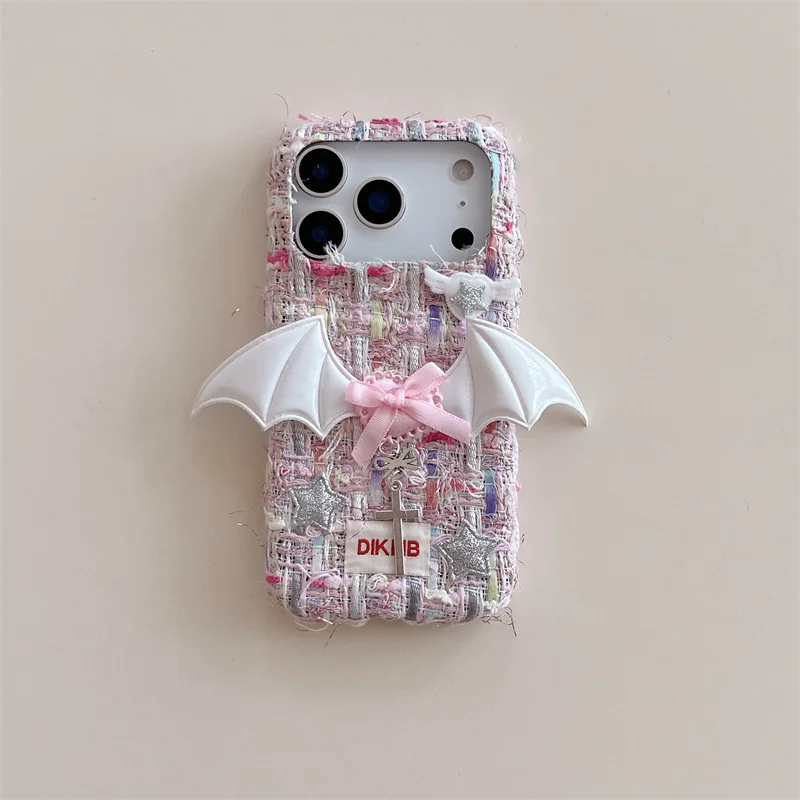 カラフルなツイード素材に、立体的なバットウィングとリボンをあしらった個性派スマホケース。