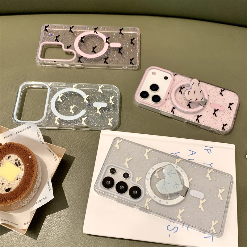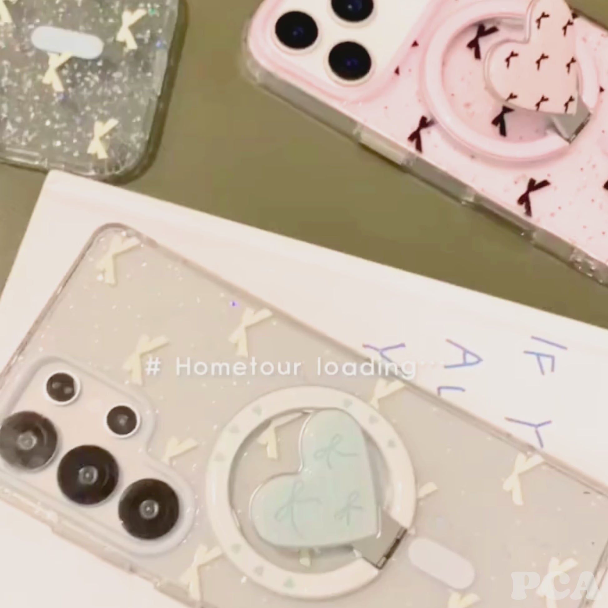 【ハートリングスタンド】Magsafe対応 ハート型 スタンド付き グリッター×リボン柄 スマホケース|iPhone対応 #250310