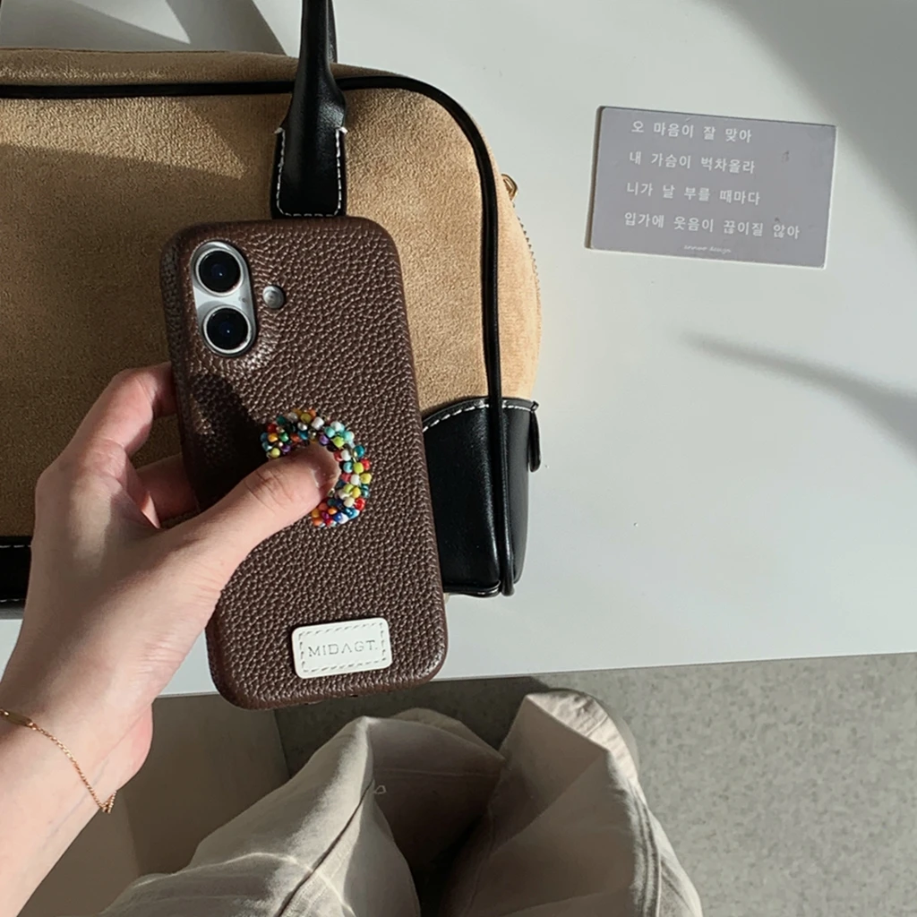 上品なレザー調デザインに、カラフルなビーズリングを組み合わせた個性派スマホケース。