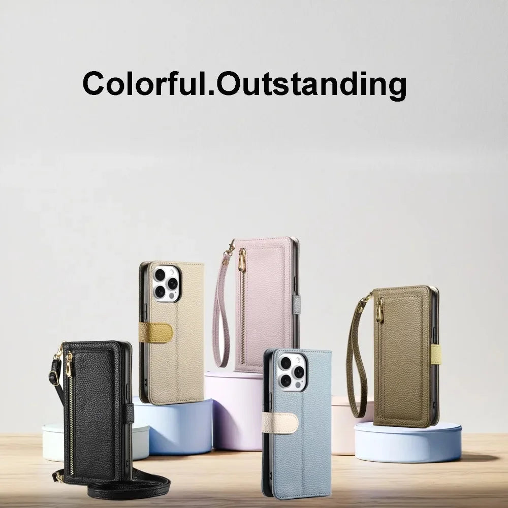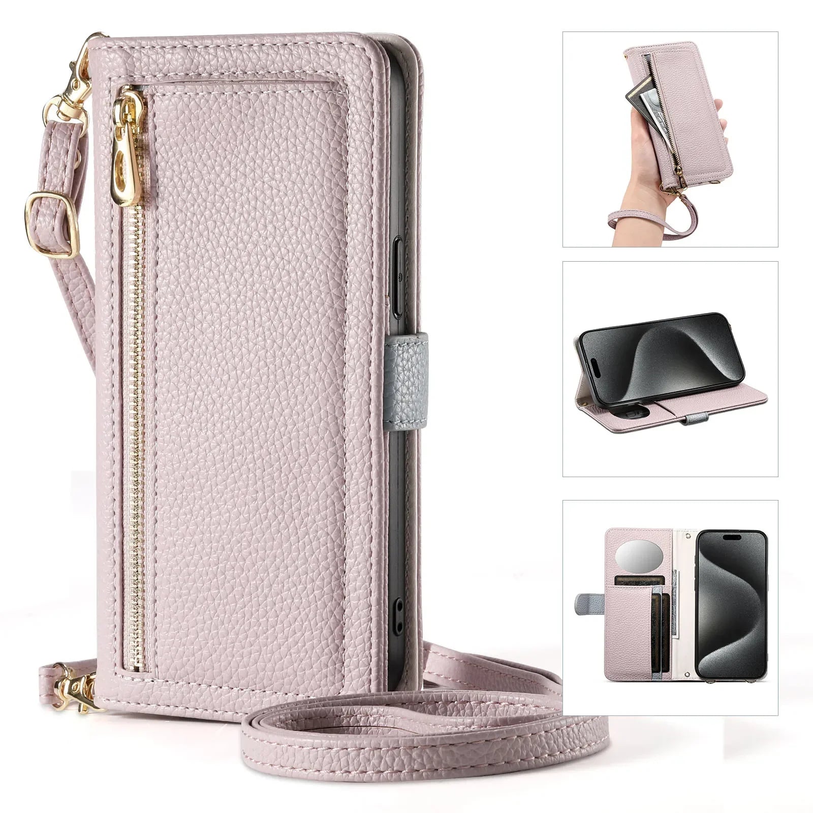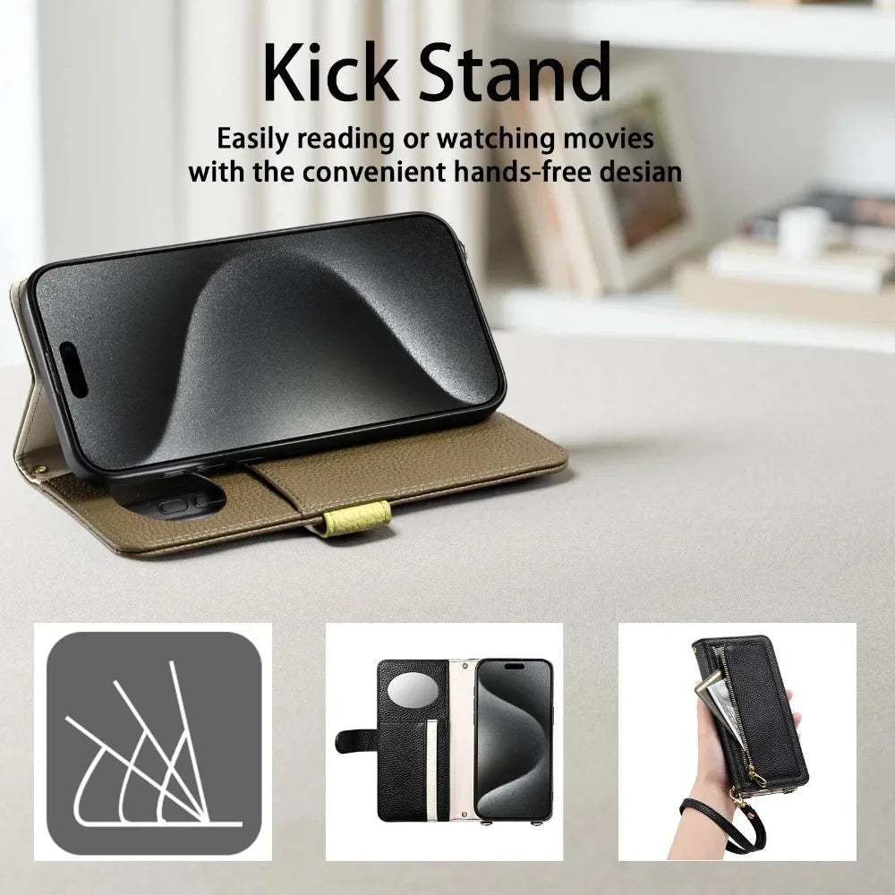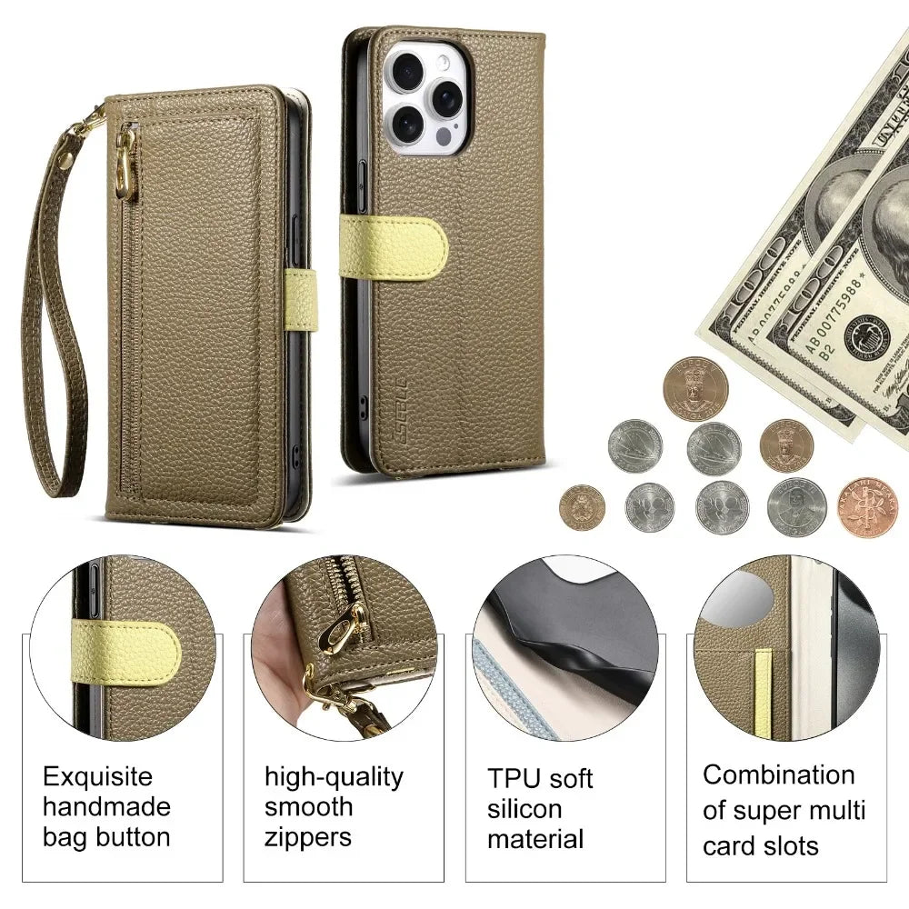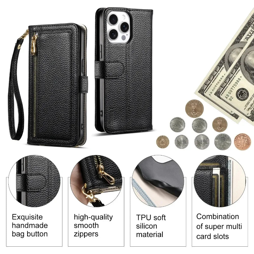 【ブックスタイル】レザー調 財布一体型 手帳型 iPhoneケース|ファスナー収納・ミラー付き #240201