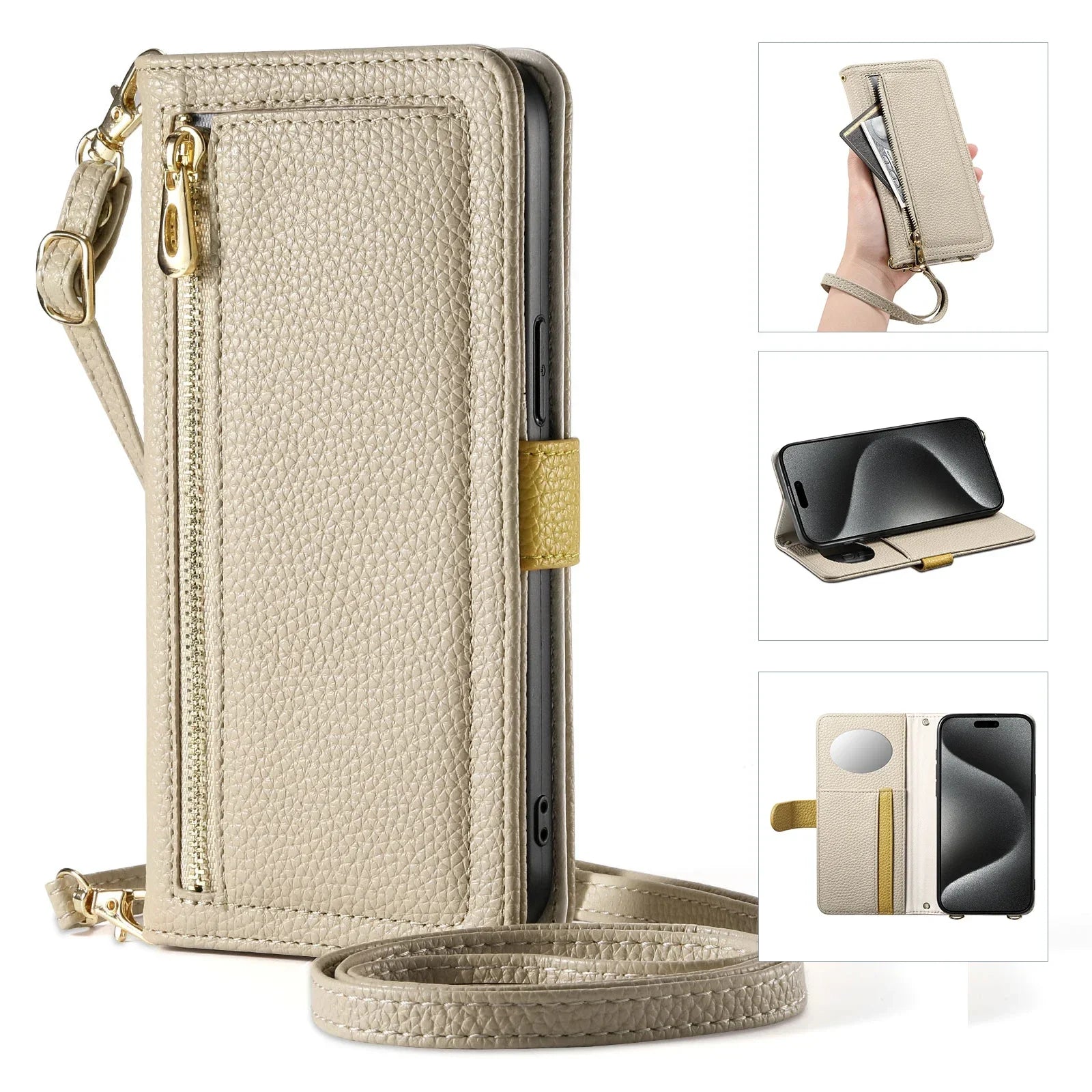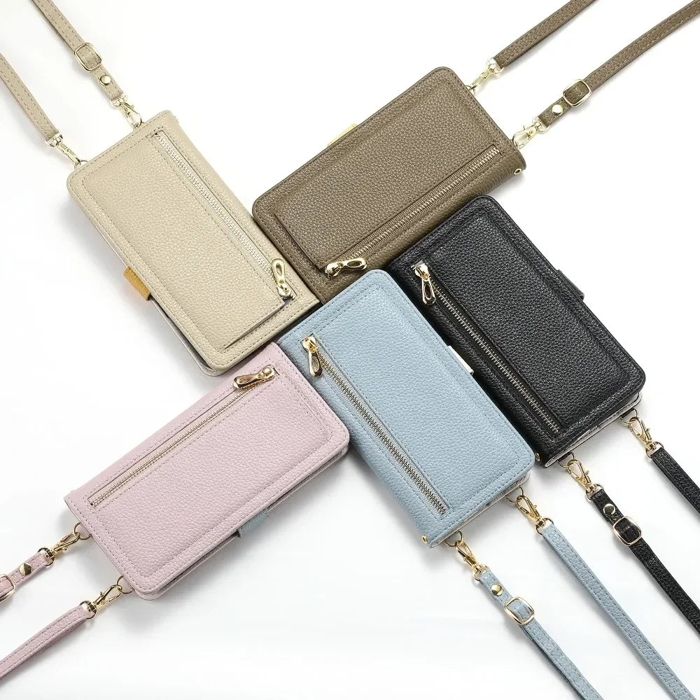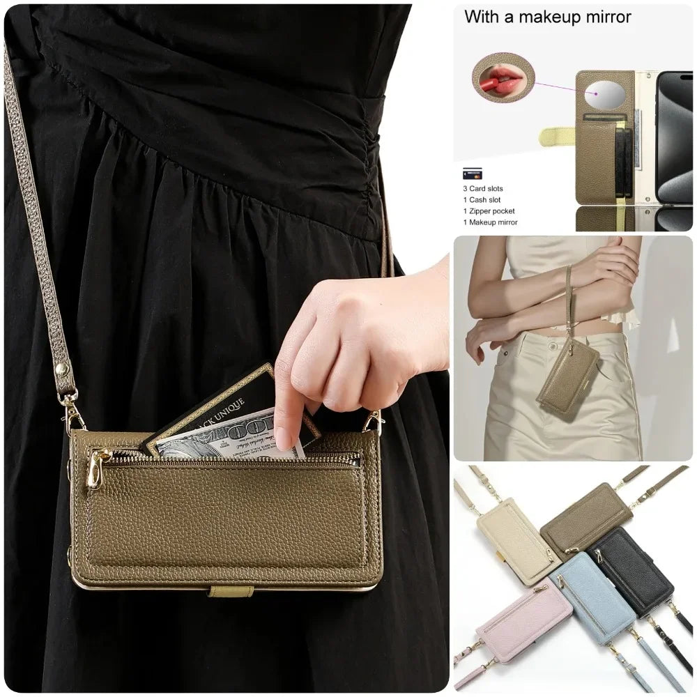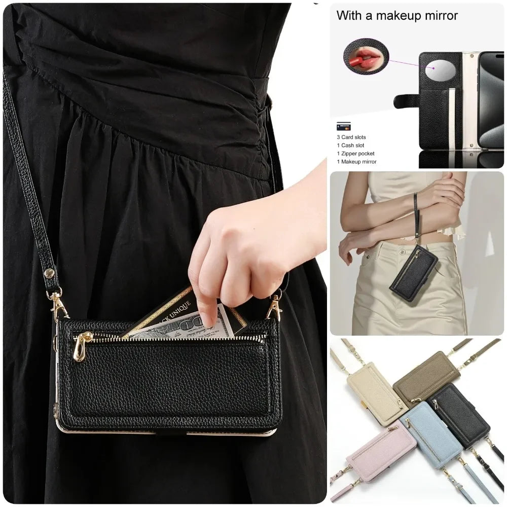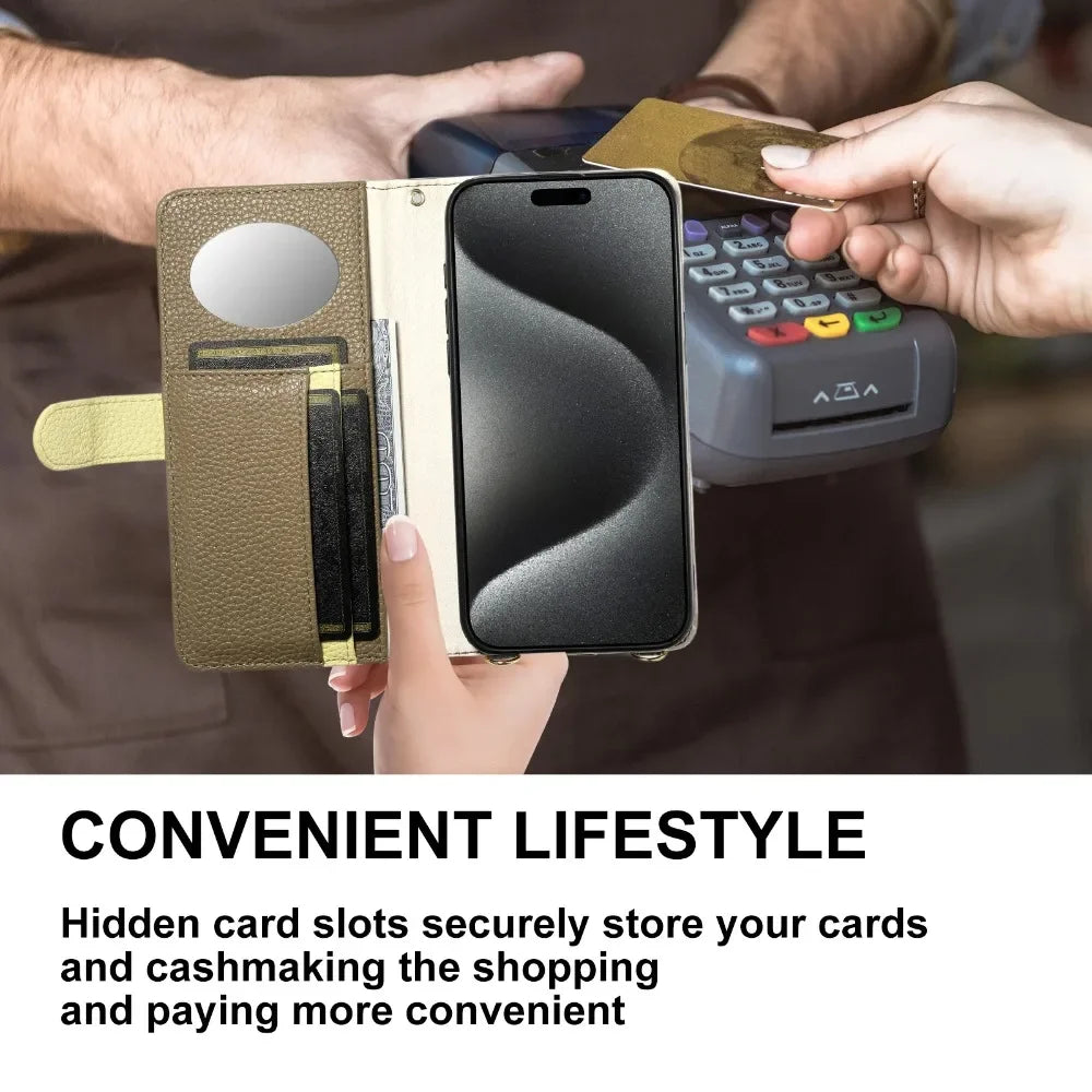 【ブックスタイル】レザー調 財布一体型 手帳型 iPhoneケース|ファスナー収納・ミラー付き #240201