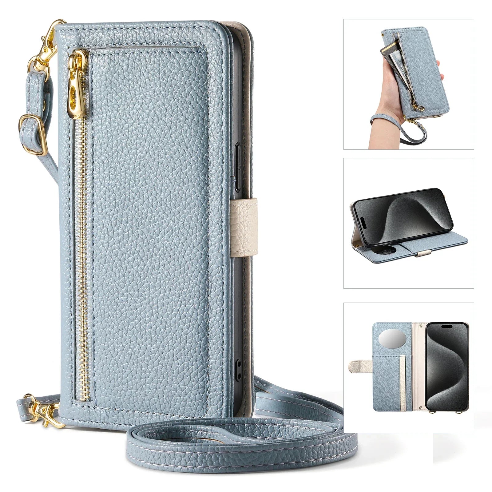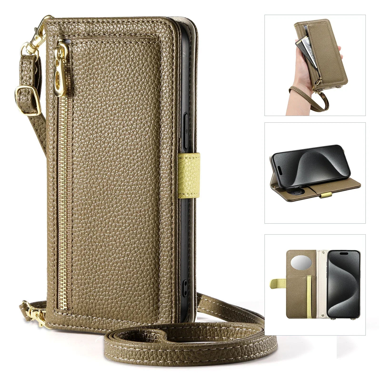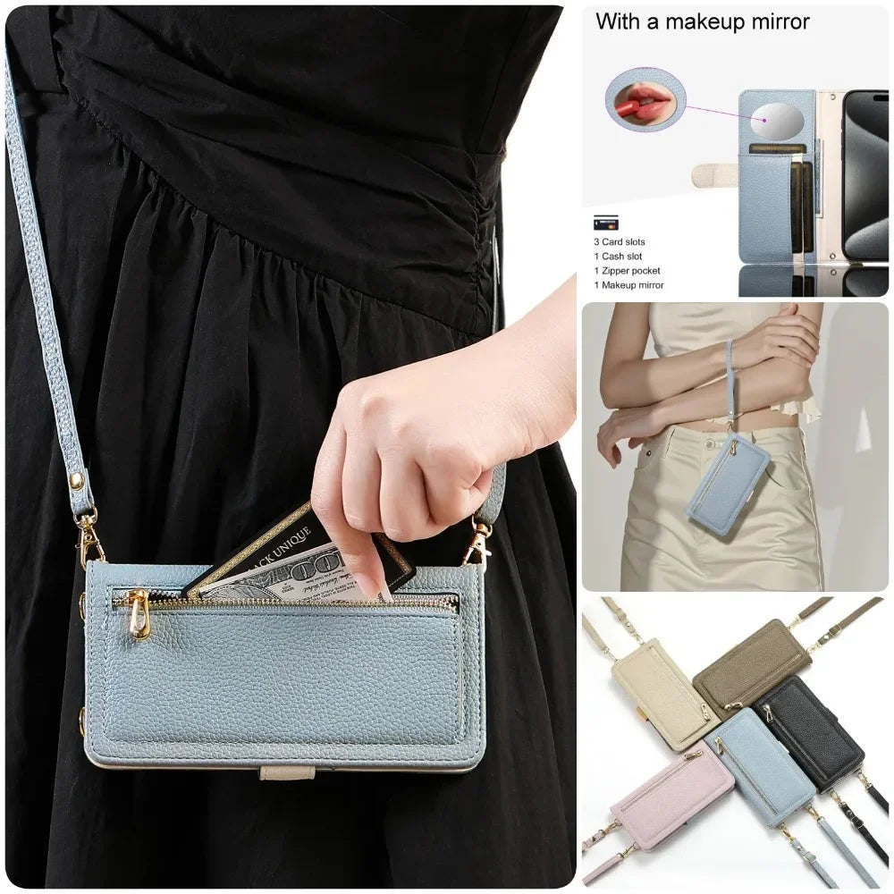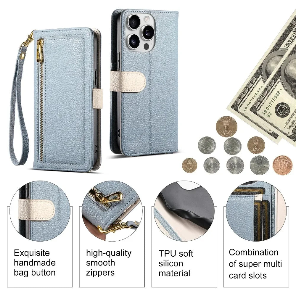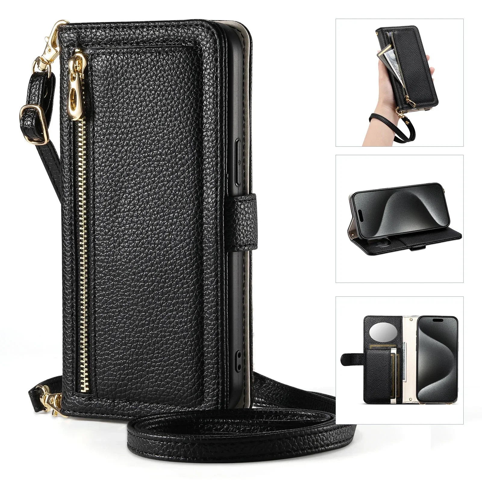 【ブックスタイル】レザー調 財布一体型 手帳型 iPhoneケース|ファスナー収納・ミラー付き #240201