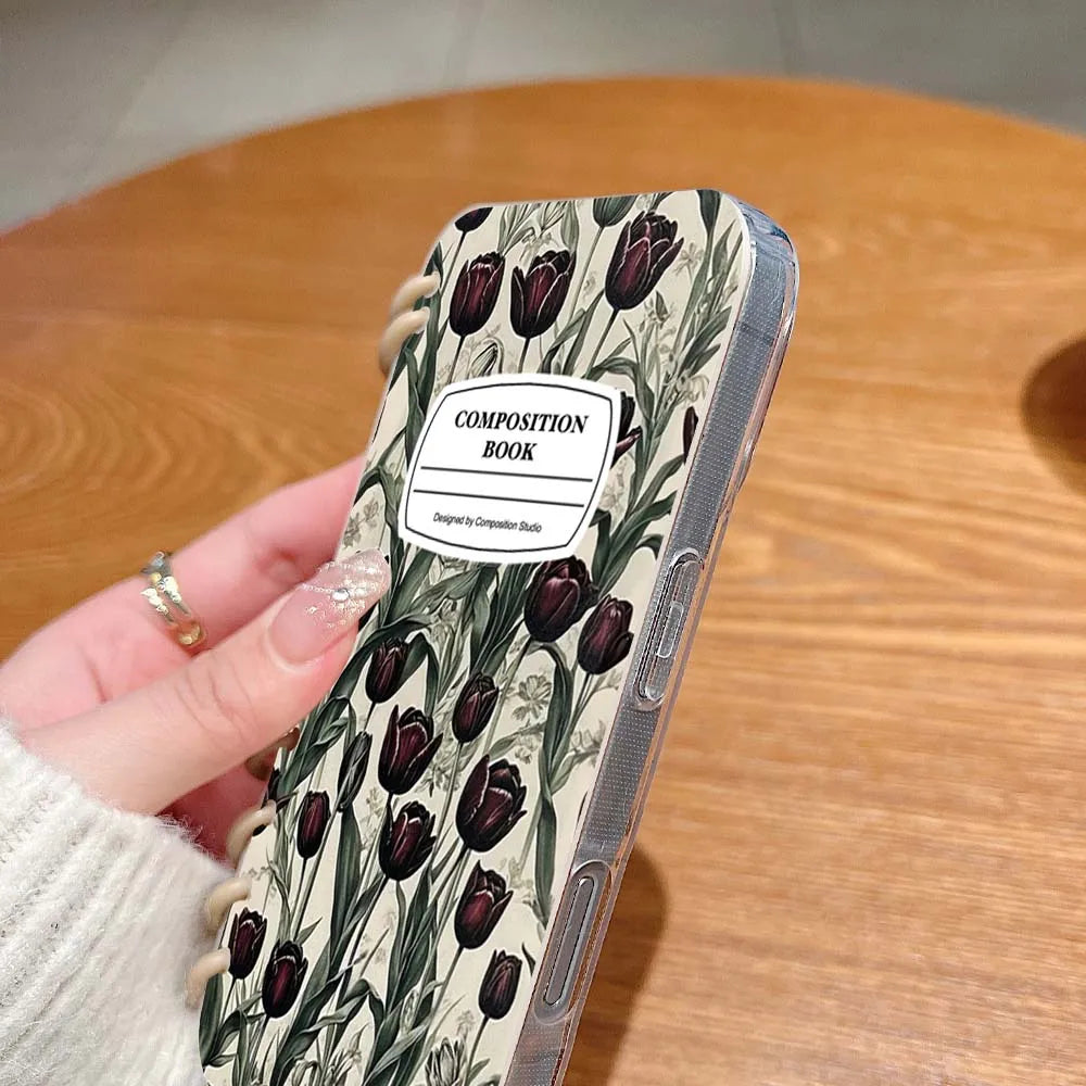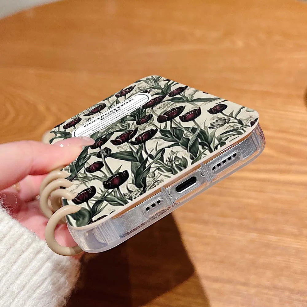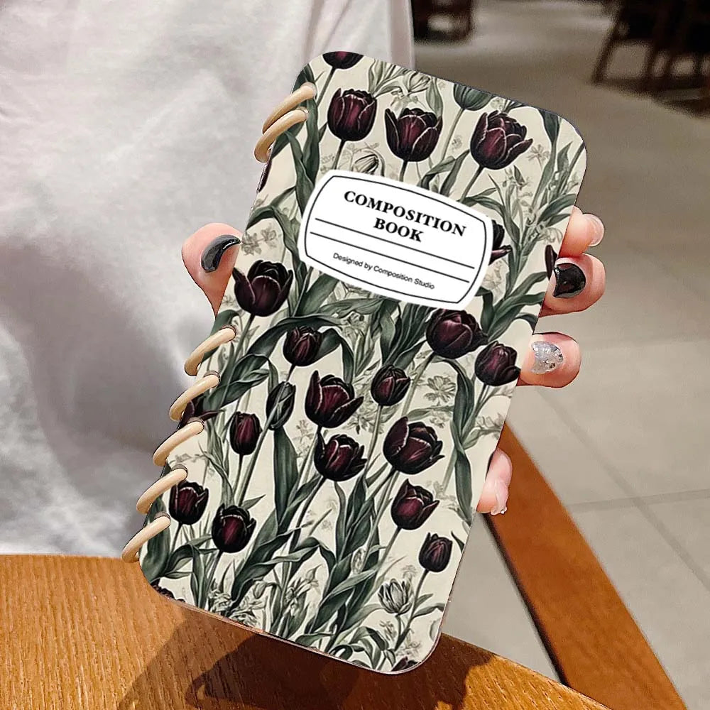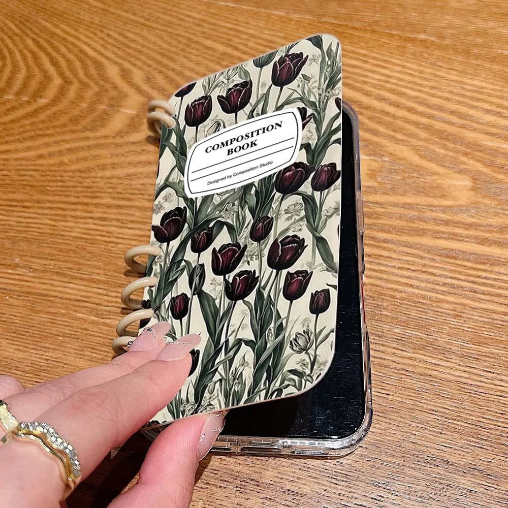 【ブックスタイル】リングノート風 フラワー チューリップデザイン 手帳型 iPhoneケース #240202