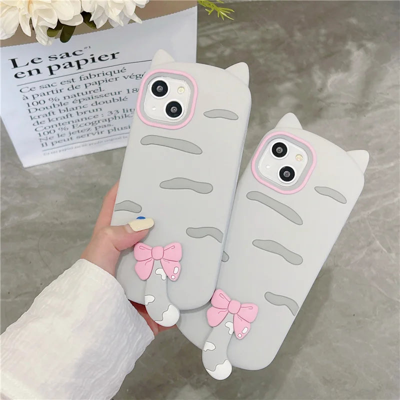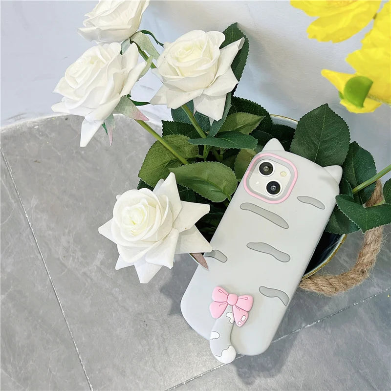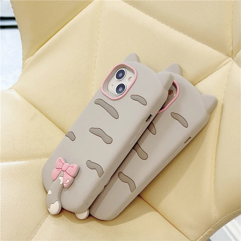 【猫耳シリーズ】しっぽ付き リボン デザイン マット グレー iPhoneケース|くすみカラー #240212