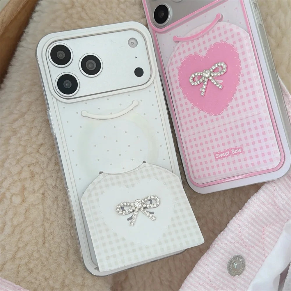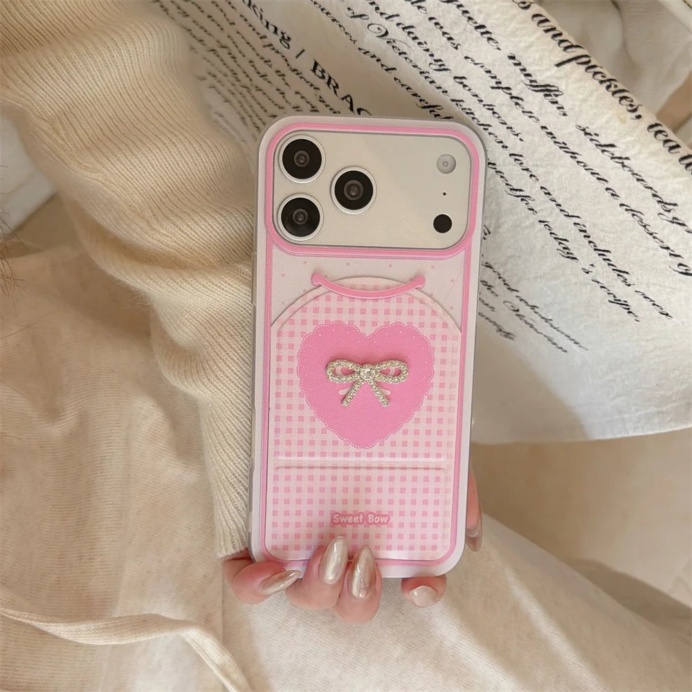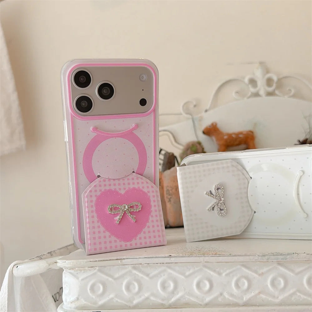 背面に折りたたみスタンドを備えた、実用性と可愛さを兼ね備えたiPhoneケース。