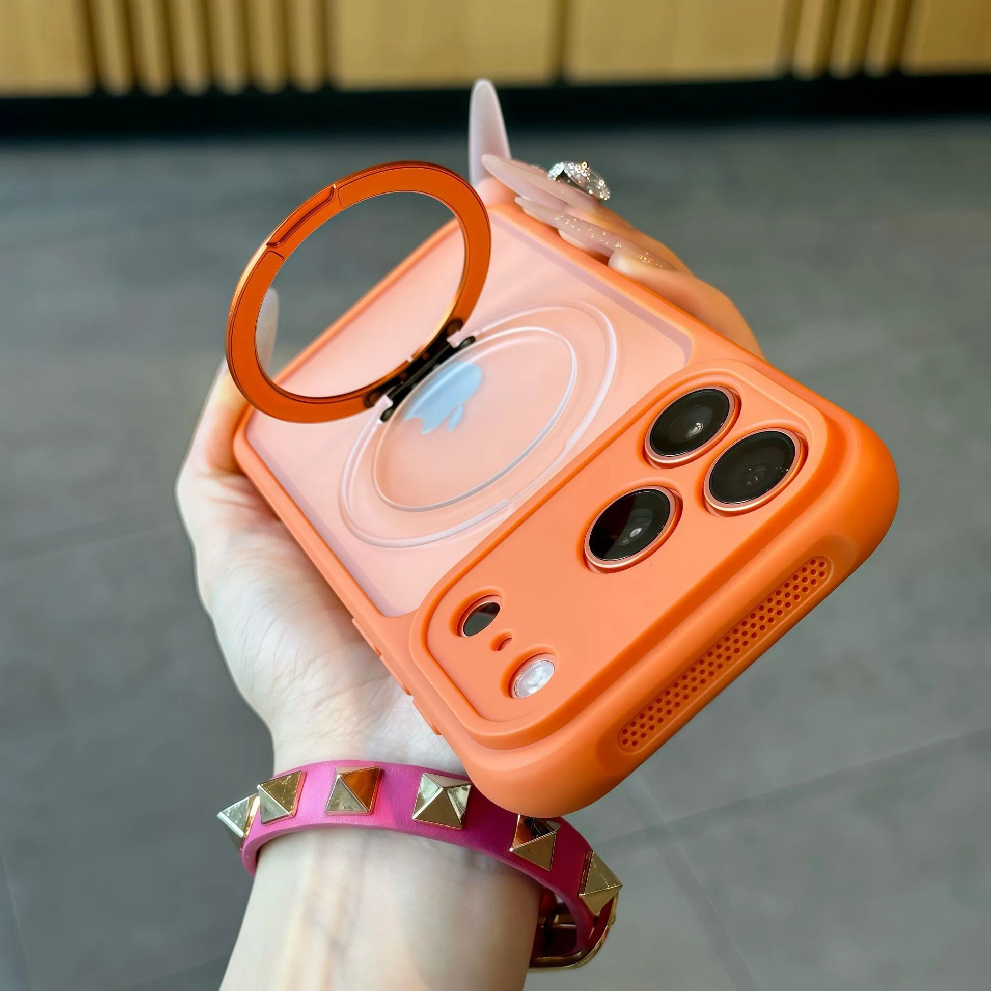 背面リング一体型で、片手操作やスタンド使いも快適。