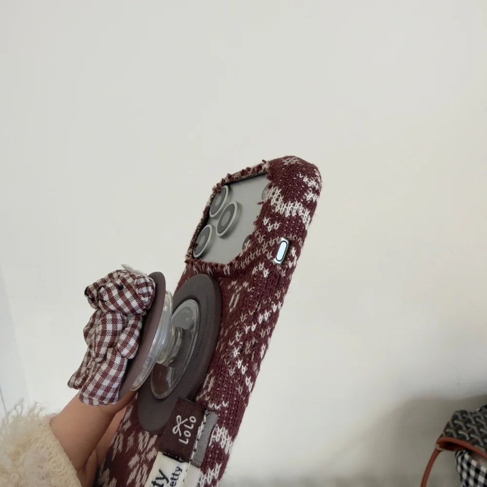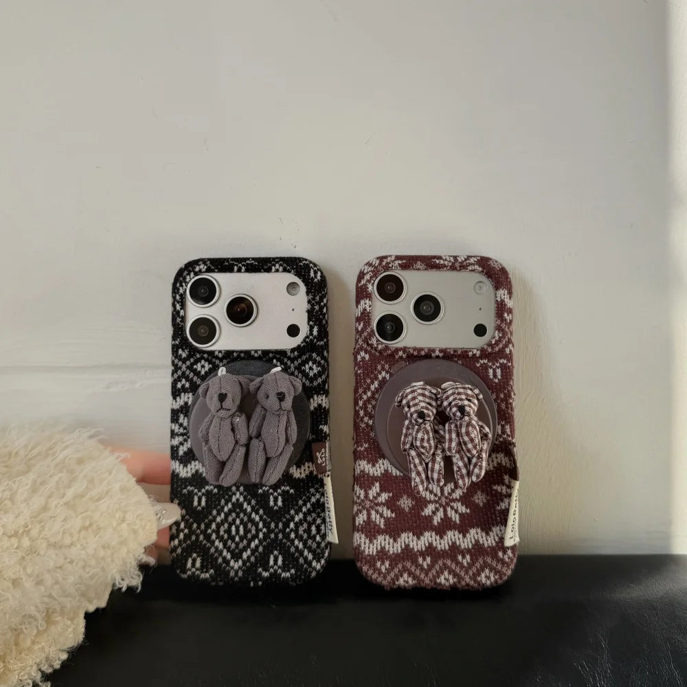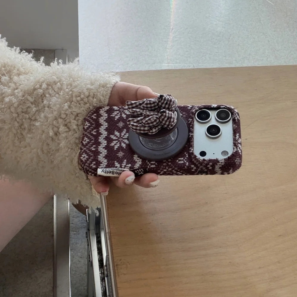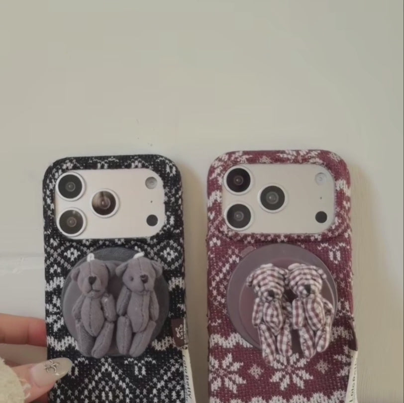 クラシックニット ベアグリップ iPhoneケース|秋冬ツイード風デザイン #240416