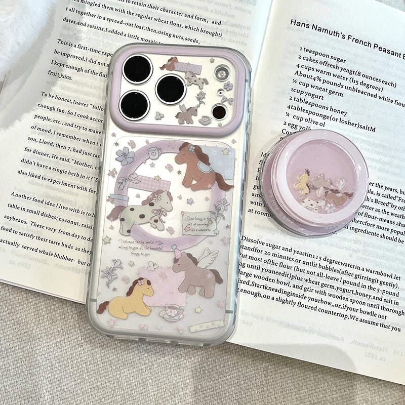 ユニコーンホース イラストiPhoneケース|パステル動物柄・クリアグリップ付き #240428