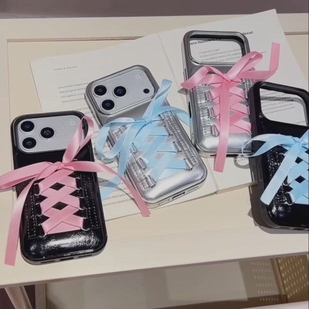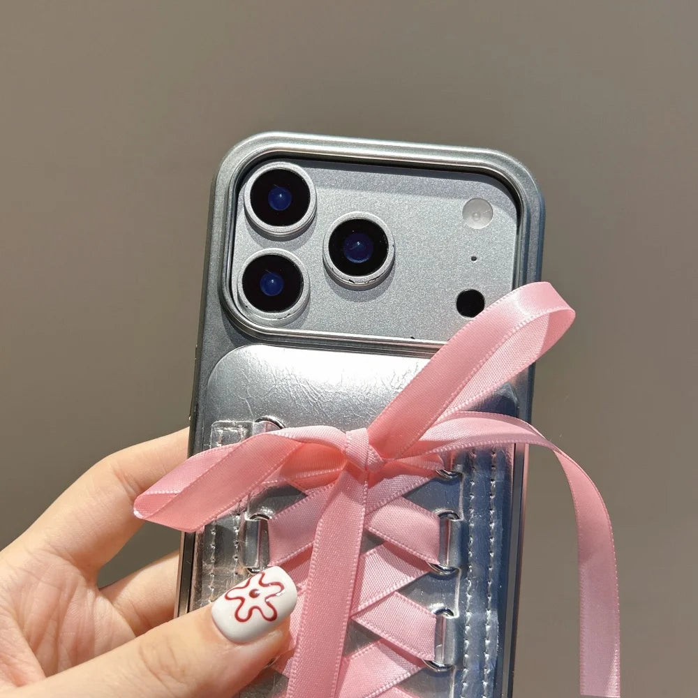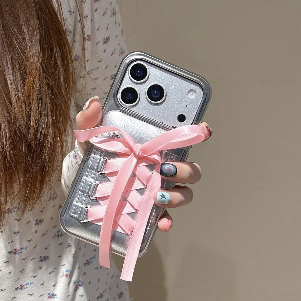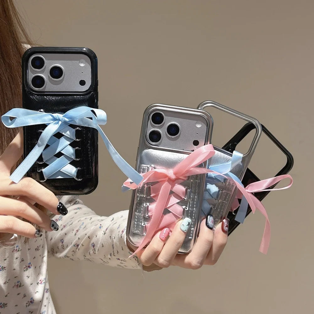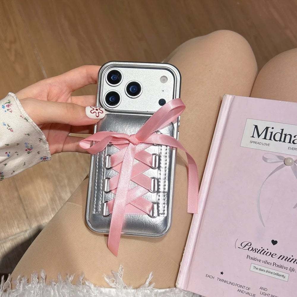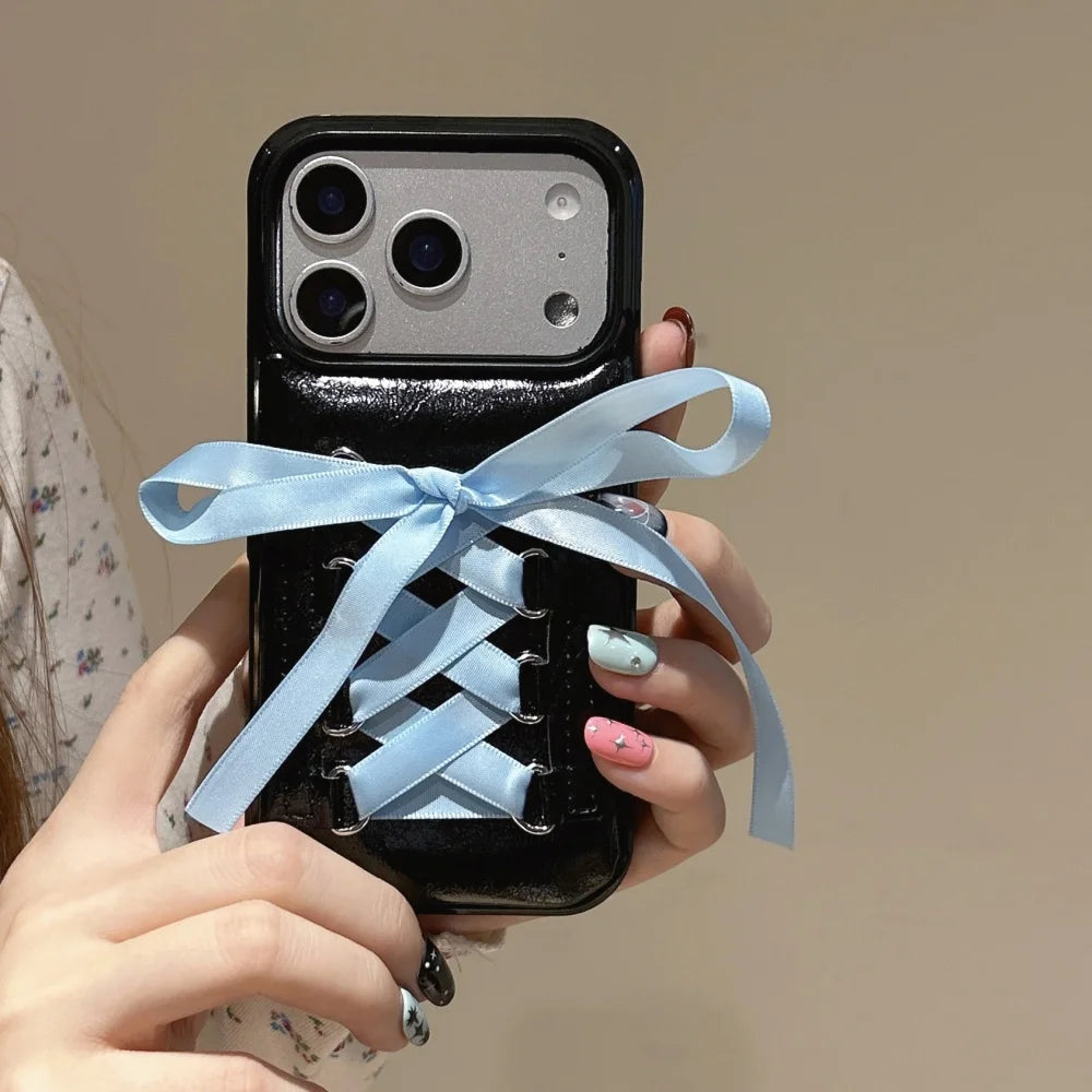 フロントに編み上げたリボンが目を引く、ガーリーなレースアップ風iPhoneケース。