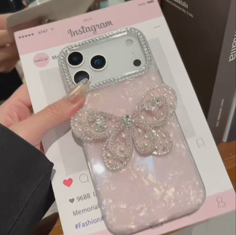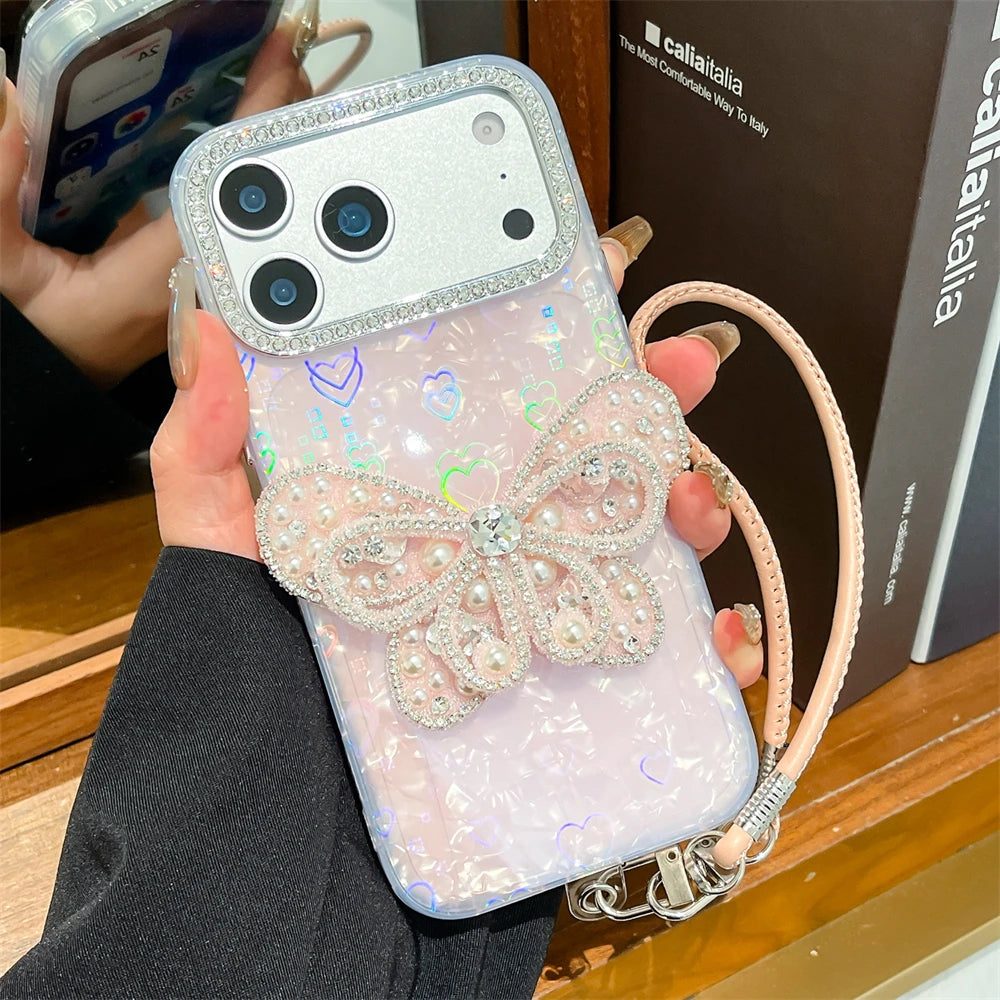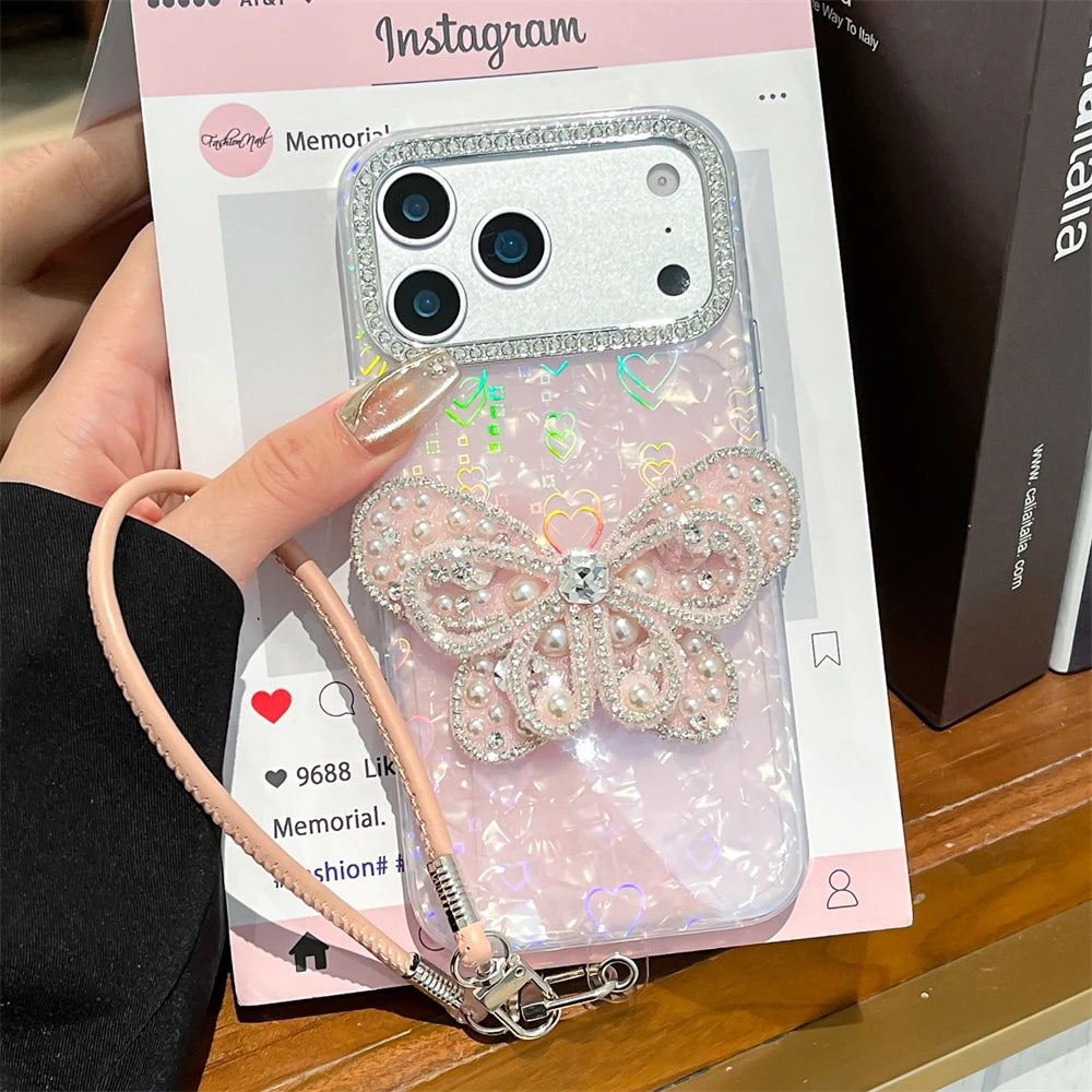 バタフライモチーフ iPhoneケース|蝶々 パールビジューデザイン・ストラップ付き #240602