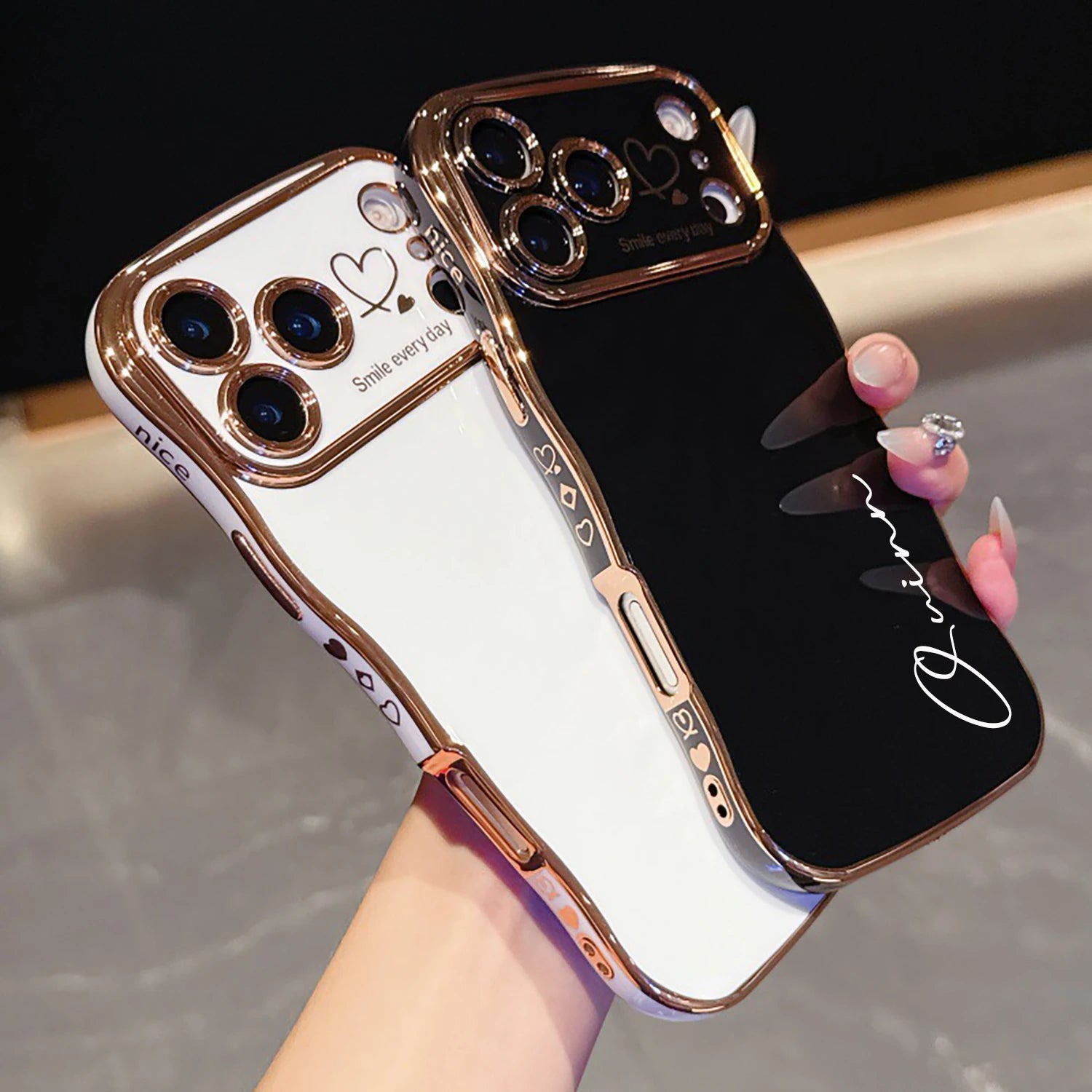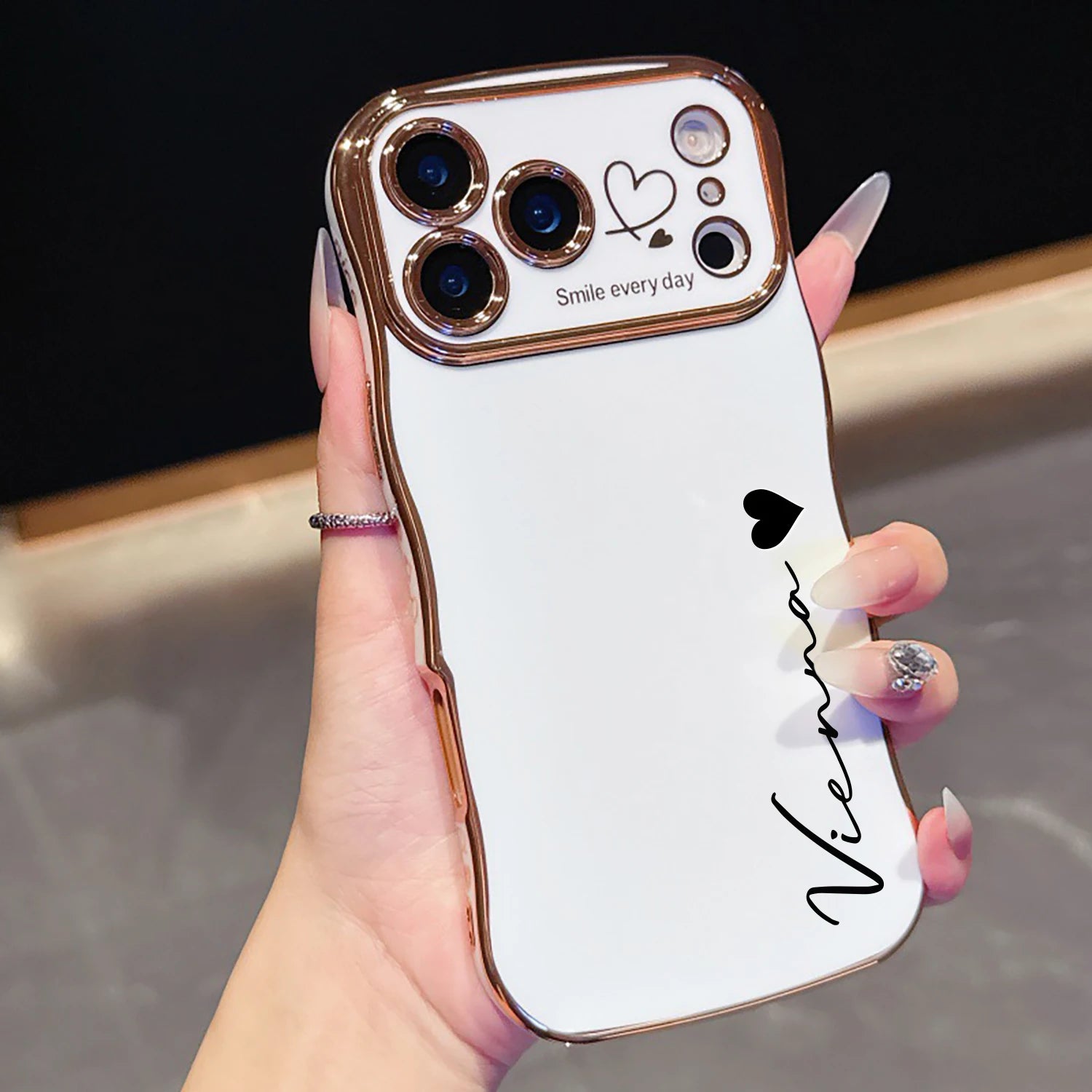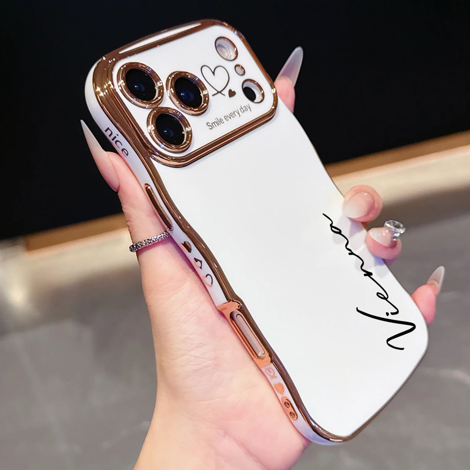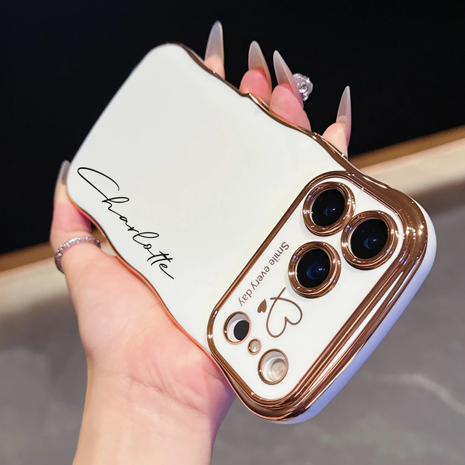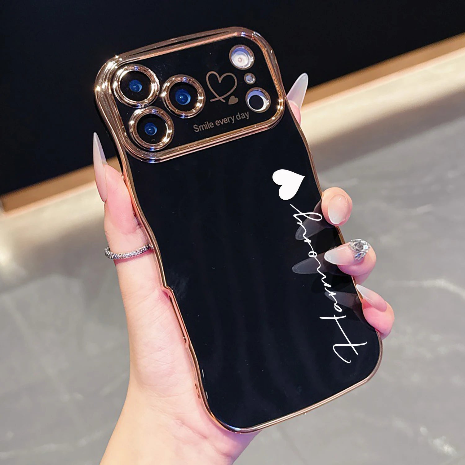 上品なゴールドのウェーブフレームにサイドハートが可愛いカスタムiPhoneケースです。