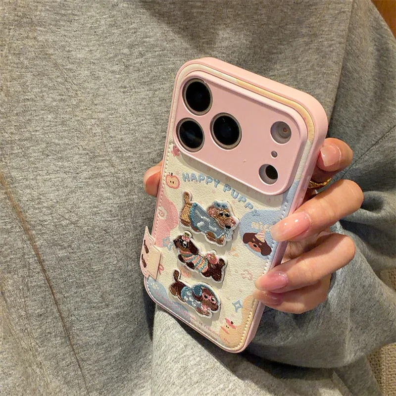【HAPPY PUPPY】ふわもこ3匹わんこ × 立体刺繍 ガーリースマホケース|iPhone対応 #240821