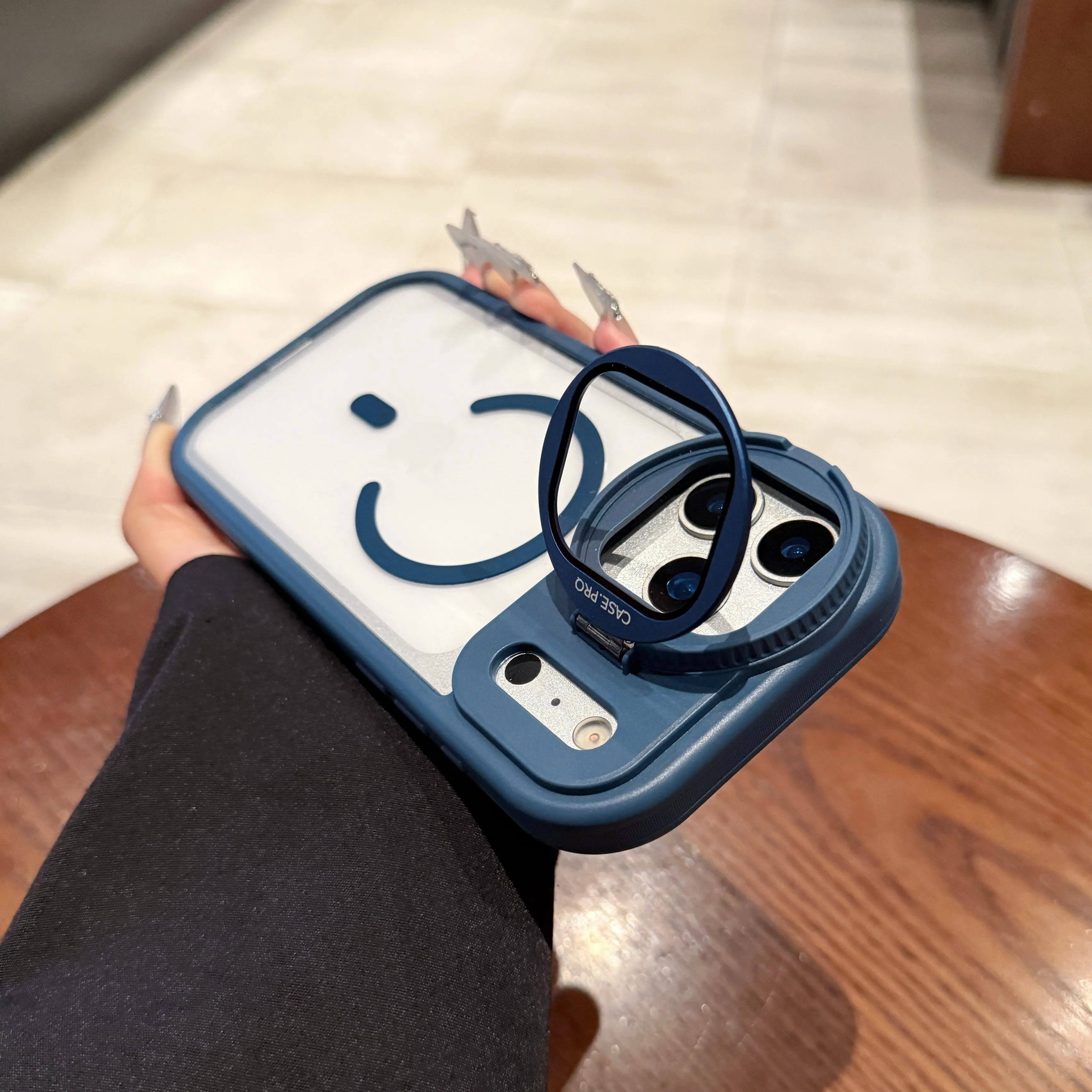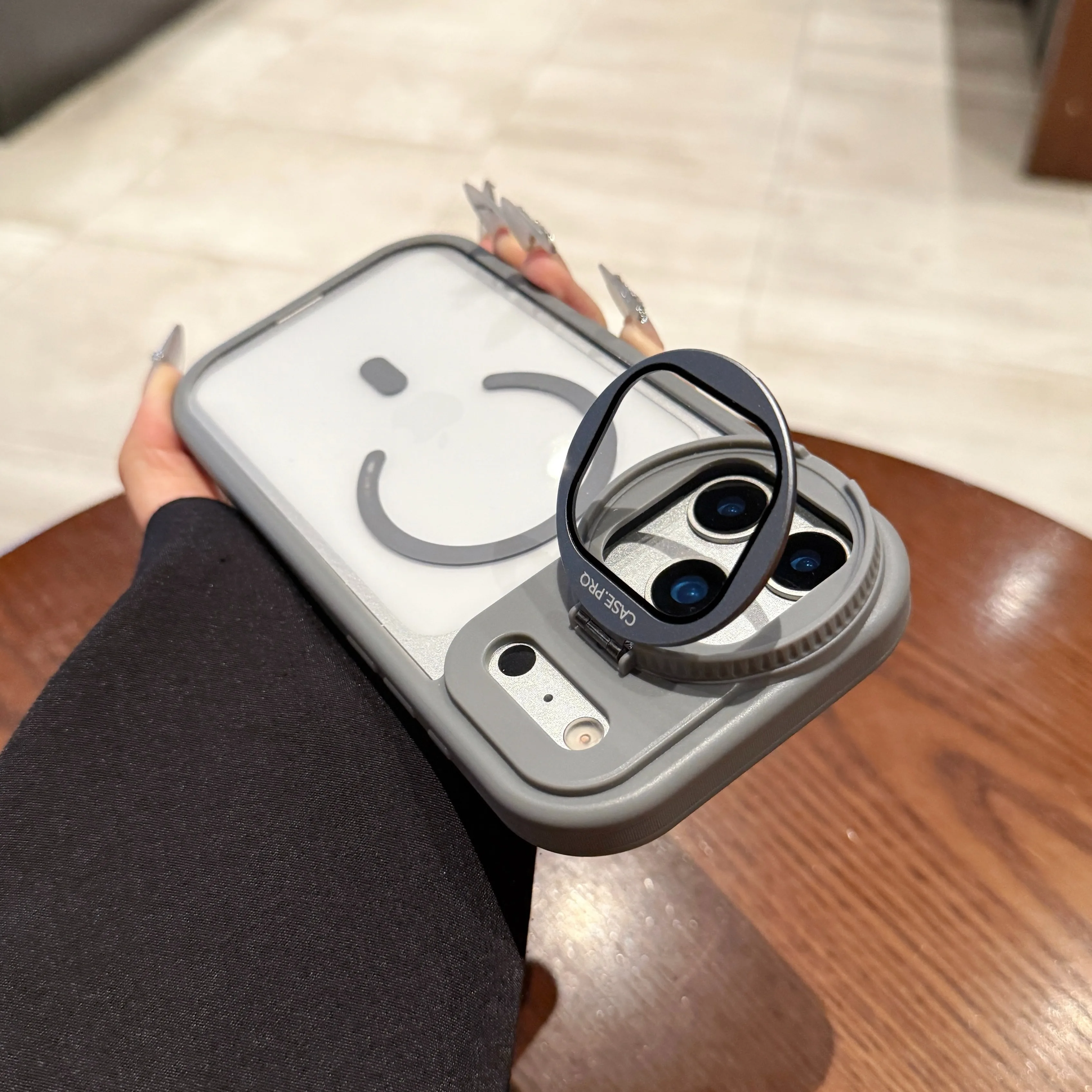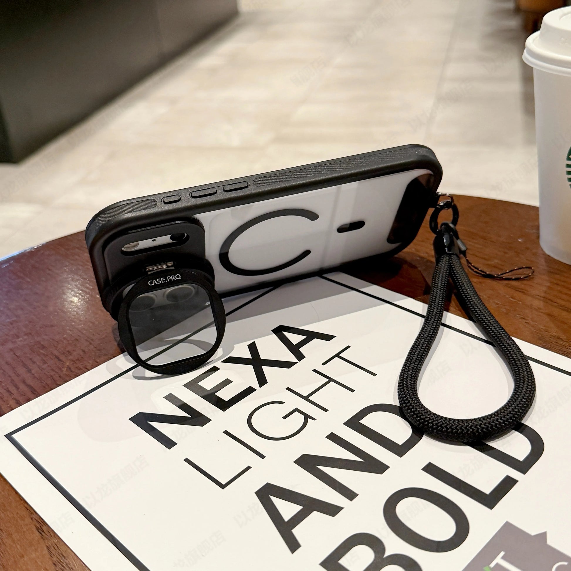 付属のストラップ付きで、手ぶらスタイルや外出時の落下防止にも活躍します。
