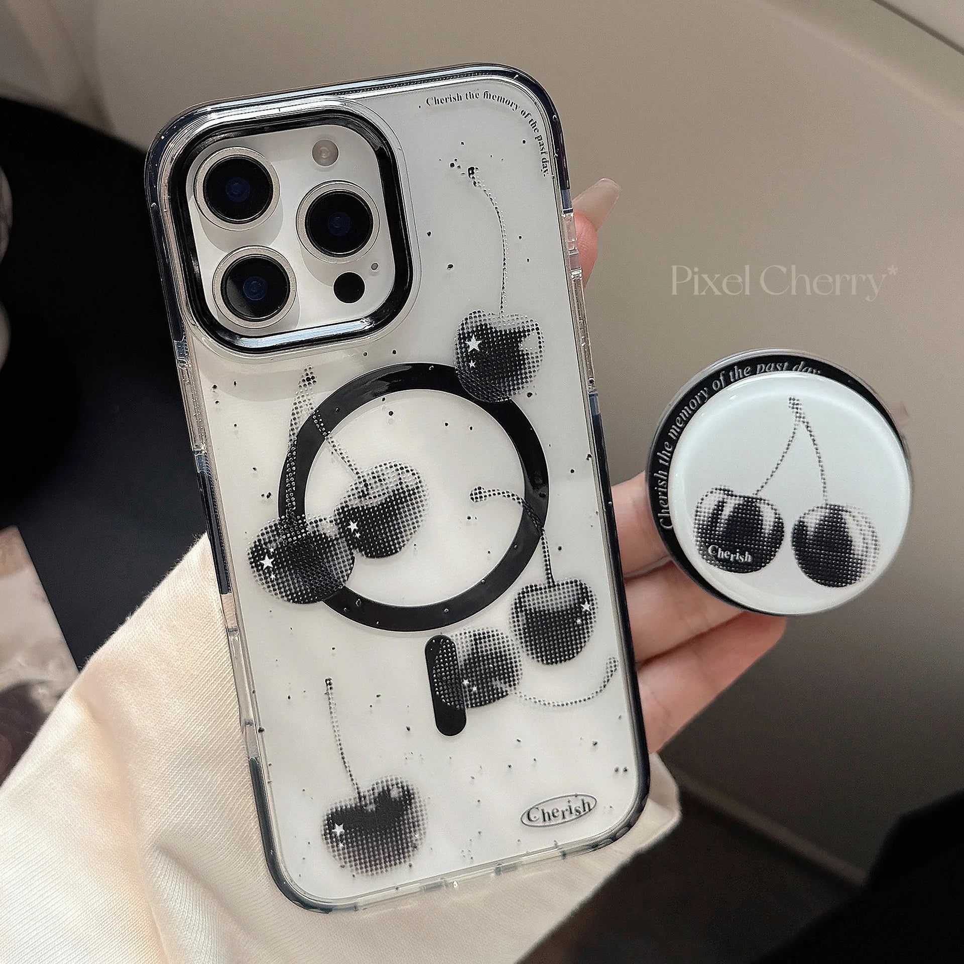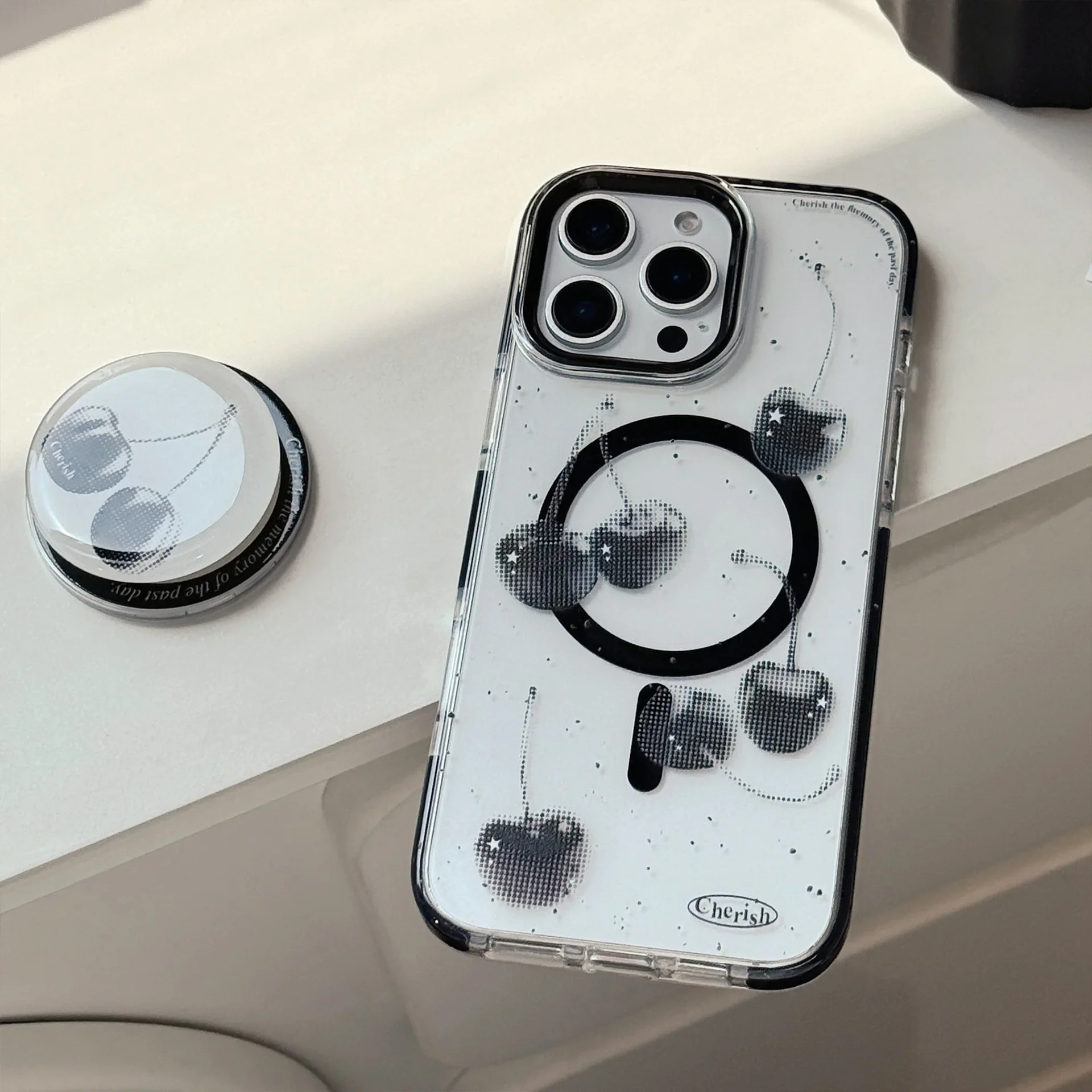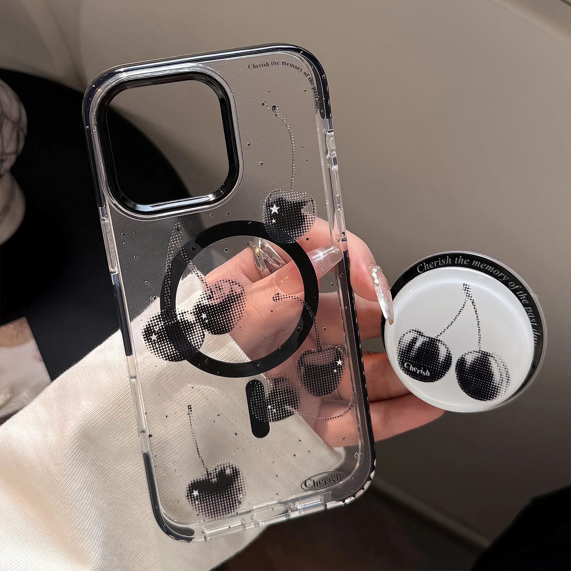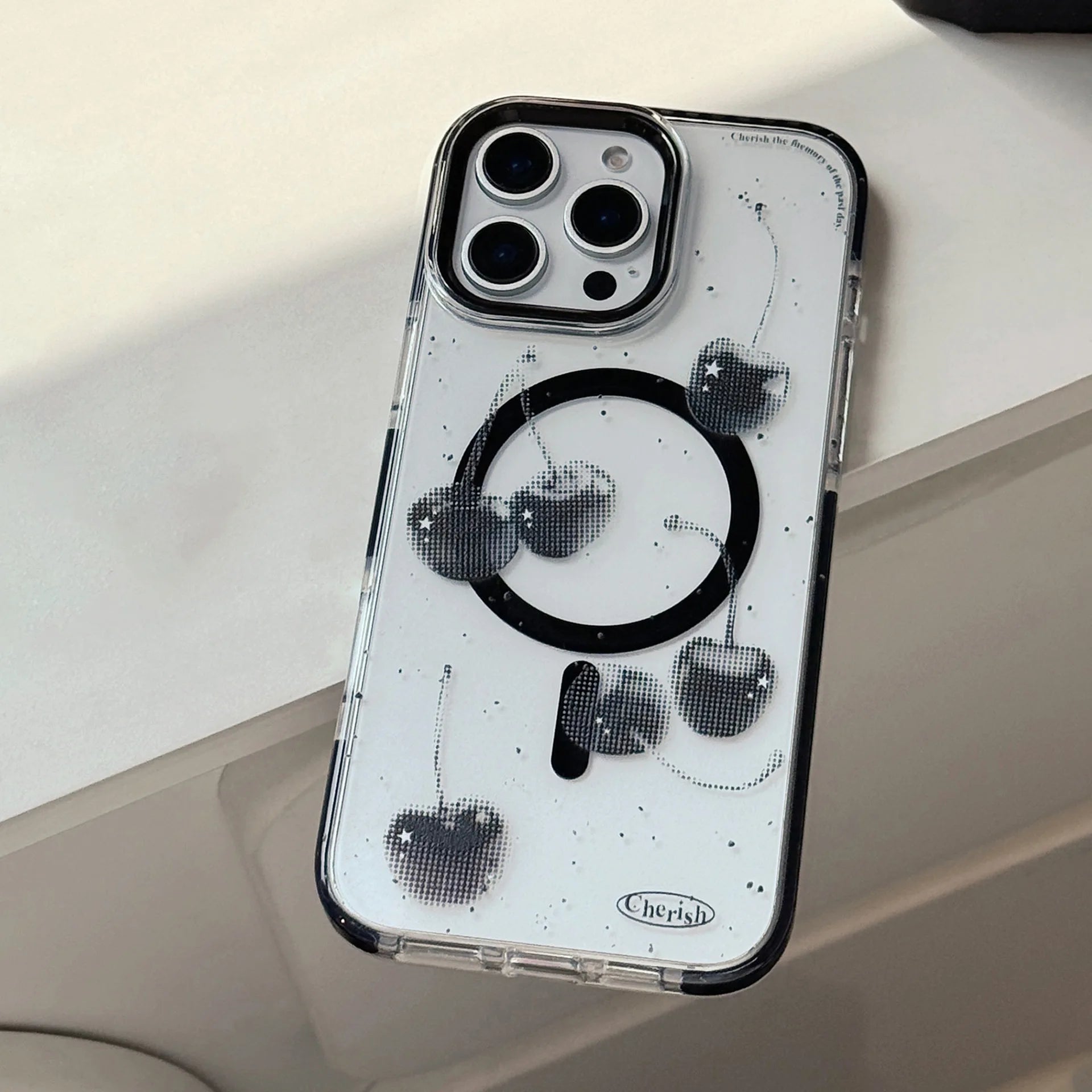 きらめくブラックチェリーが目を惹くケース🍒✨