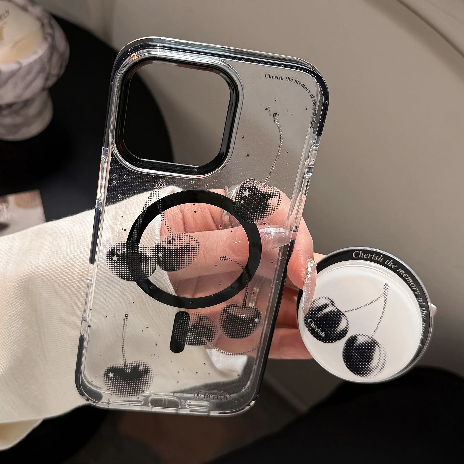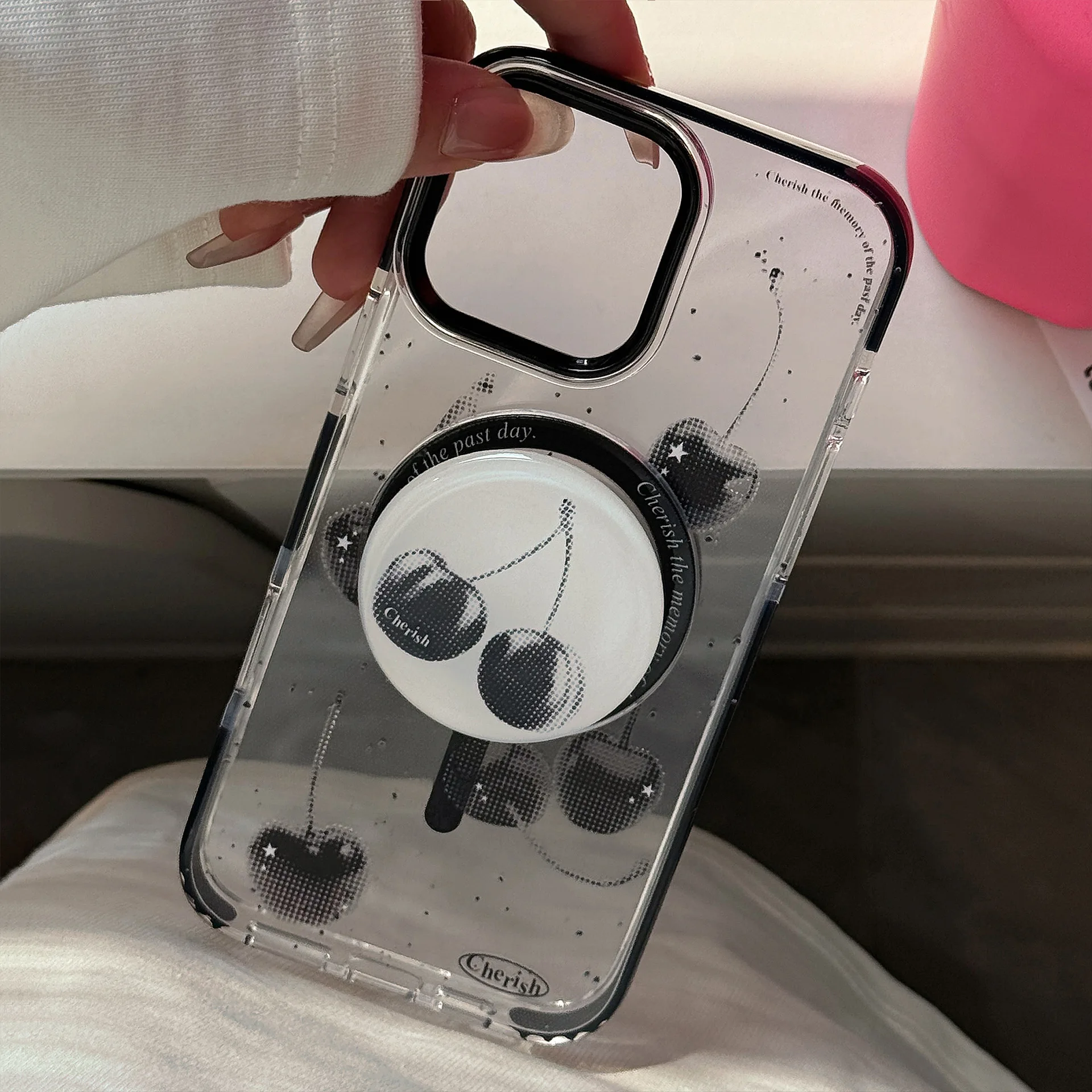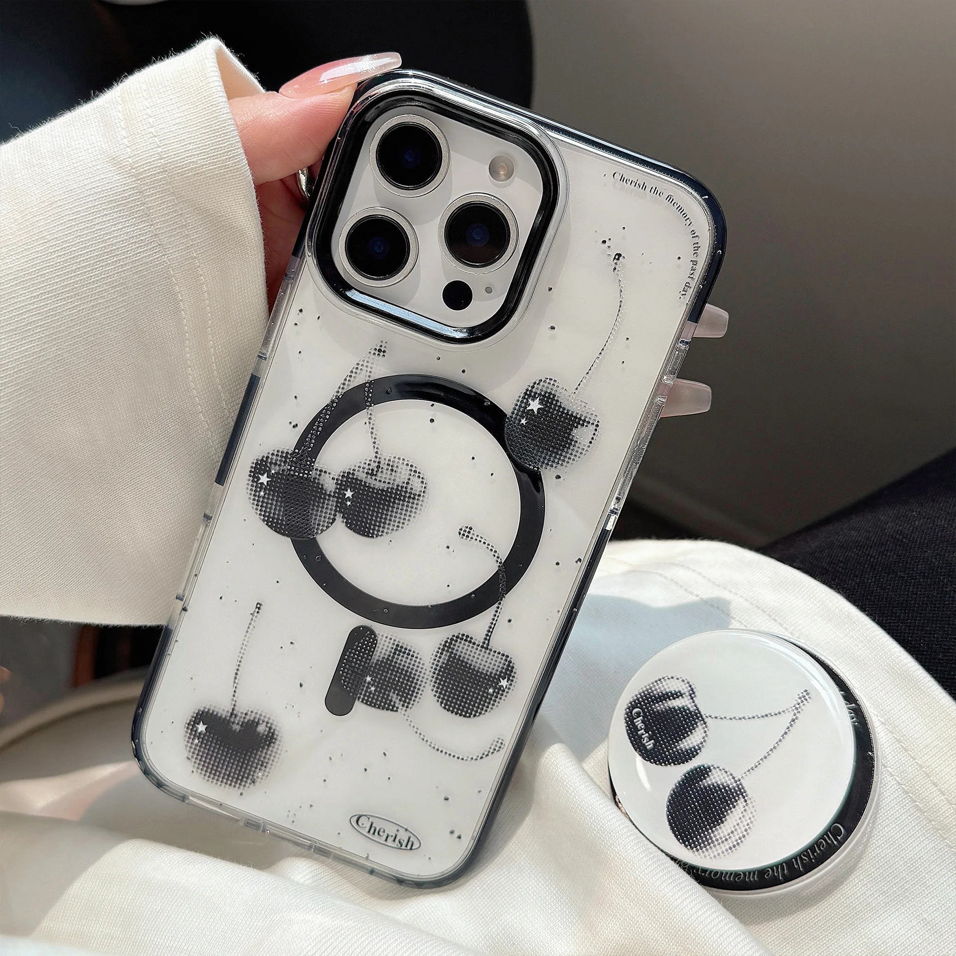 きらめくブラックチェリーが目を惹くケース🍒✨