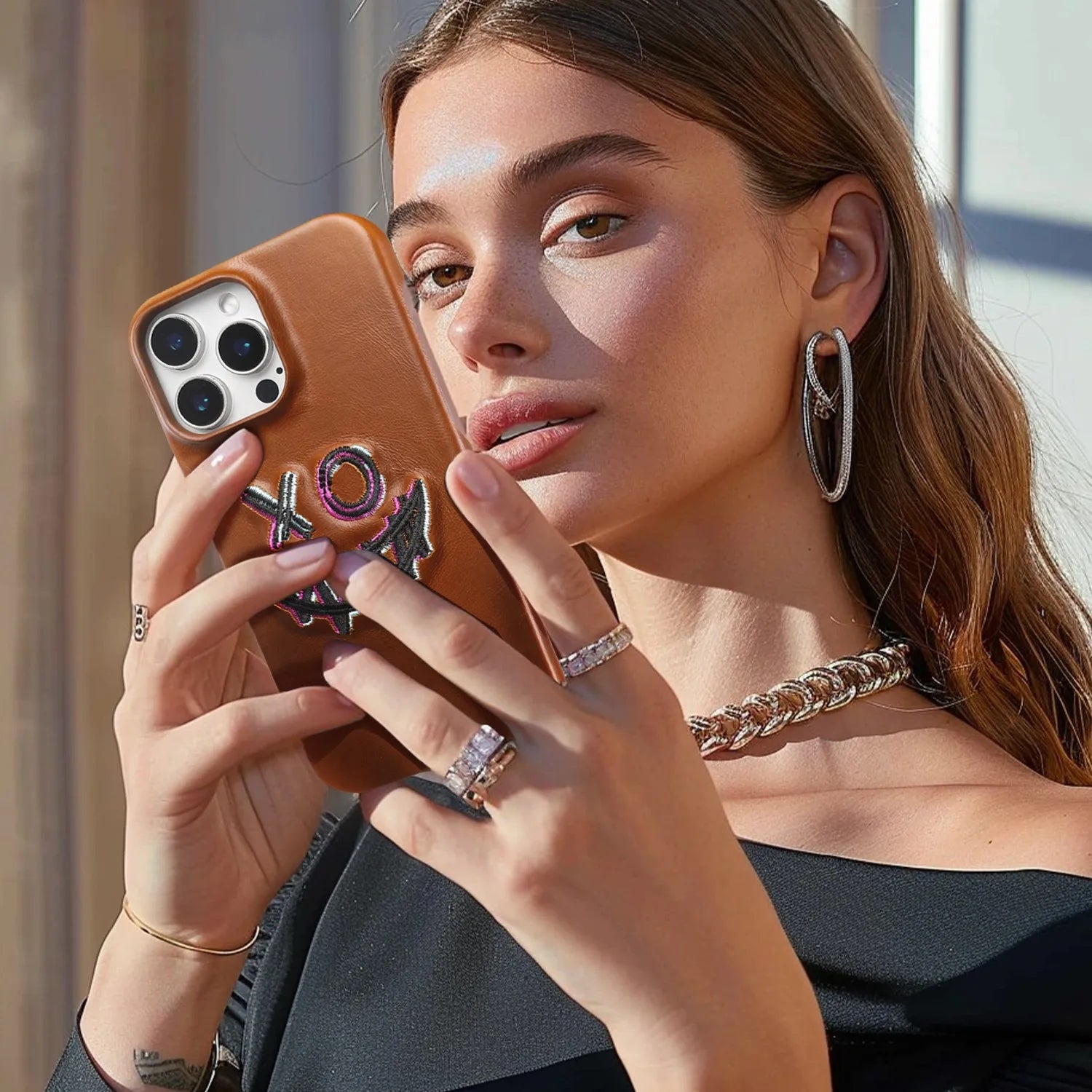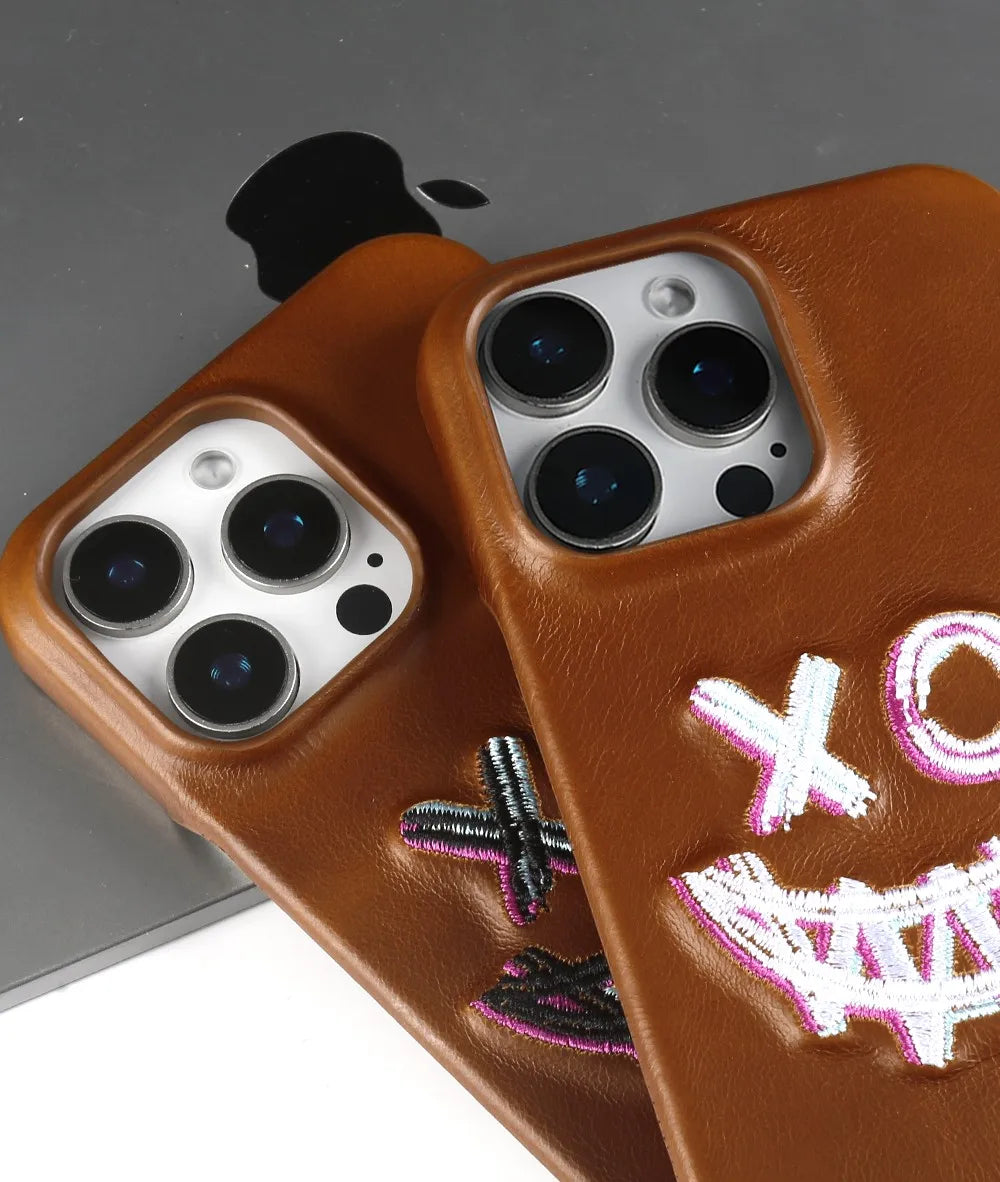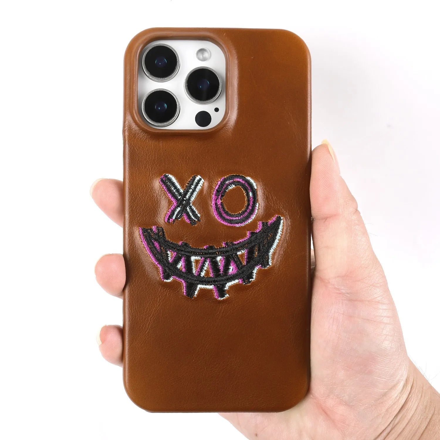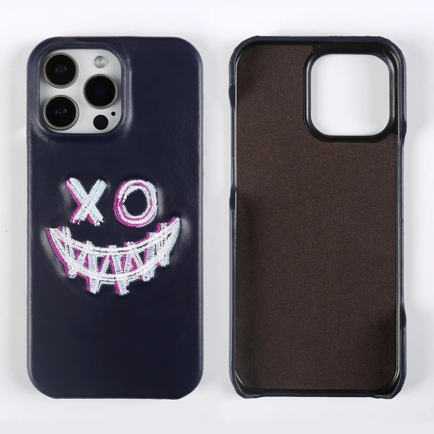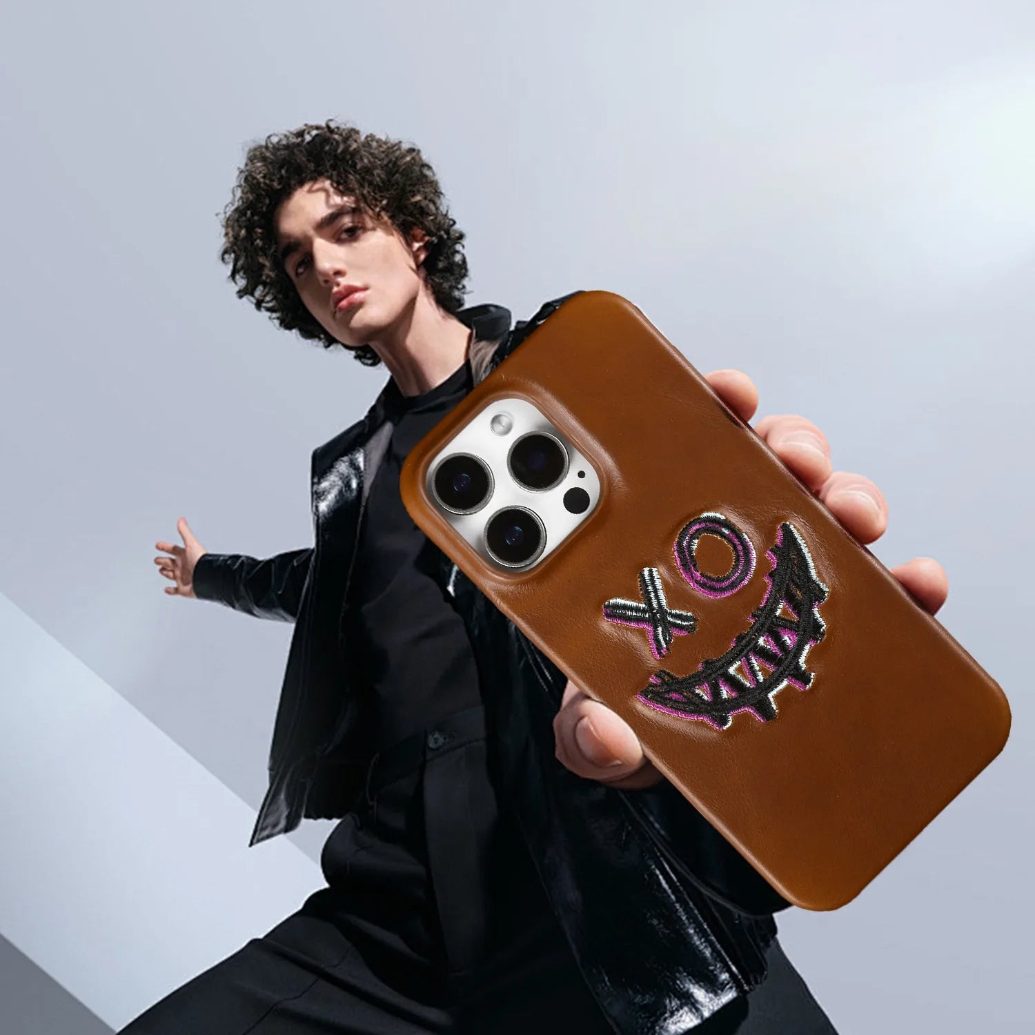 【本革シリーズ】艶あり スムースレザー スマイル ステッチケース|iPhone対応 #240831