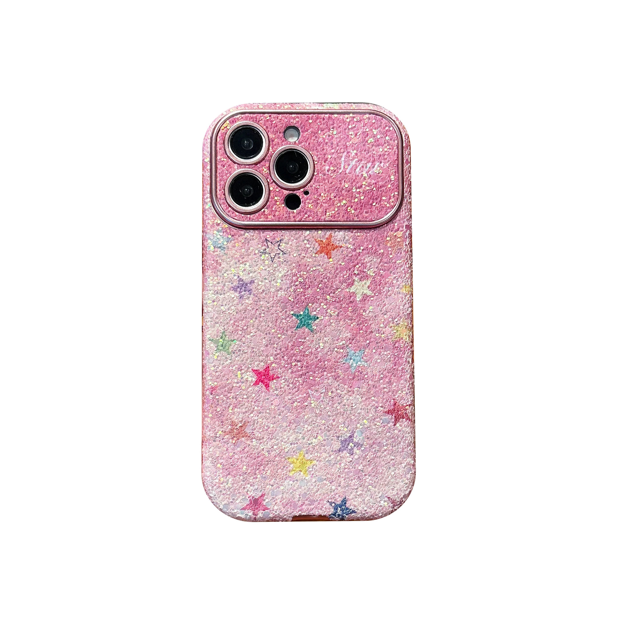 星モチーフが散りばめられた、キラキラ好きにはたまらないピンクグリッターケース。