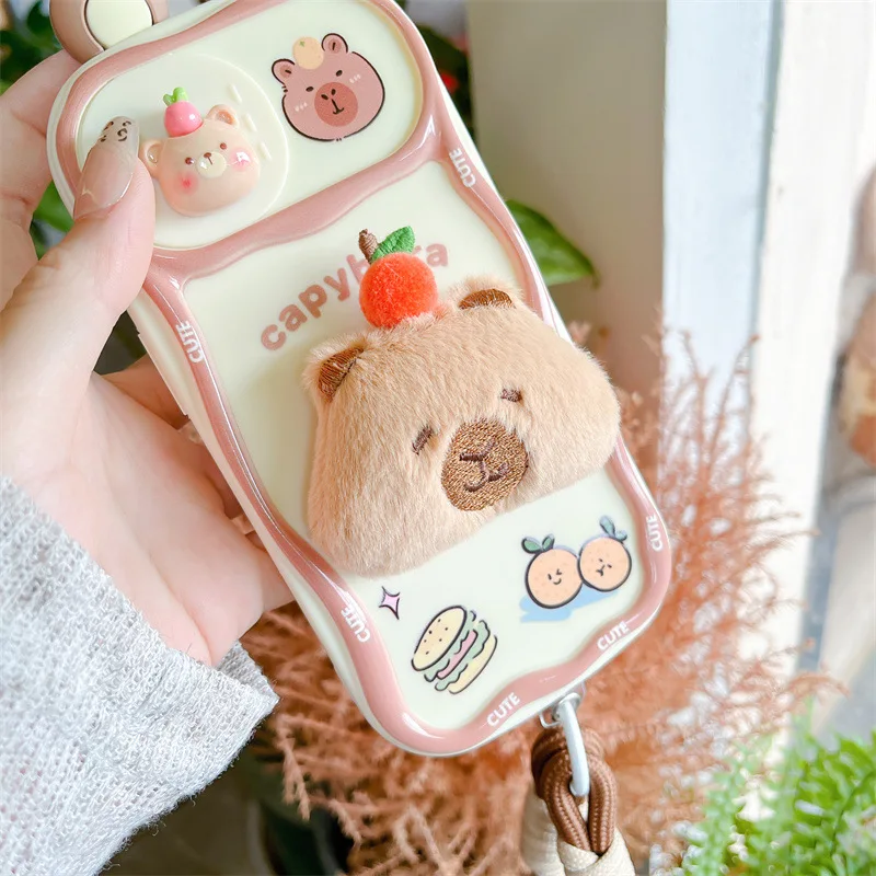 ころんと立体のカピバラが愛おしい、ふわふわ質感の癒し系ケース。