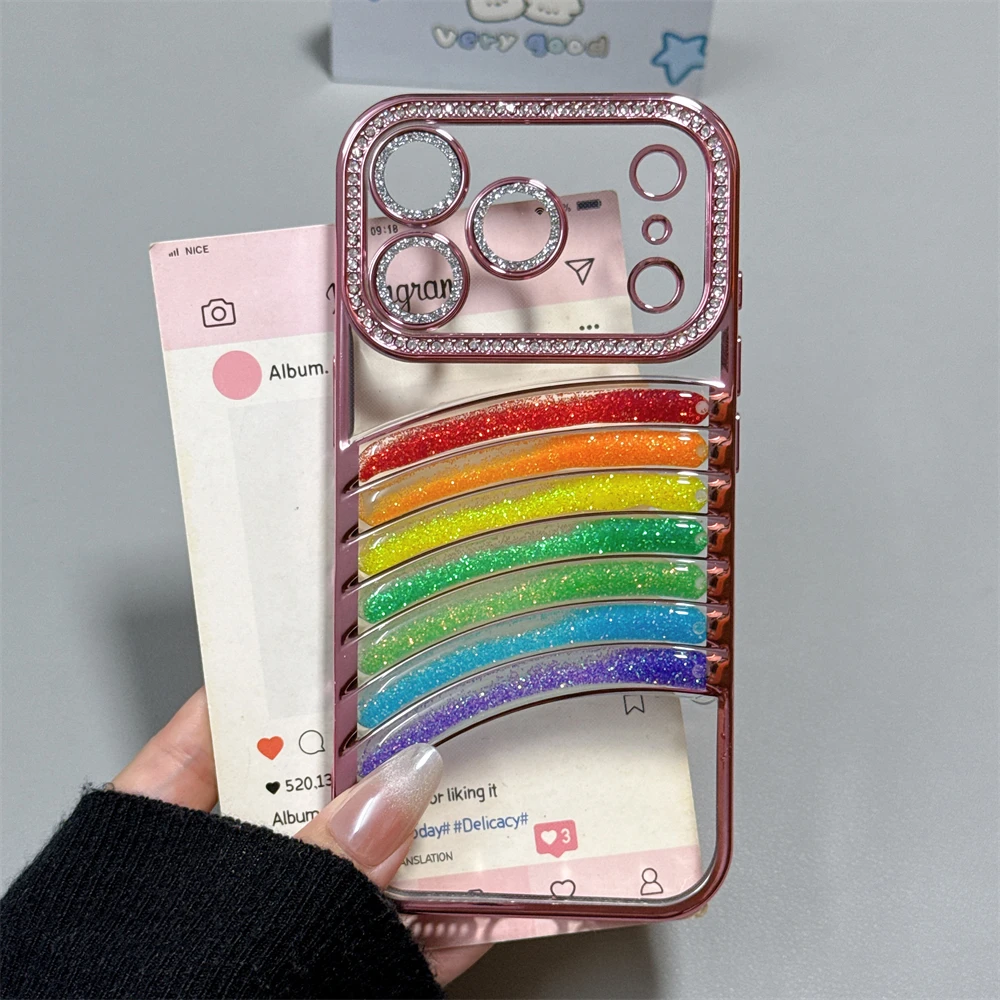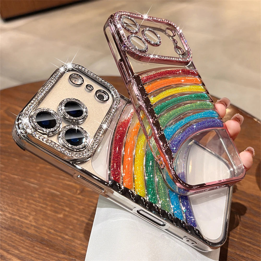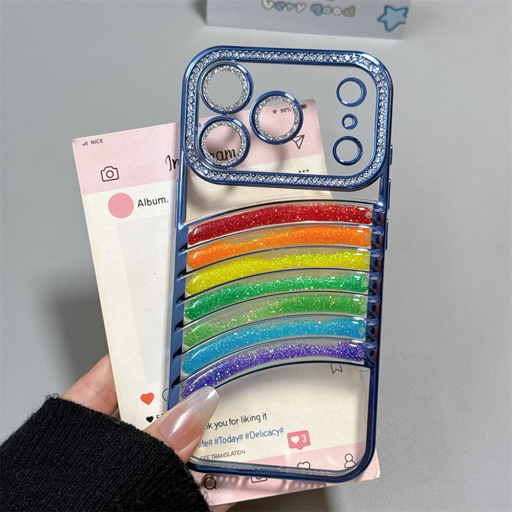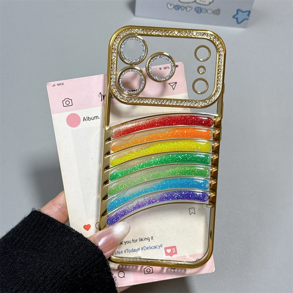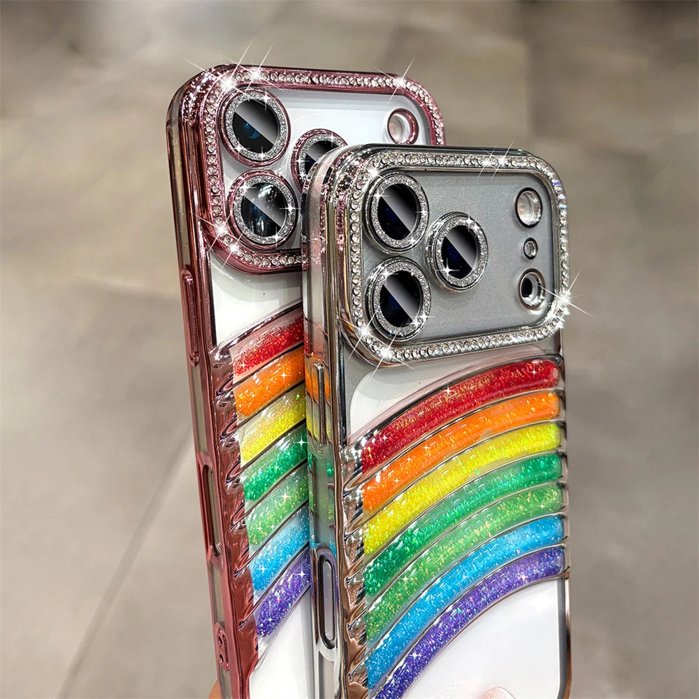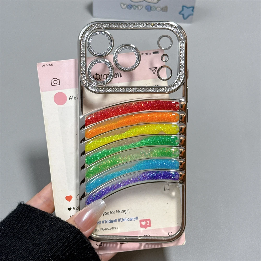 鮮やかなレインボーアーチと、縁まで輝くストーンフレームが特徴の映えケース。
