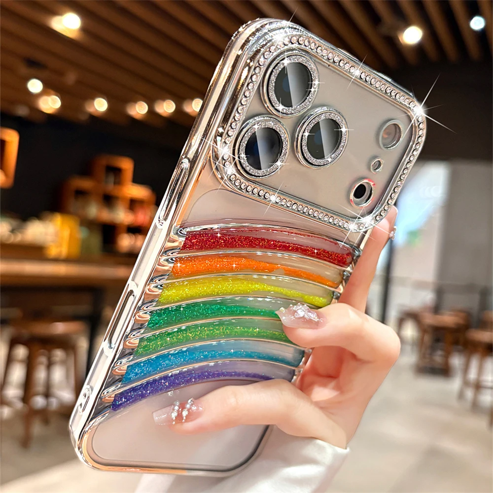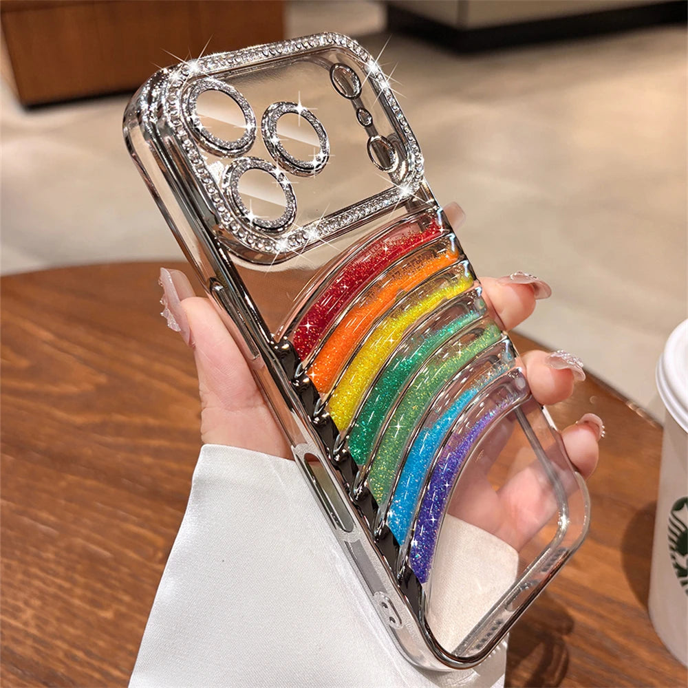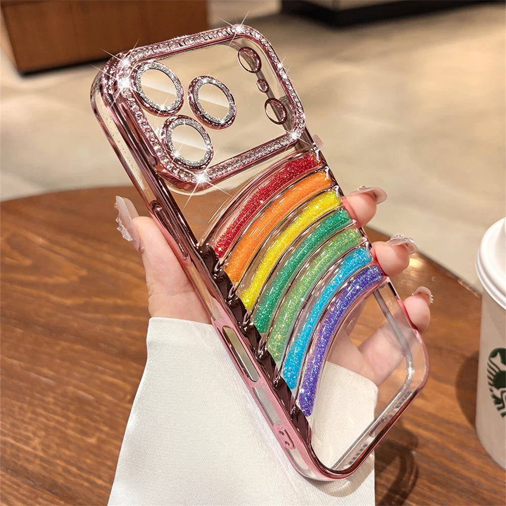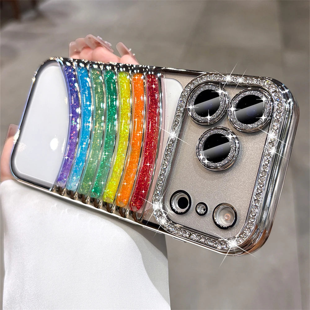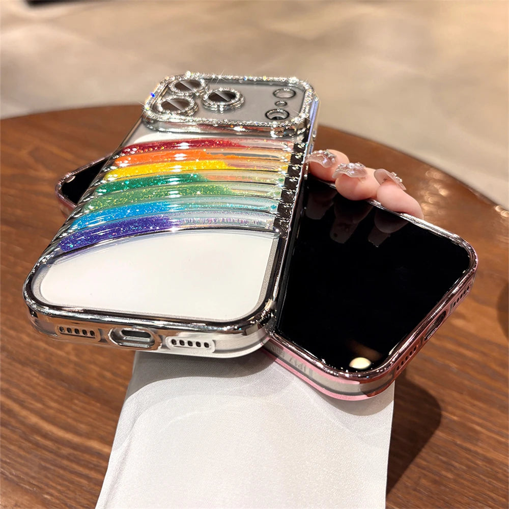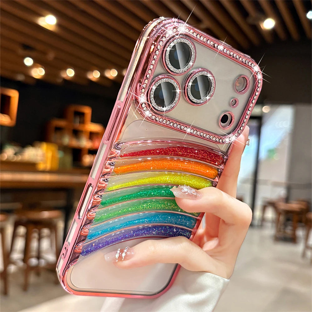 鮮やかなレインボーアーチと、縁まで輝くストーンフレームが特徴の映えケース。