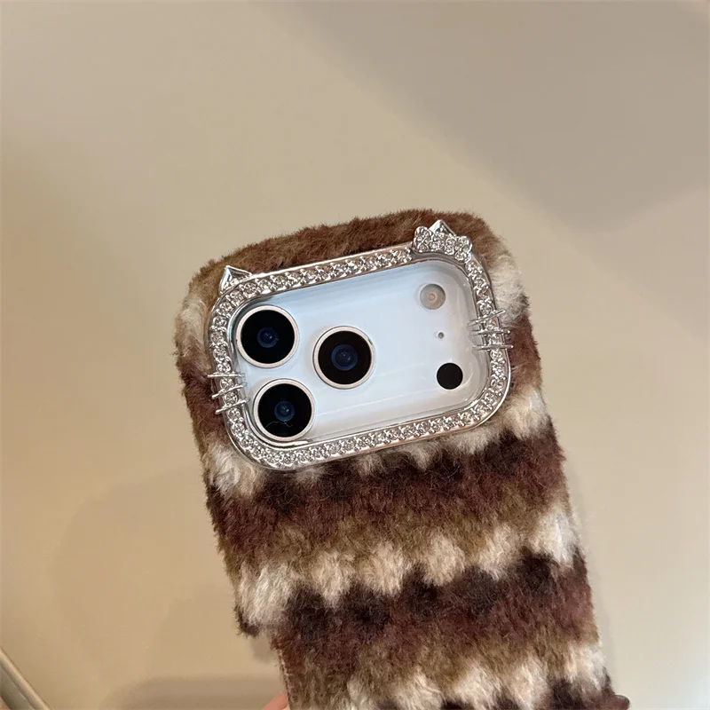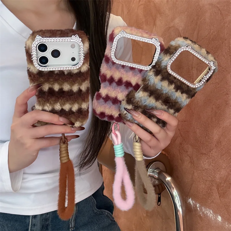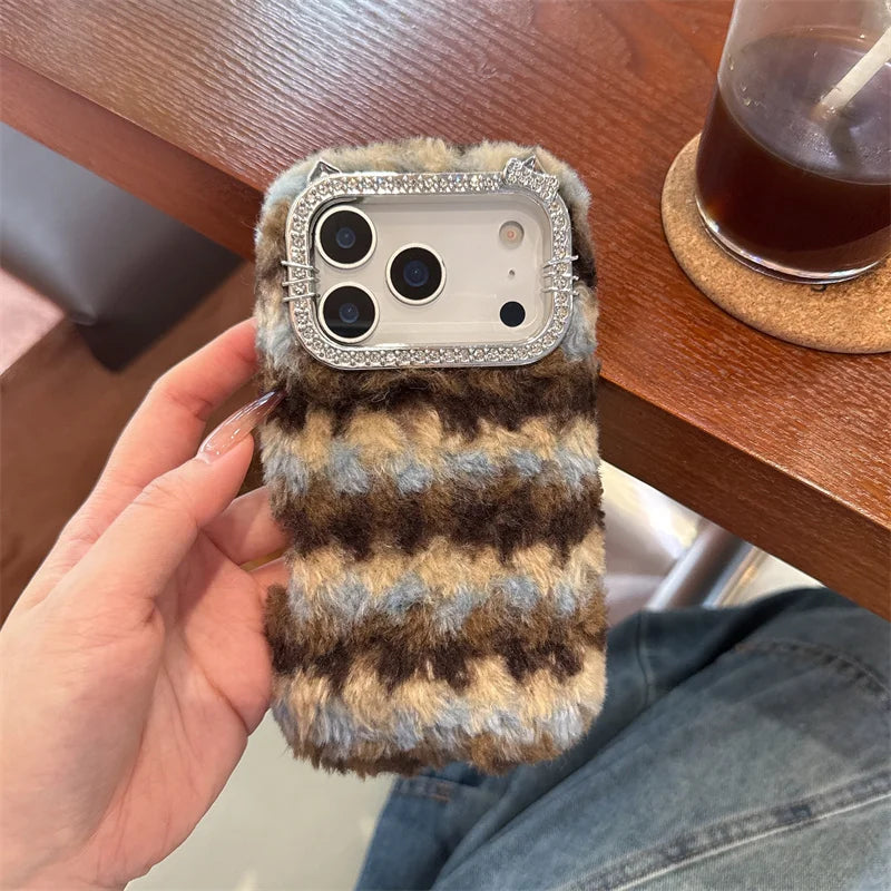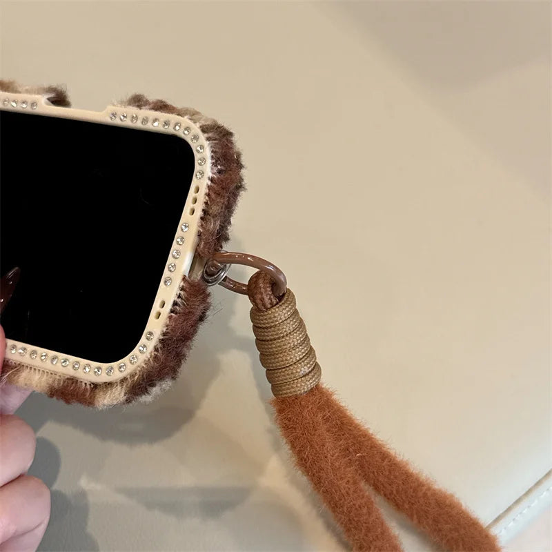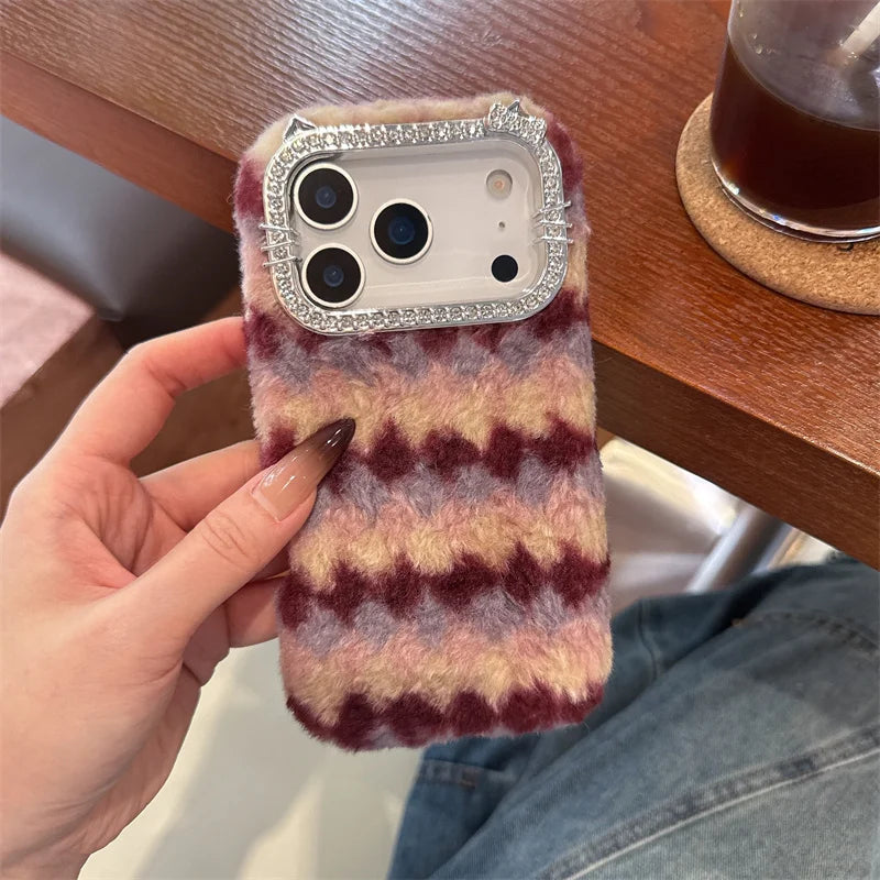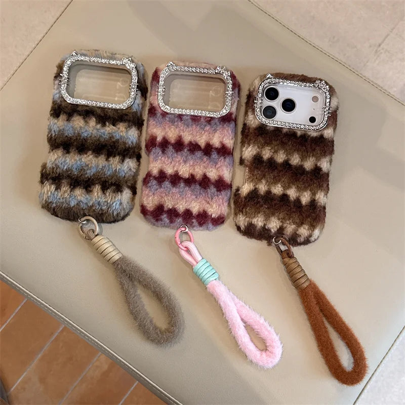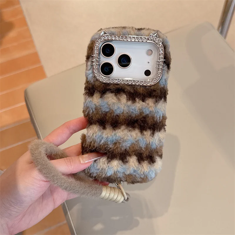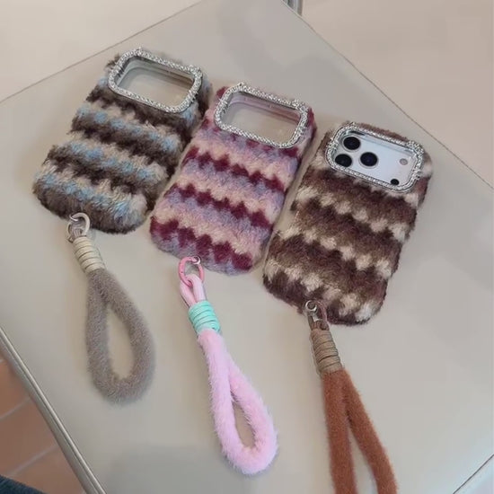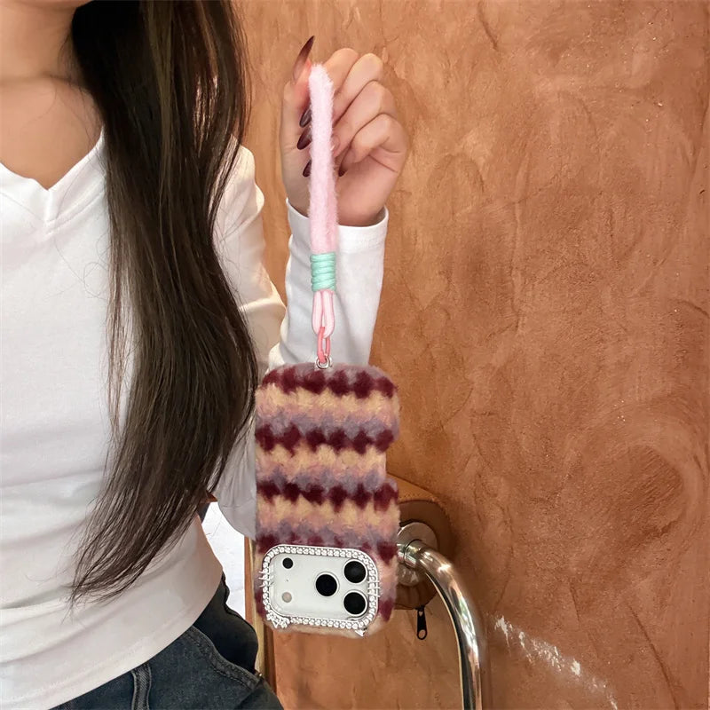 【もこもこチェック】ふわふわ マルチカラー × ストラップ付きケース|iPhone対応 #240909