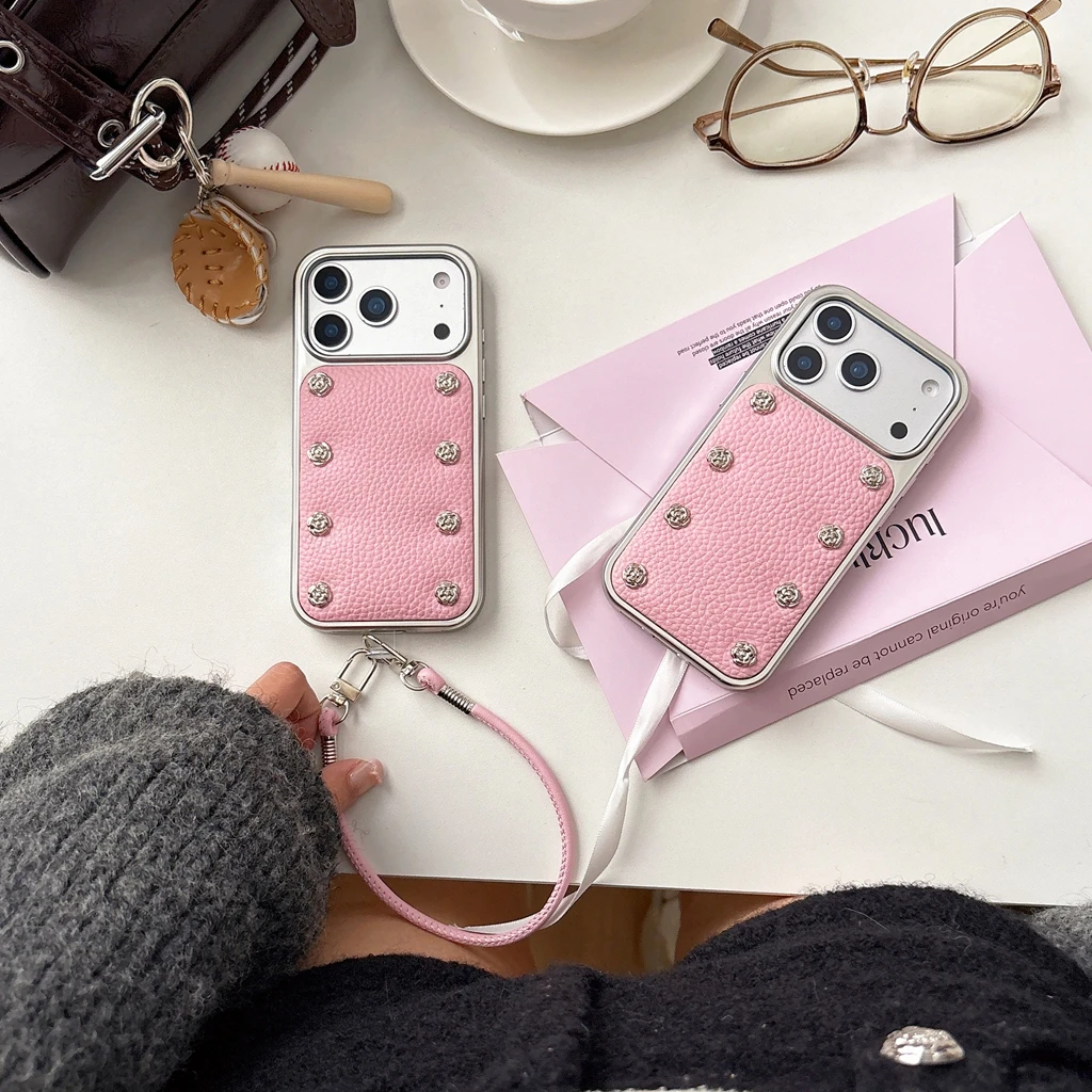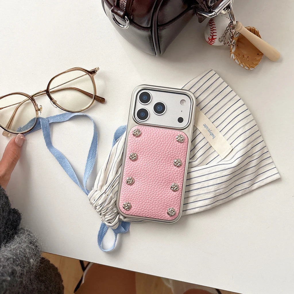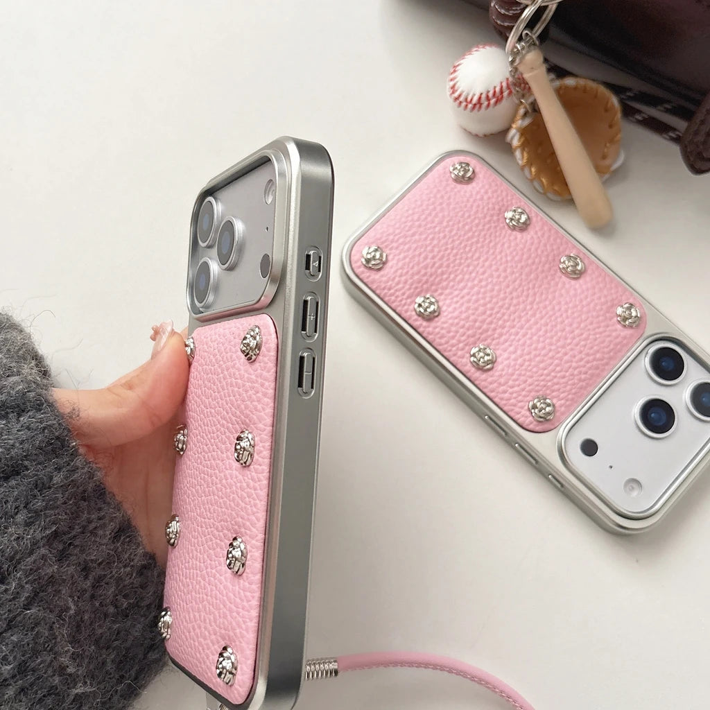 【ローズスタッズ】シルバーフレーム ピンク レザー風 ストラップ付き ケース|iPhone対応 #240924
