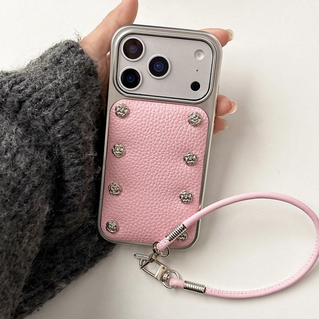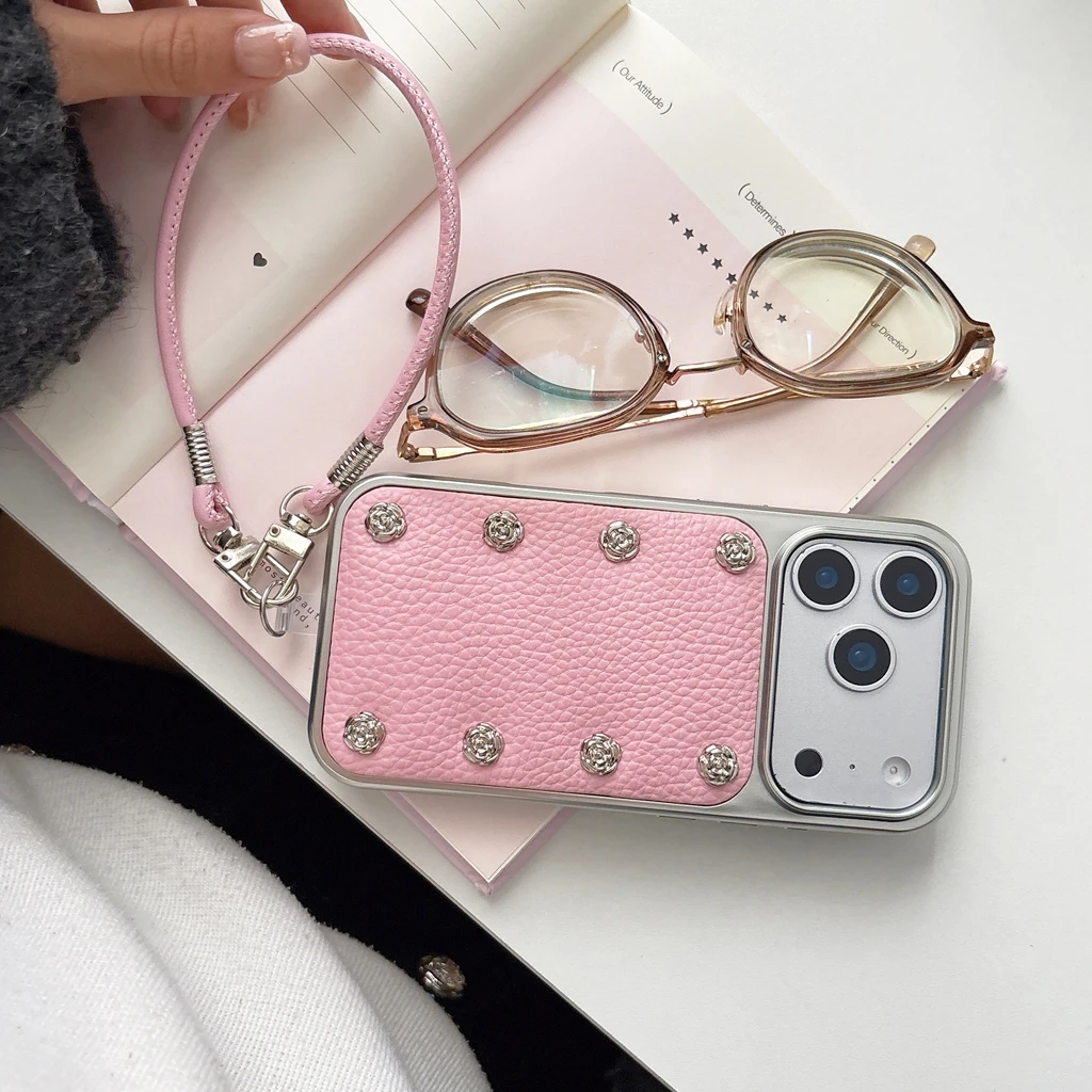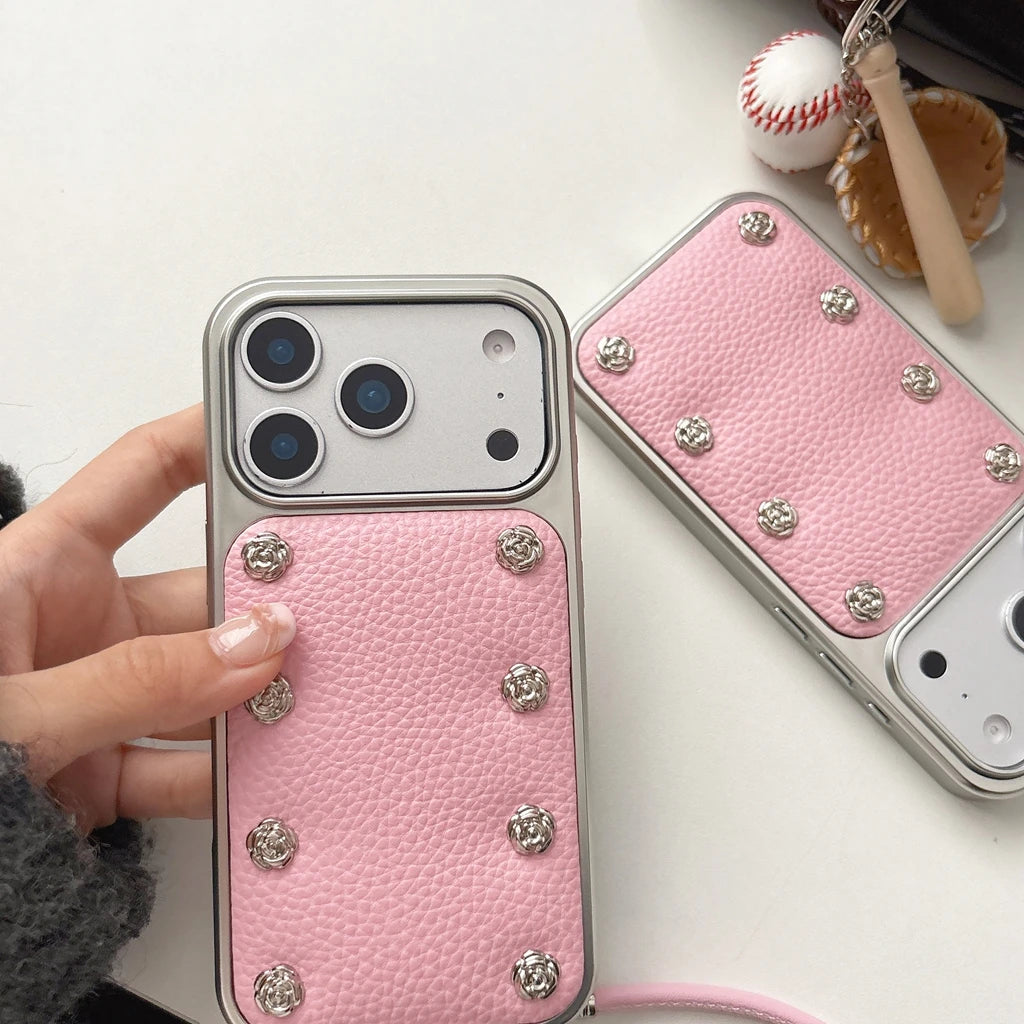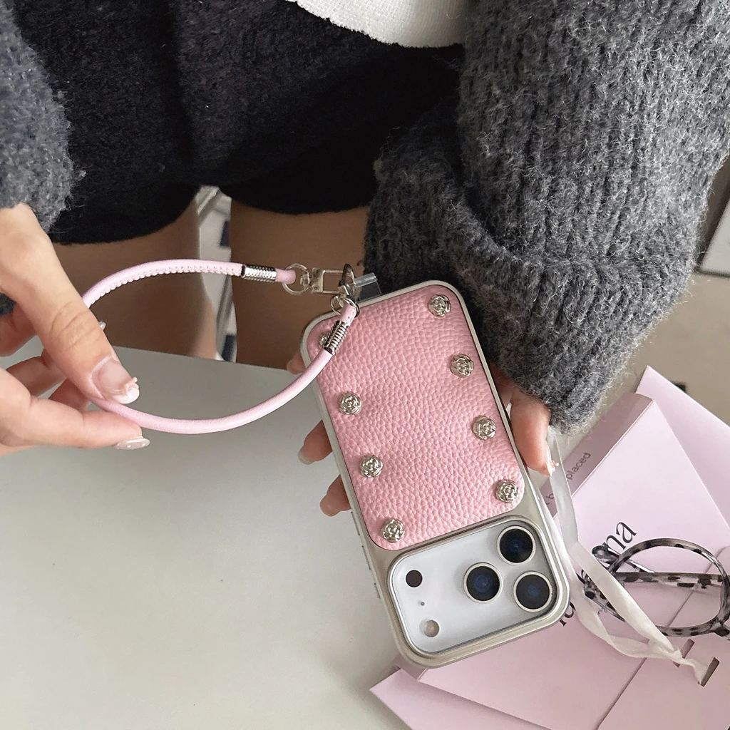 【ローズスタッズ】シルバーフレーム ピンク レザー風 ストラップ付き ケース|iPhone対応 #240924