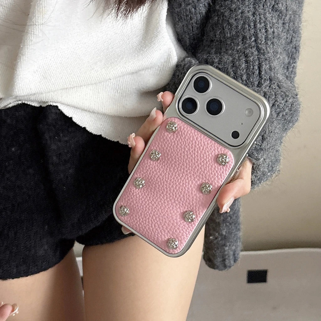 上品なレザー風素材に、ローズのシルバースタッズを贅沢に散りばめた大人ガーリーケース。
