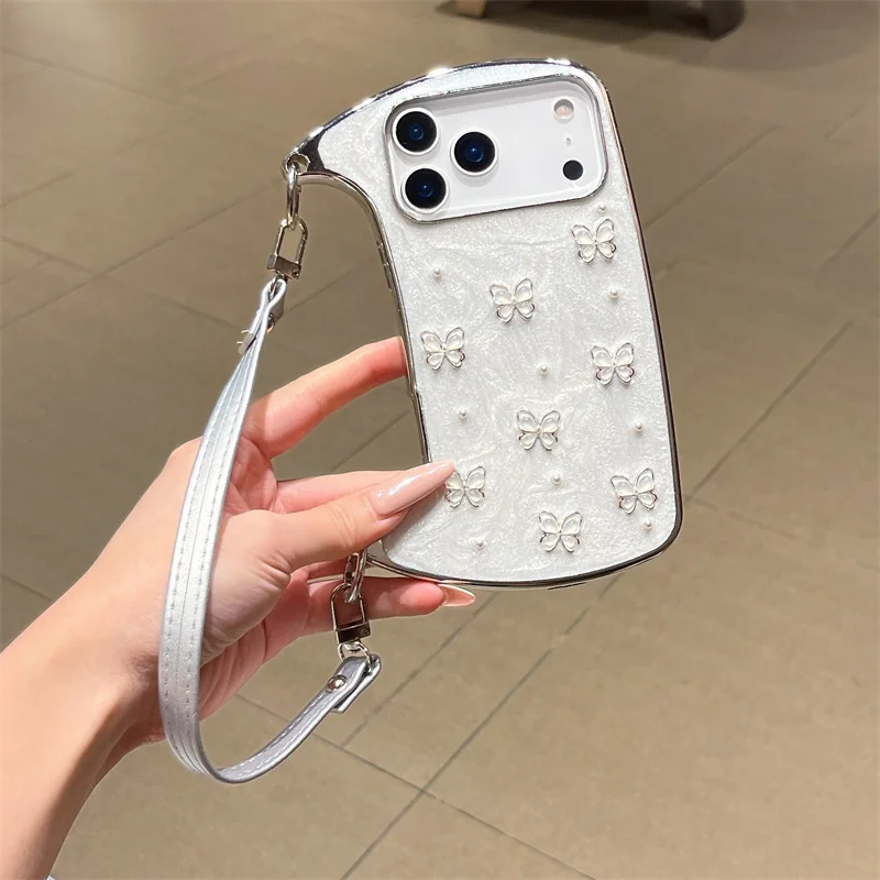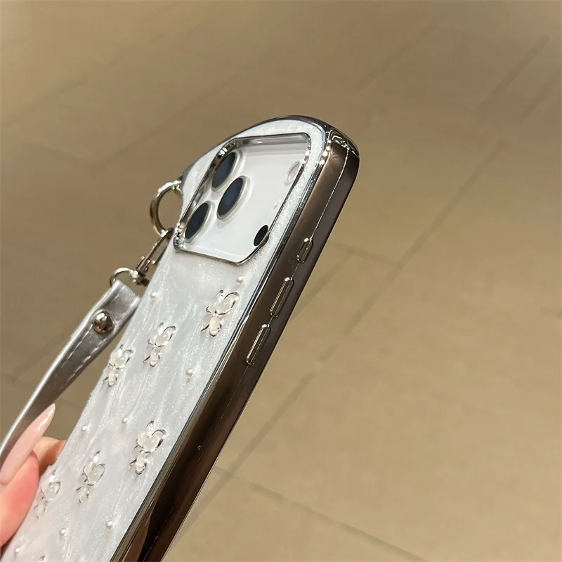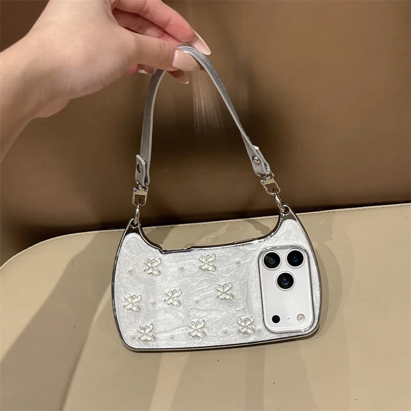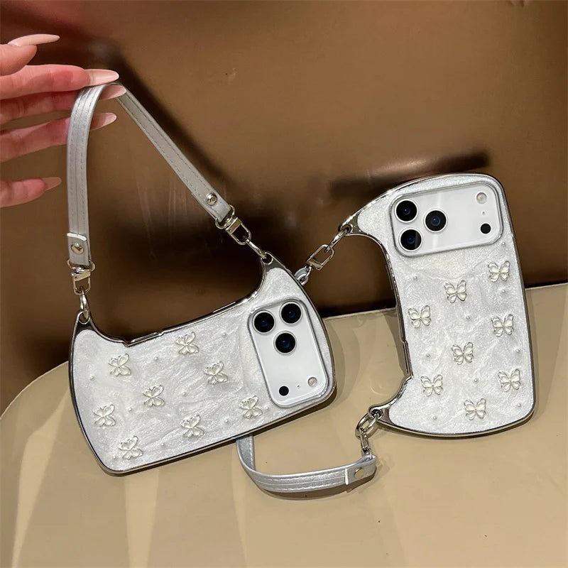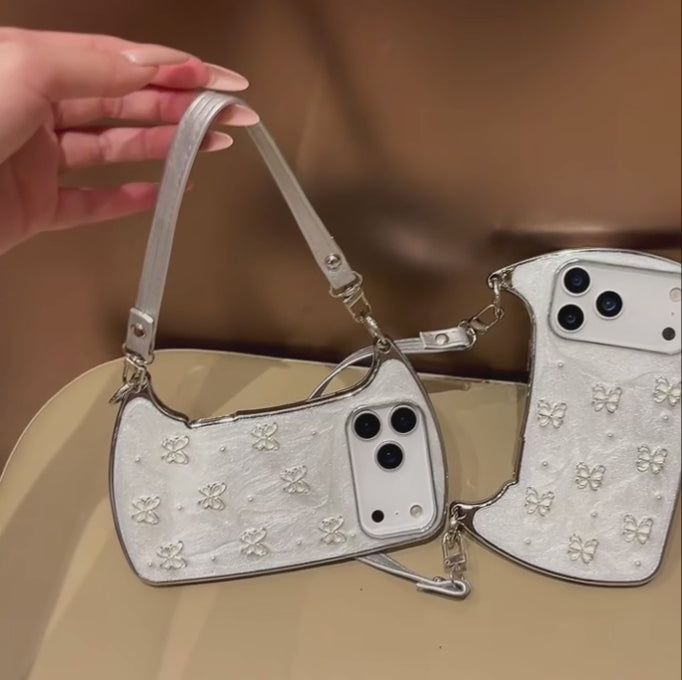 【ショルダーバッグ型 】ストラップ付き パールバタフライ スマホケース|iPhone対応 #241001