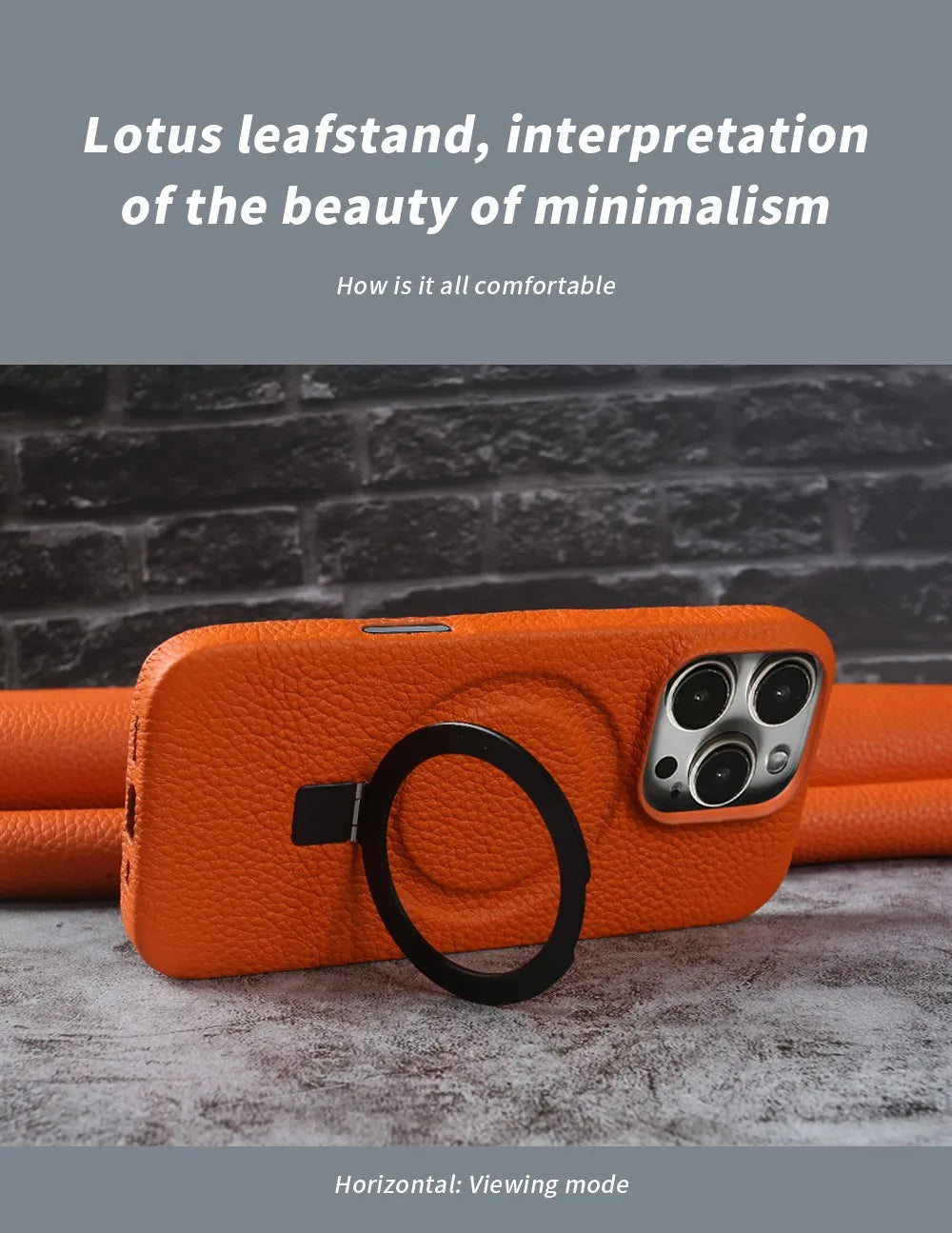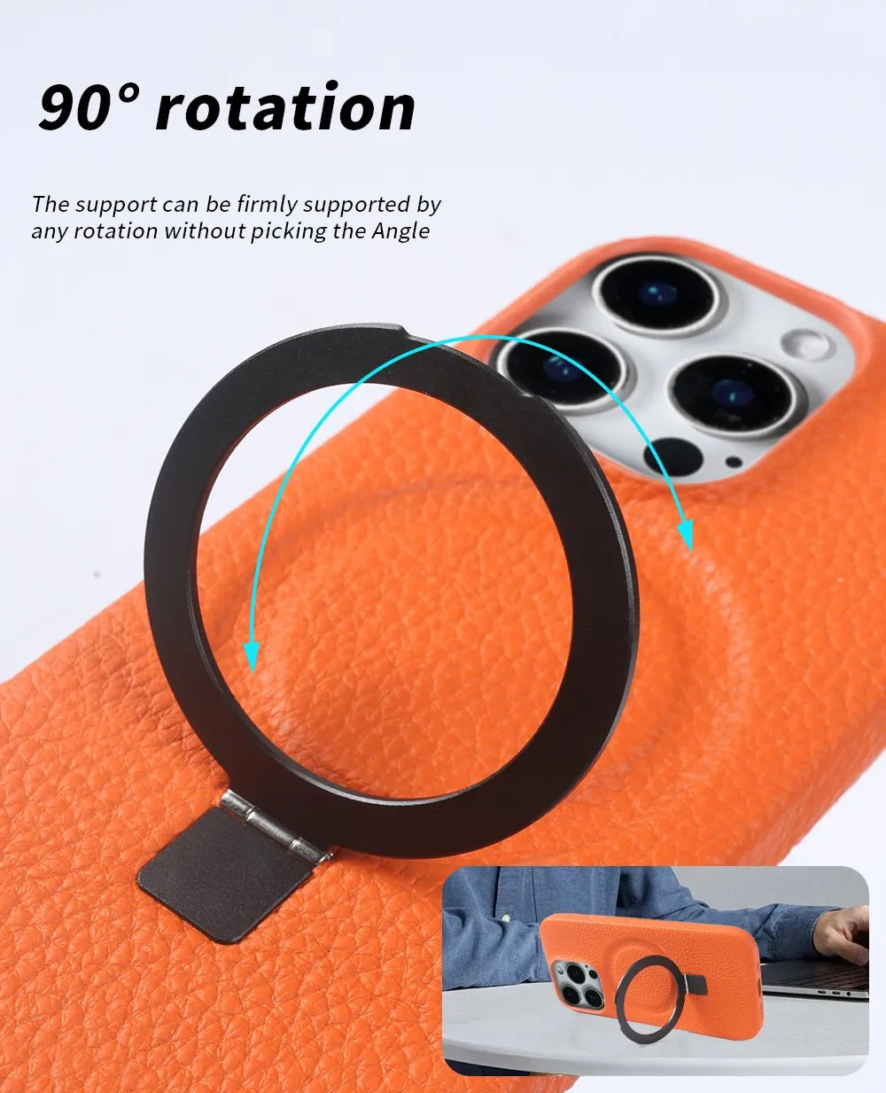 スムーズに立てかけられる“スタンドリング”を背面に搭載した、本革スマホケース。