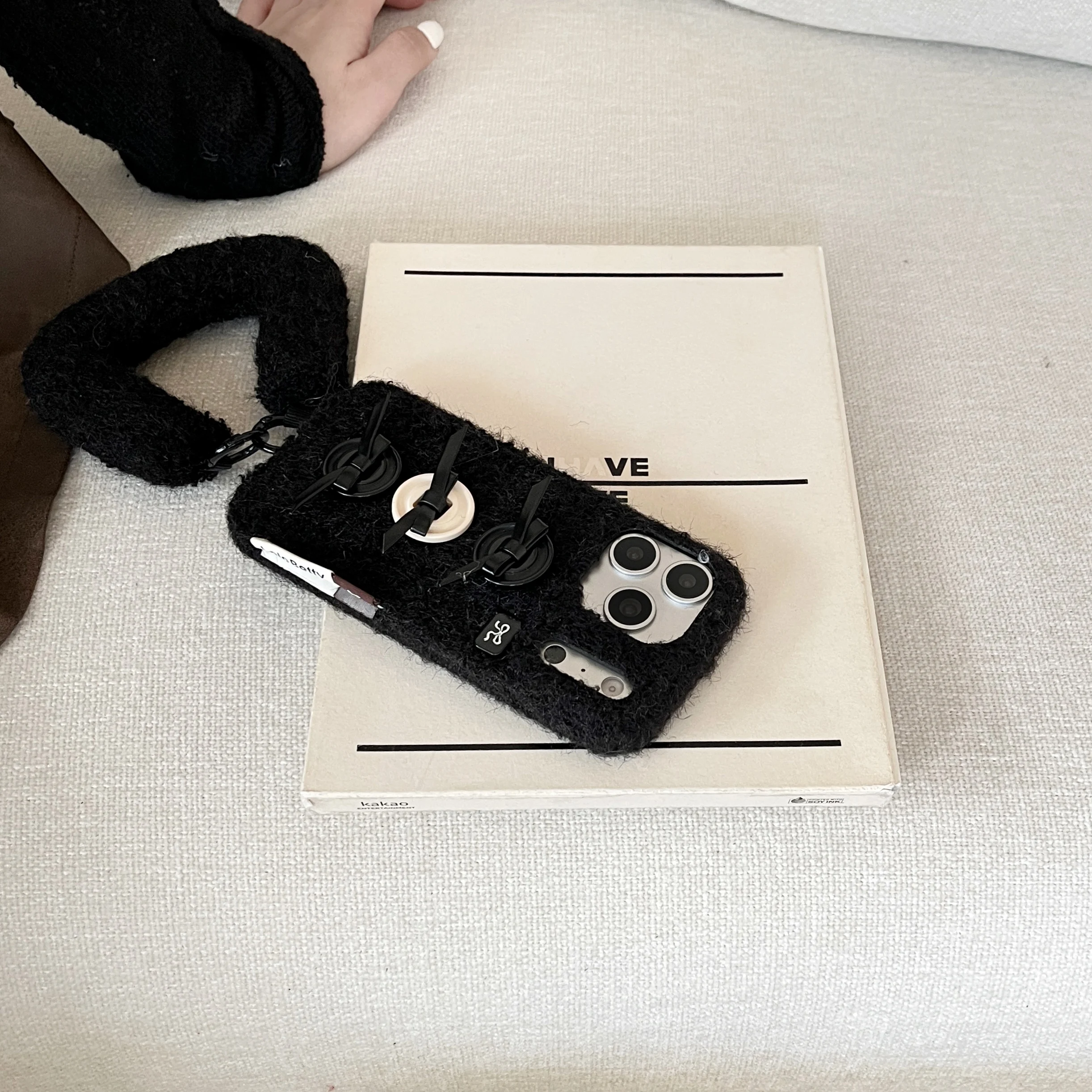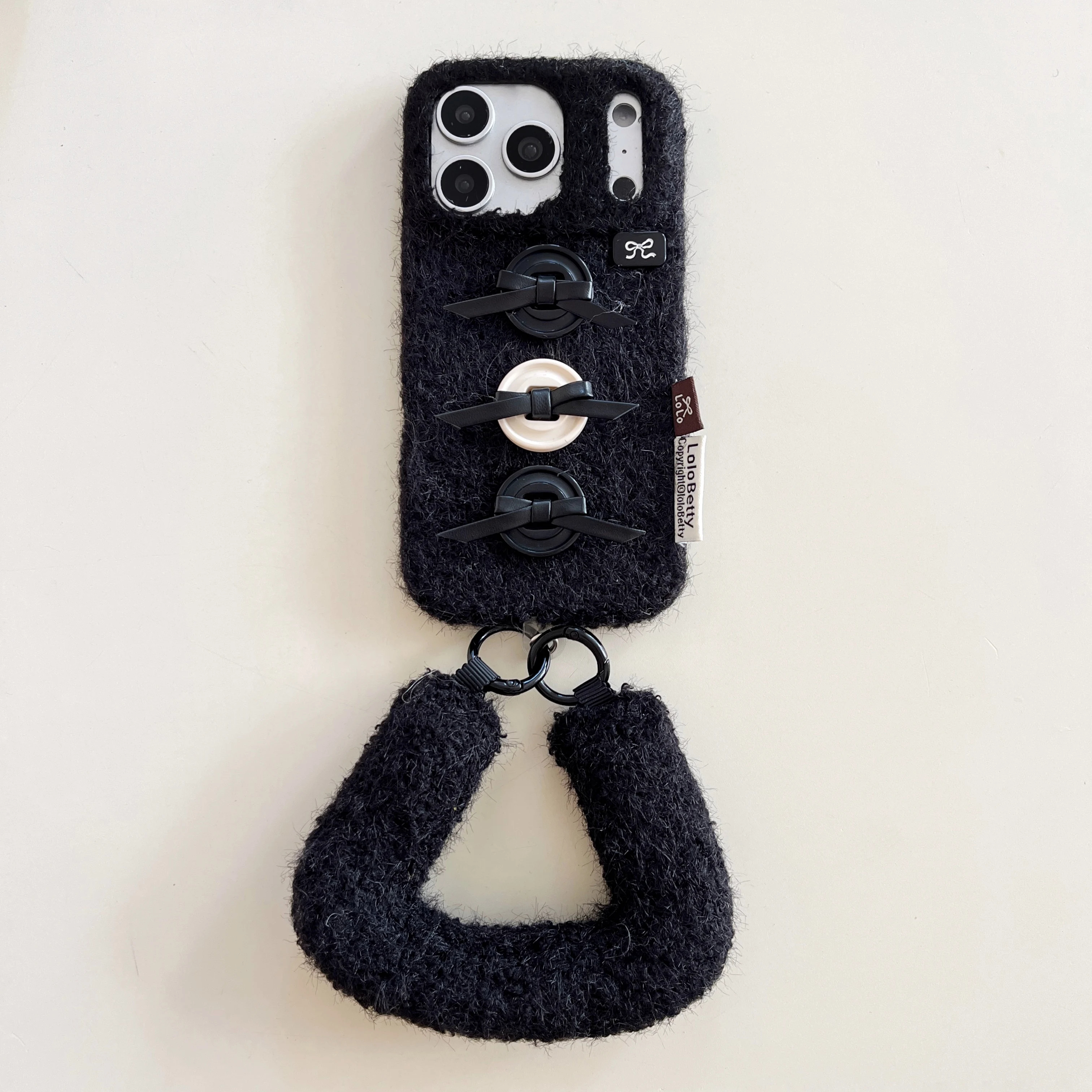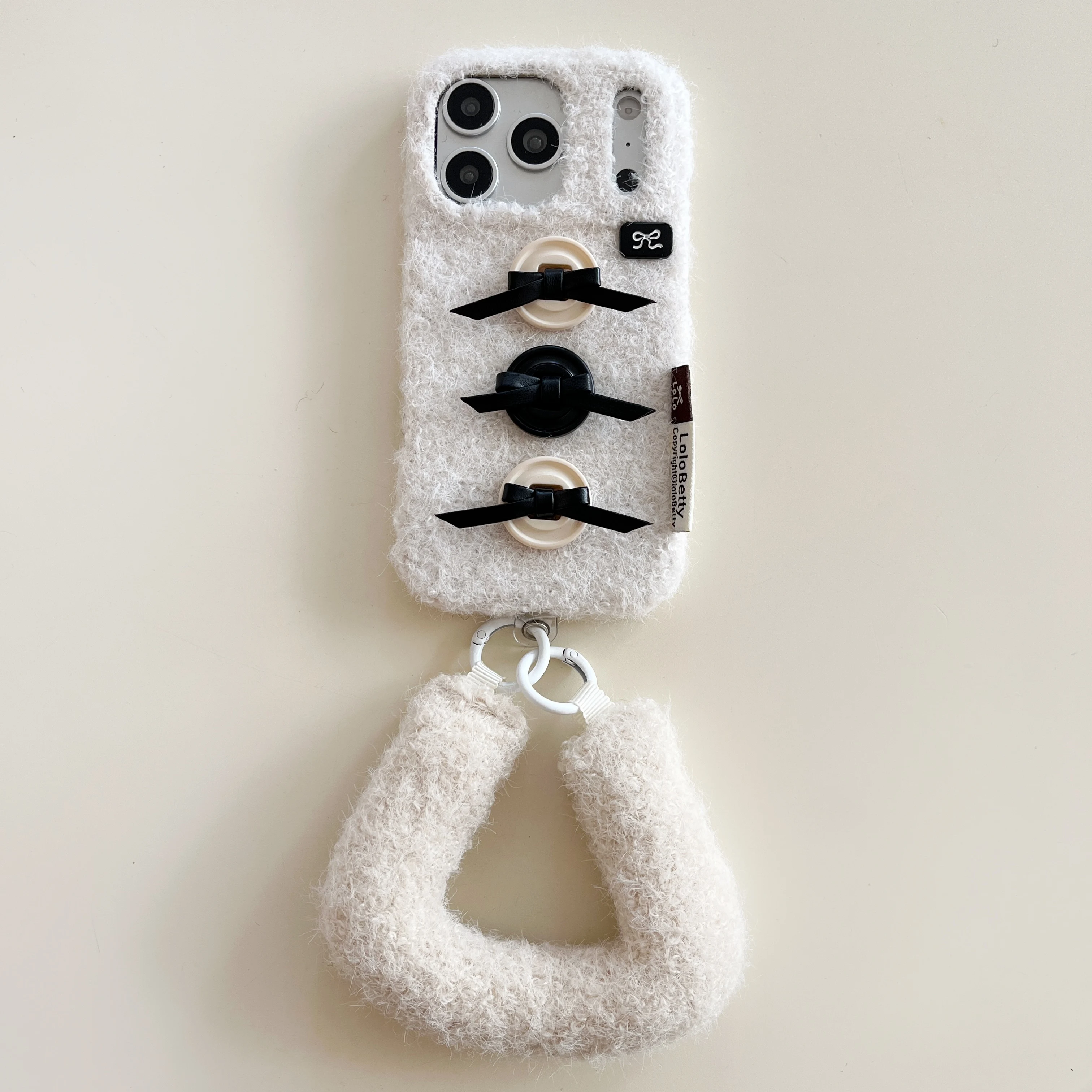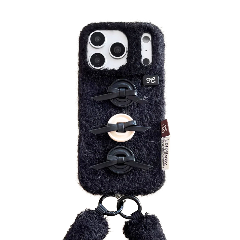 【もこもこファーシリーズ】ふわふわボア素材 リボンボタン ハンドストラップ付き スマホケース|iPhone対応 #241211