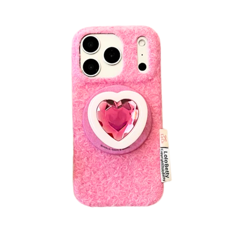 【Magnet内蔵】立体ハートジュエルポップソケット × もこもこファー スマホケース|iPhone対応 #241214