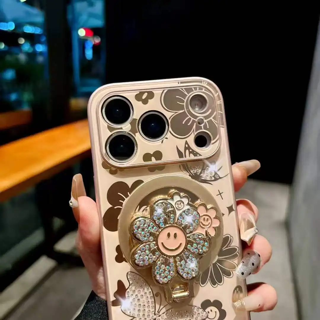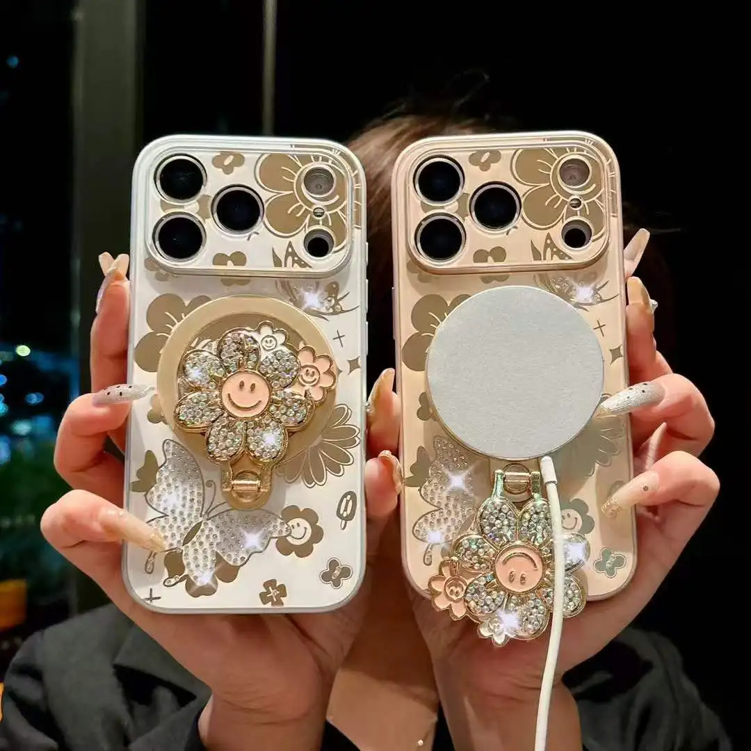 【フラワーシリーズ】キラキラ立体スマイルフラワー&バタフライ デザインスマホケース|iPhone対応 #251211