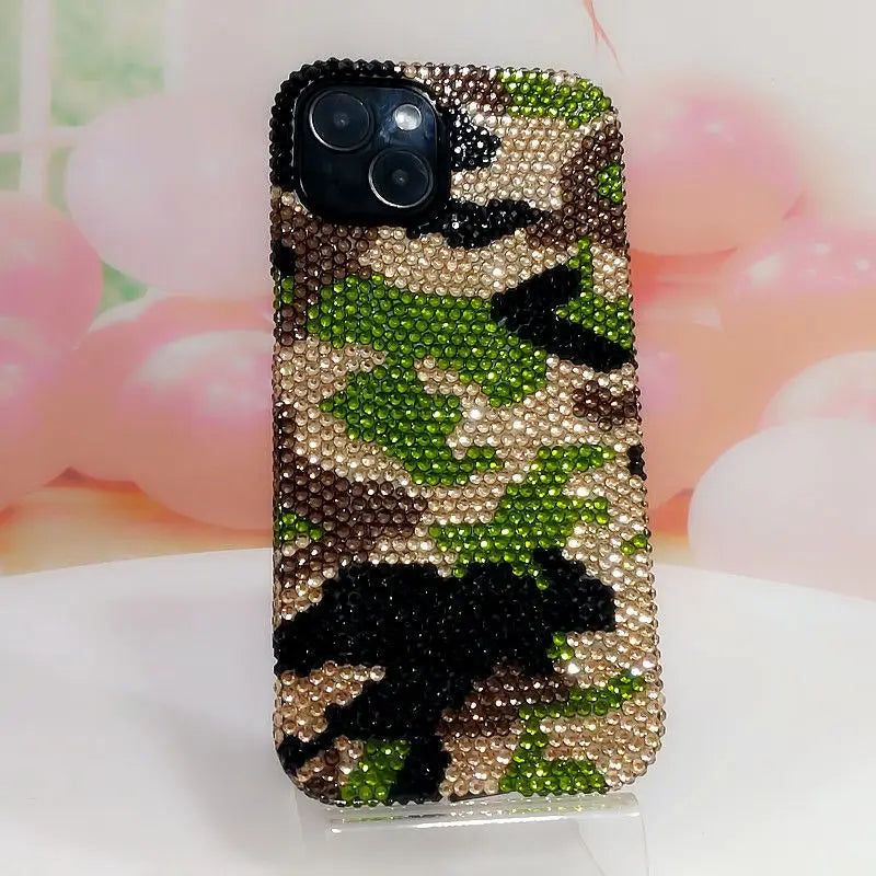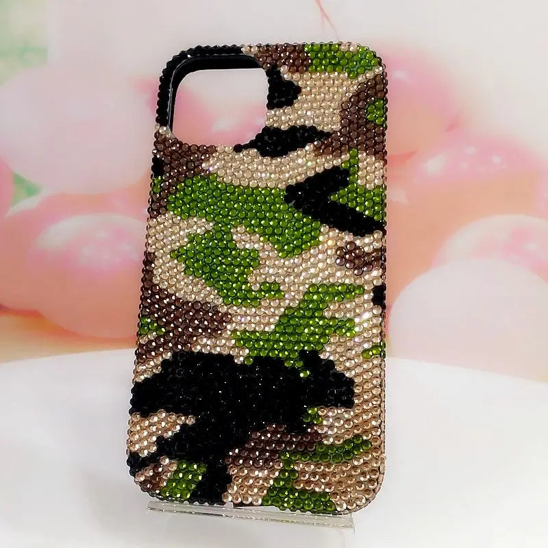 【キラキラビジューシリーズ】カモフラージュ 迷彩柄 フルラインストーン デコ スマホケース|iPhone対応 #260121