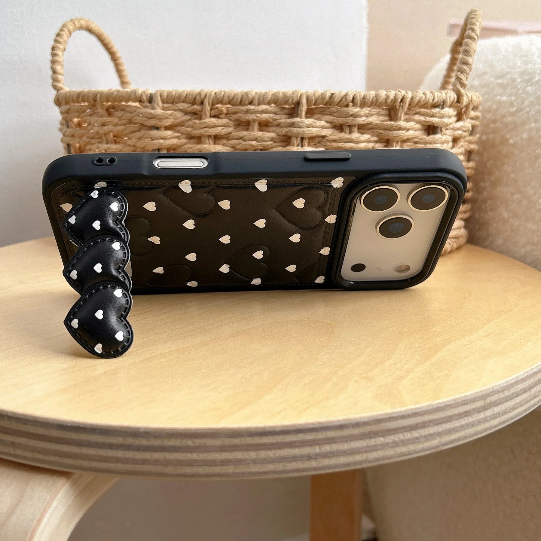 立体的なハートキルティングとクリップスタンドが特徴のスマホケース。