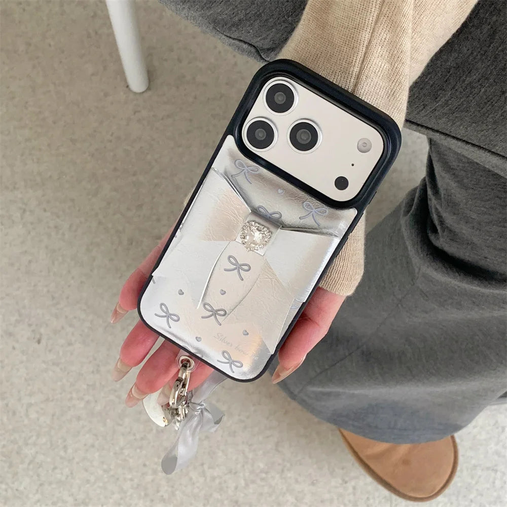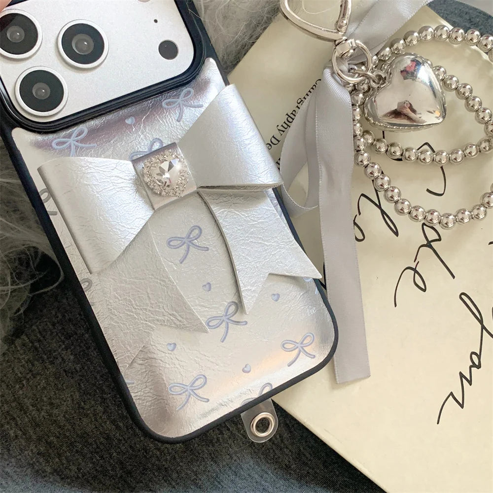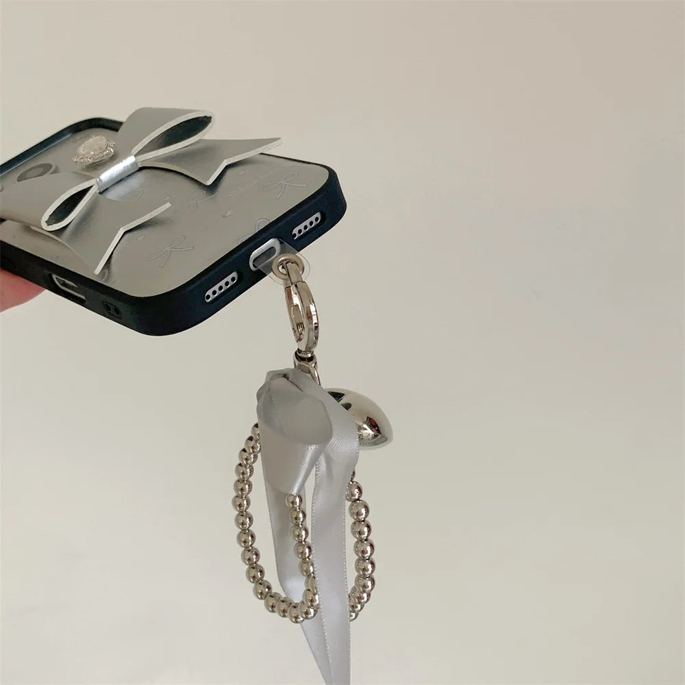 【シルバー立体リボン】ボールストラップ付き フェミニン スマホケース|iPhone対応 #260206